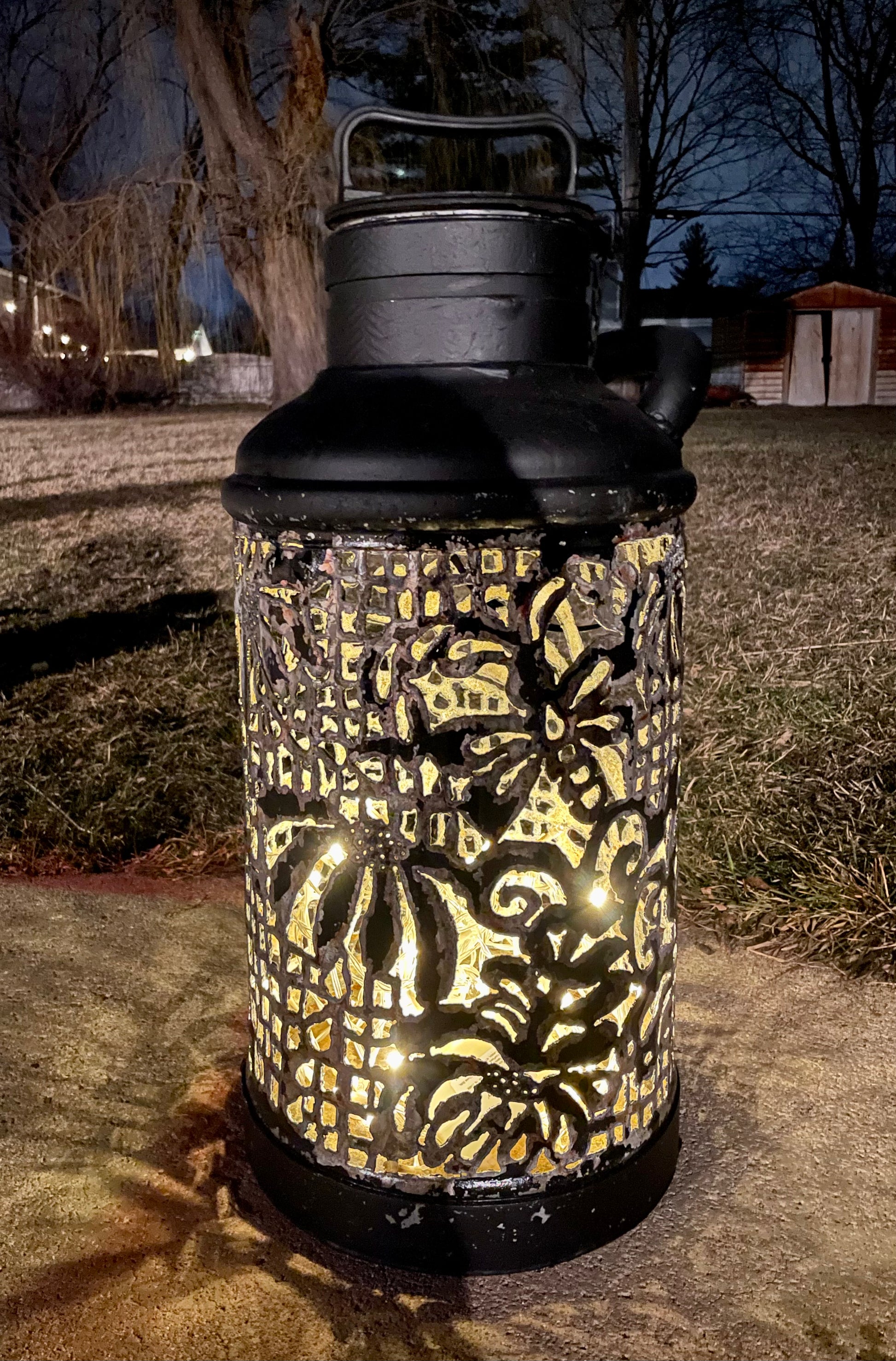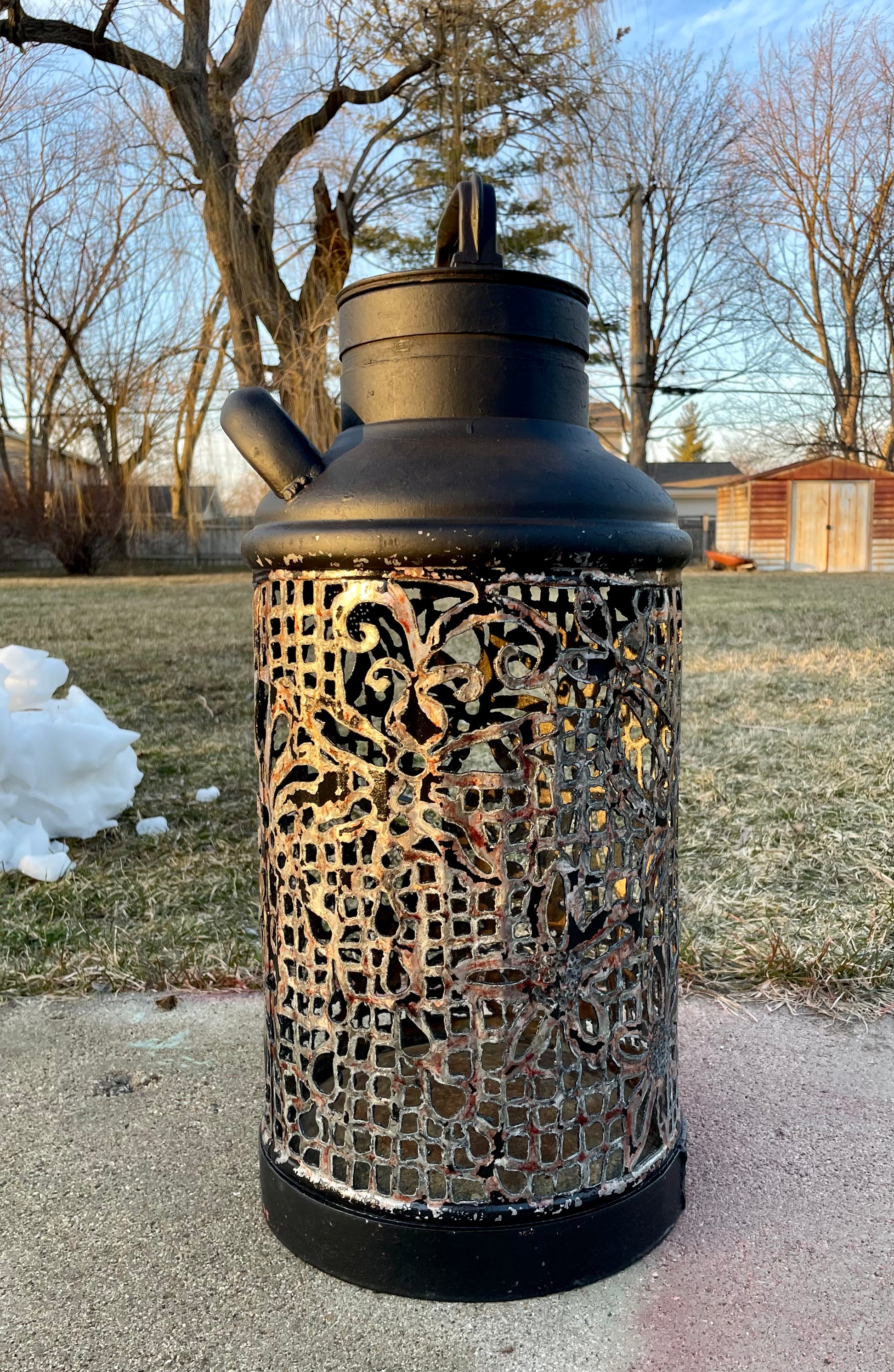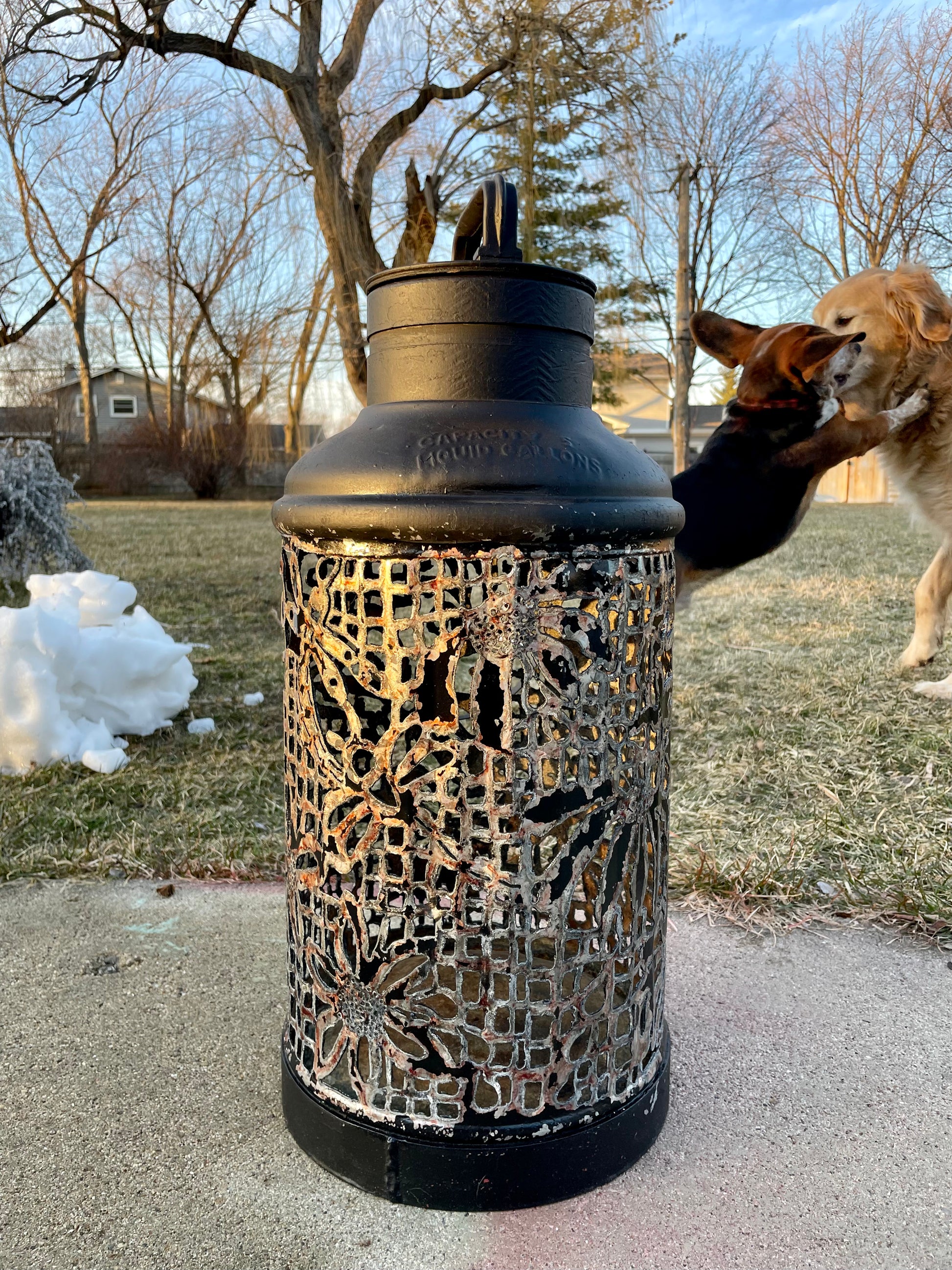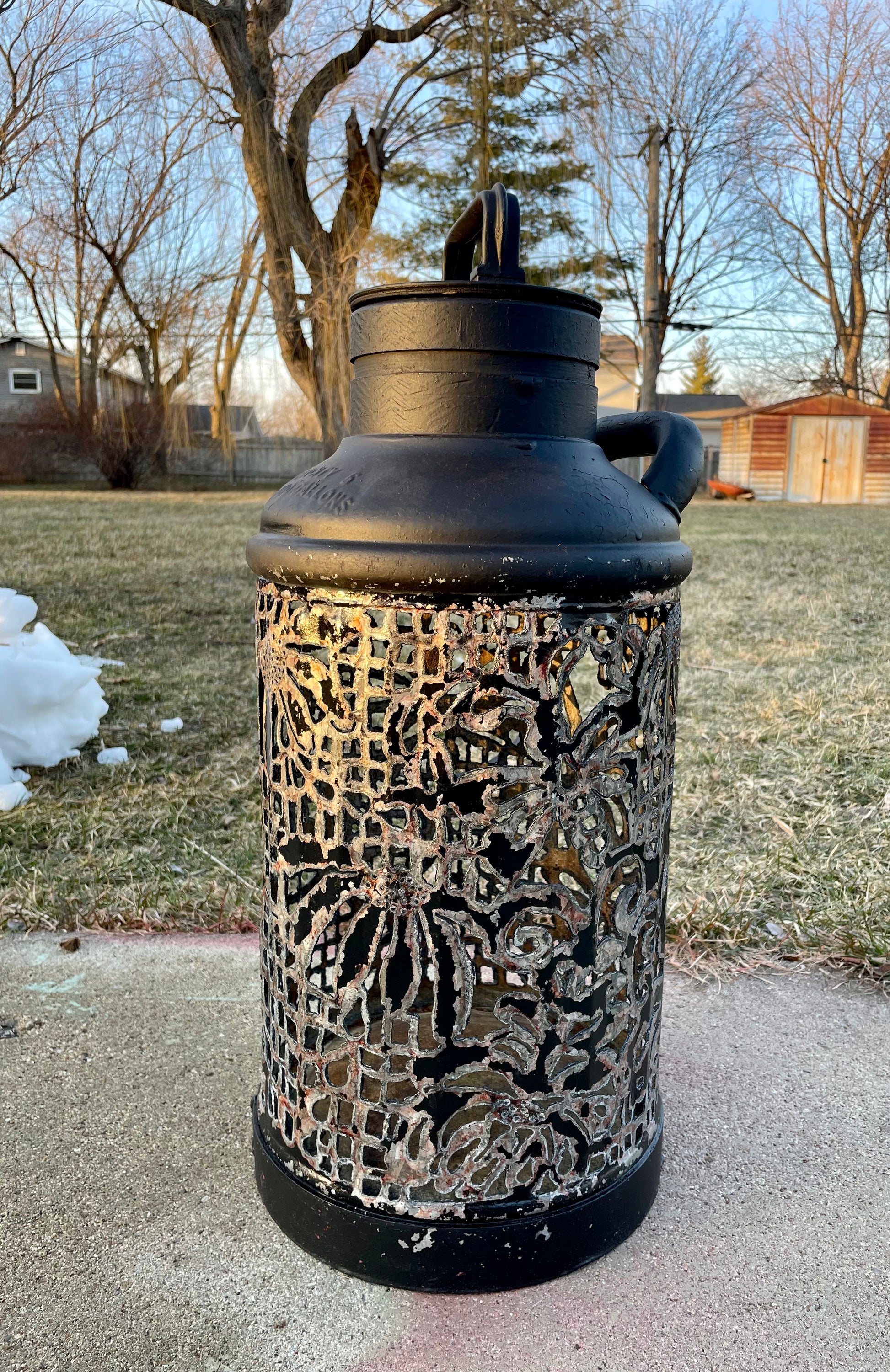 1920s fluted 5-gallon oil can, hand cut with an intricate design. The top and bottom rim have a fresh coat of paint, but the heat from the plasma cutting has exposed the original metal and some red paint in the cut design.