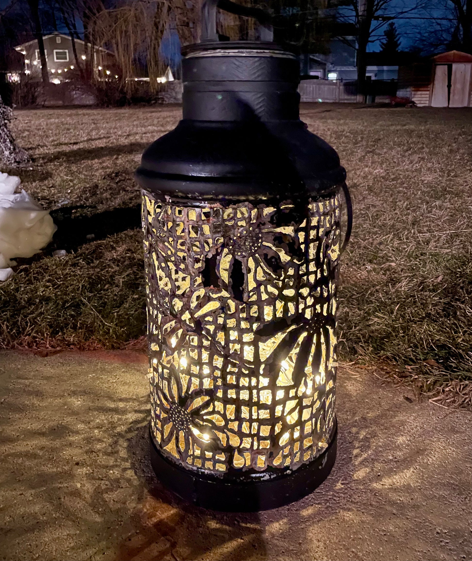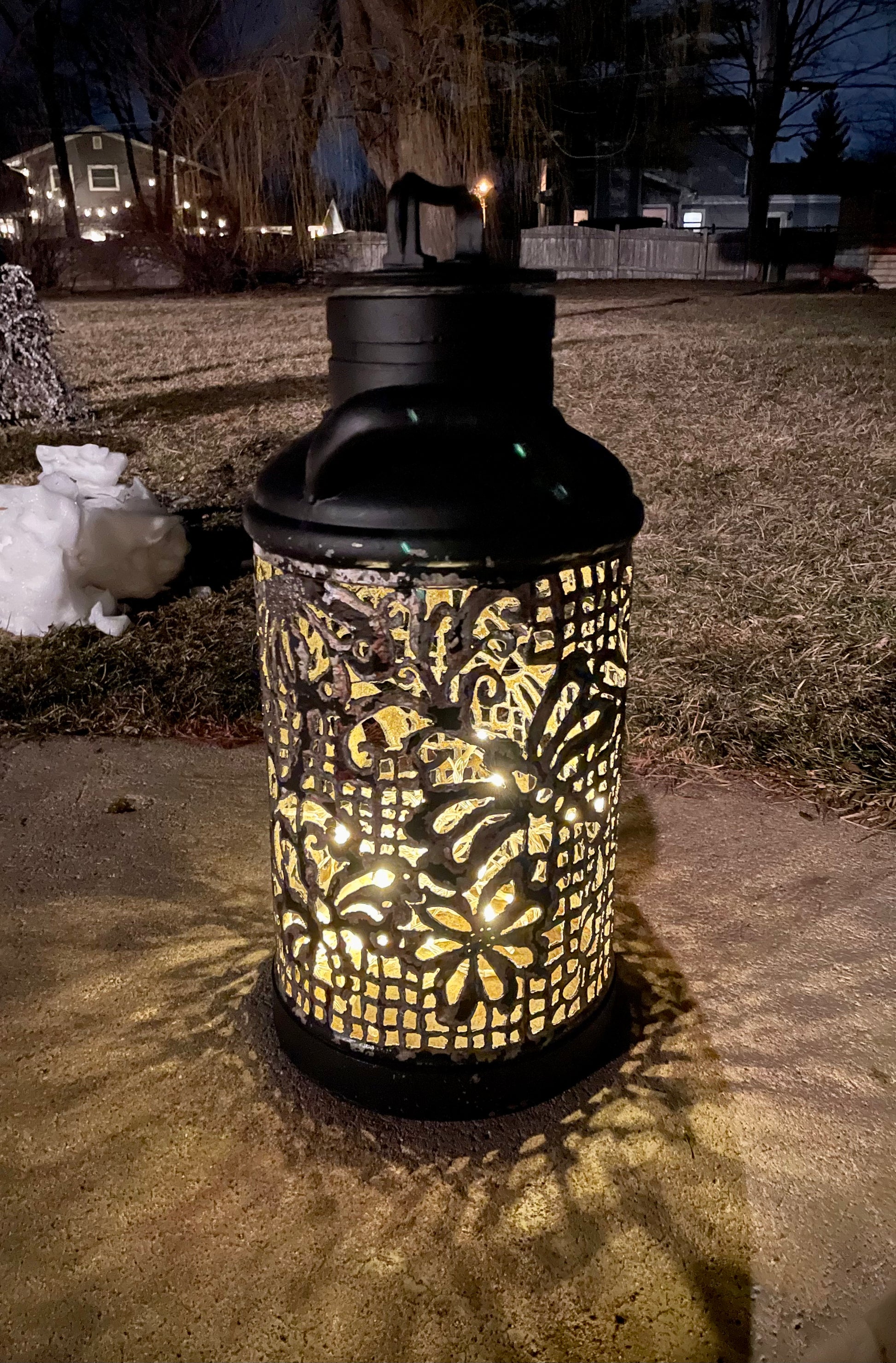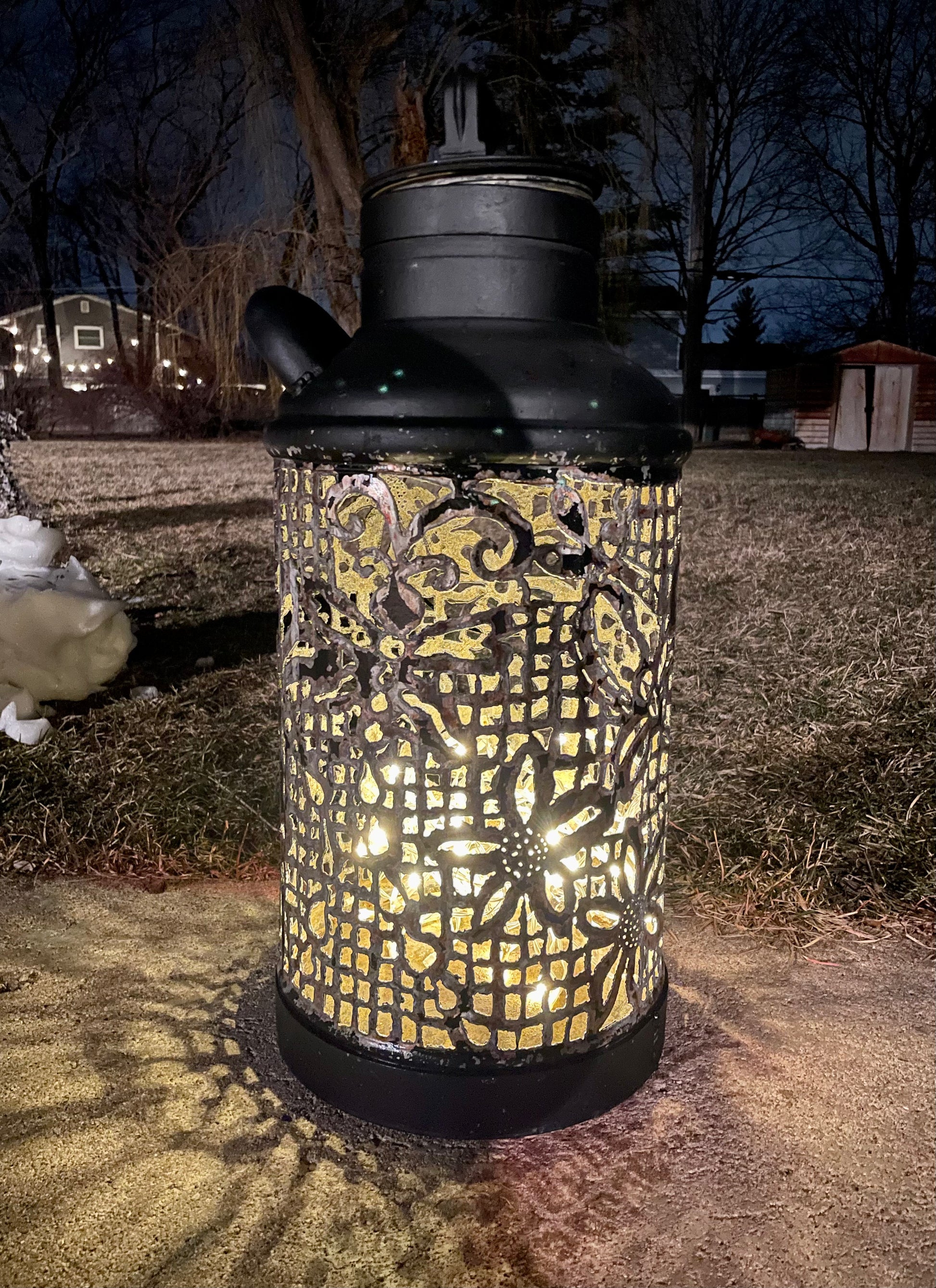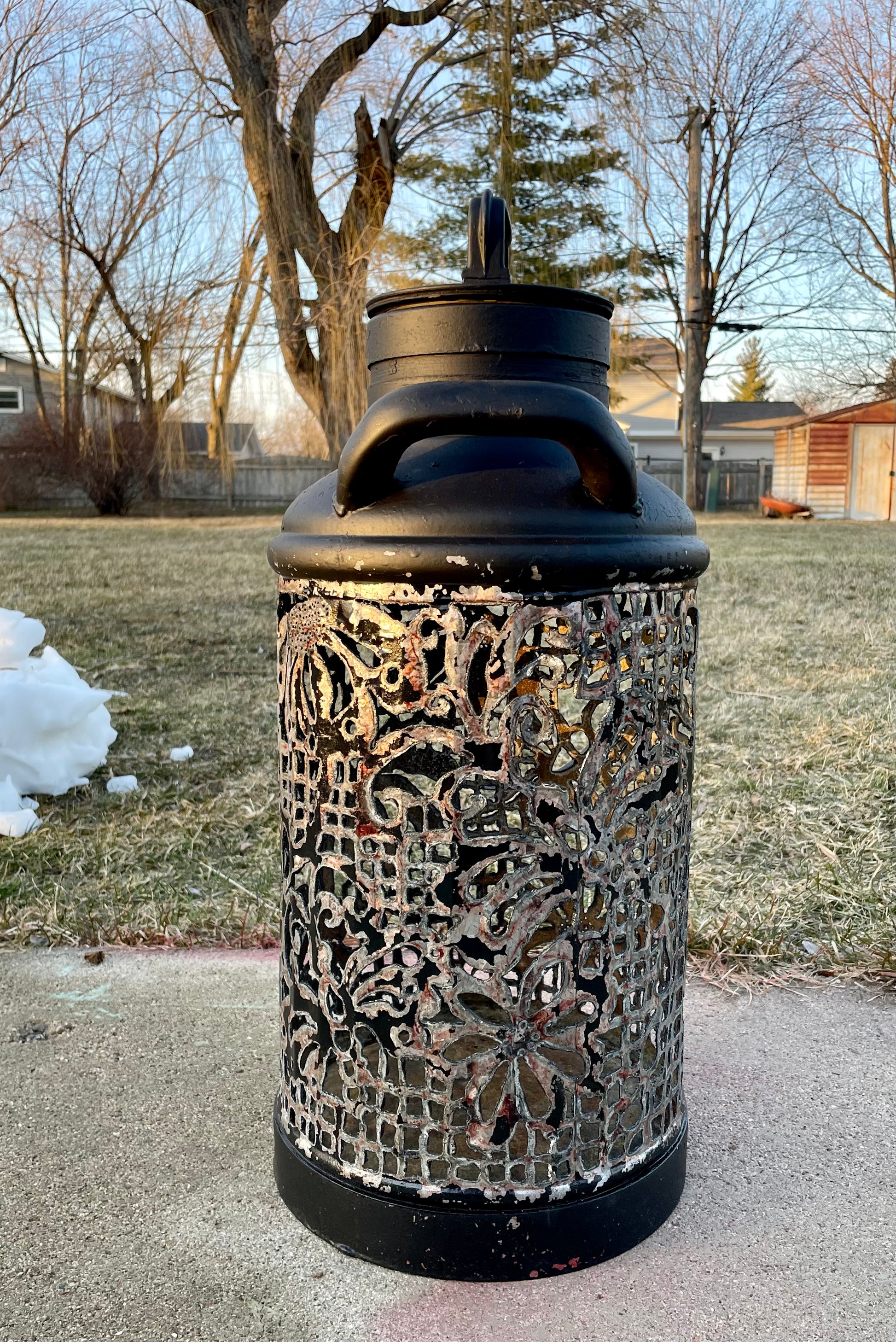 1920s fluted 5-gallon oil can, hand cut with an intricate design. The top and bottom rim have a fresh coat of paint, but the heat from the plasma cutting has exposed the original metal and some red paint in the cut design.