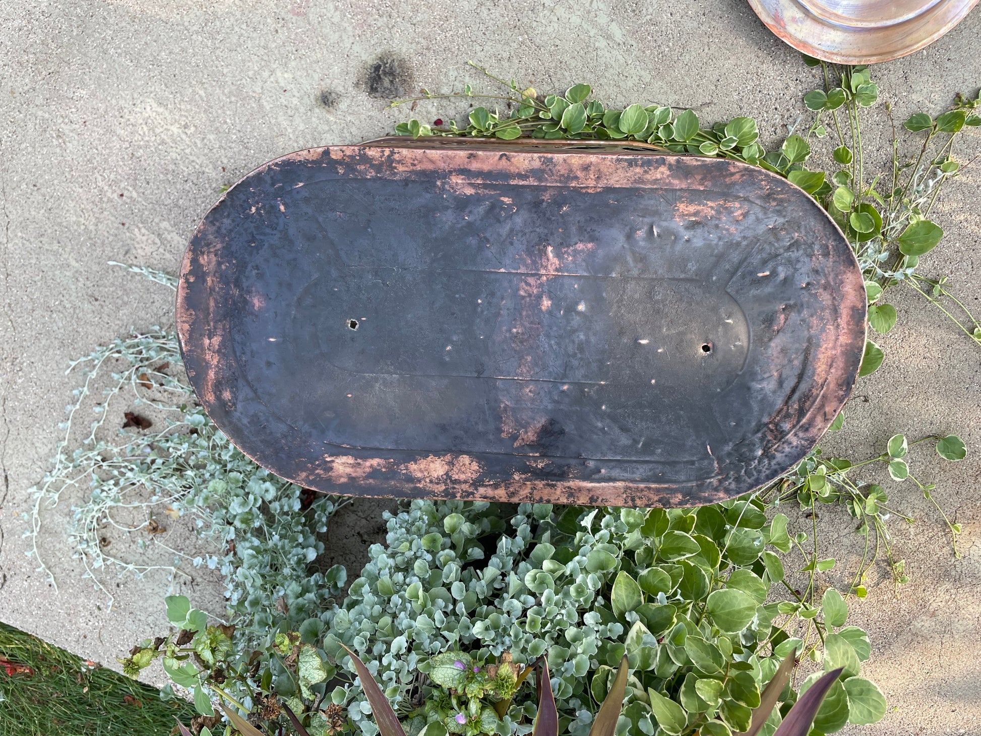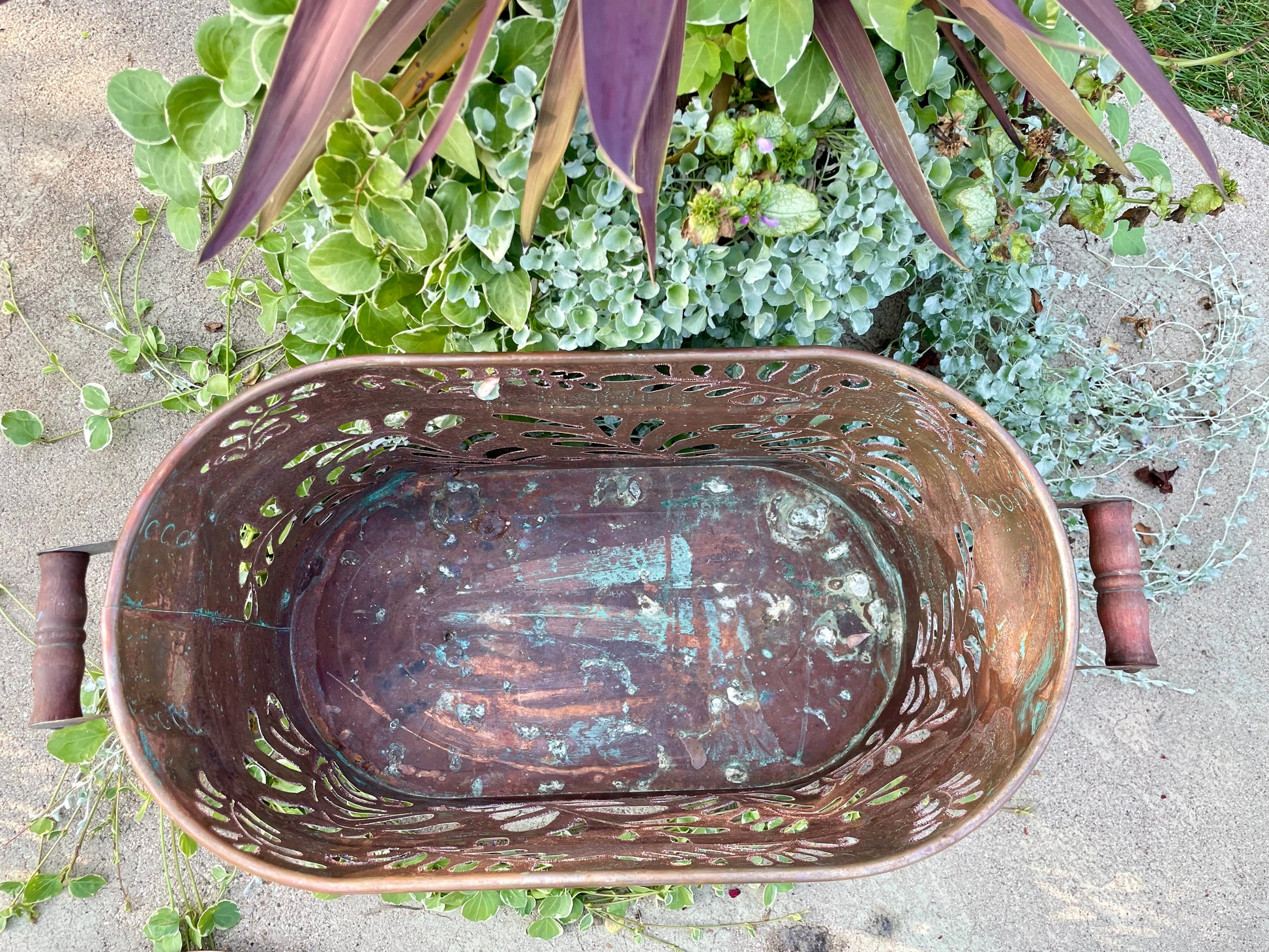The copper has patinaed, on the inside, with various shades of blues and greens while the original copper shows through. There are two holes, in the bottom, made by a previous owner (not due to wear). My guess is that it was used as a planter and the holes were for drainage