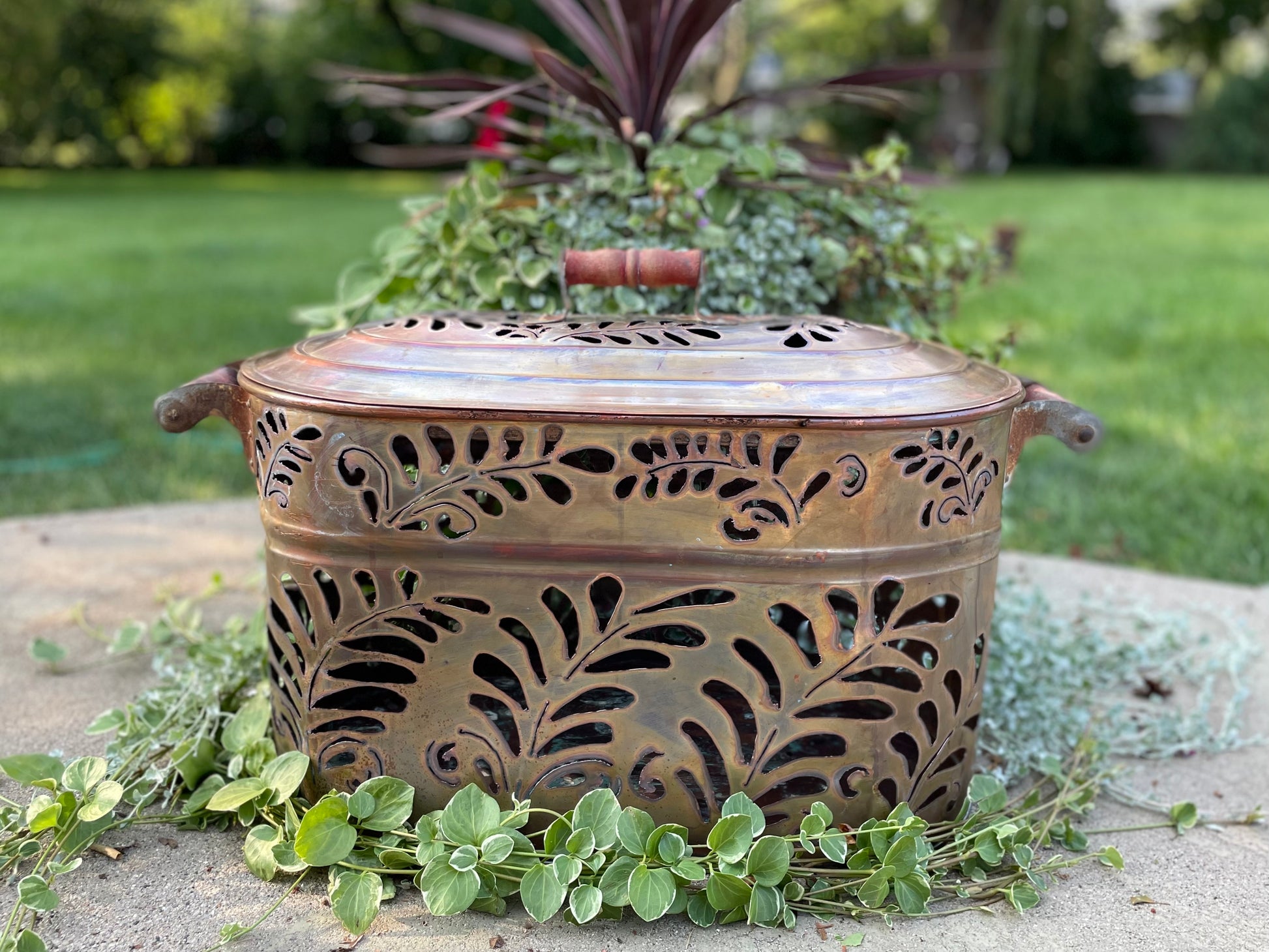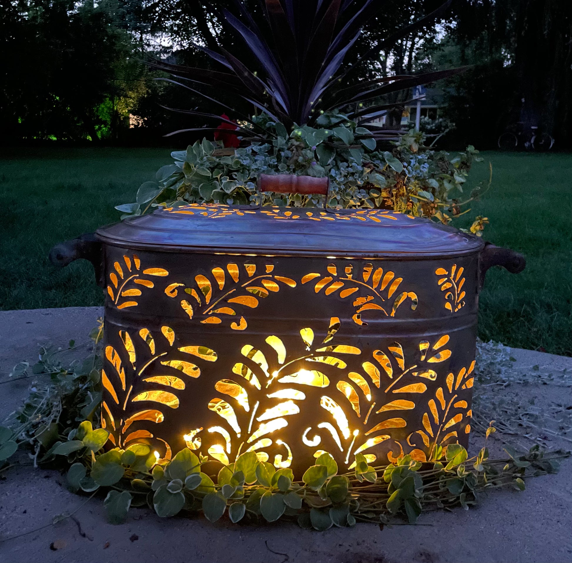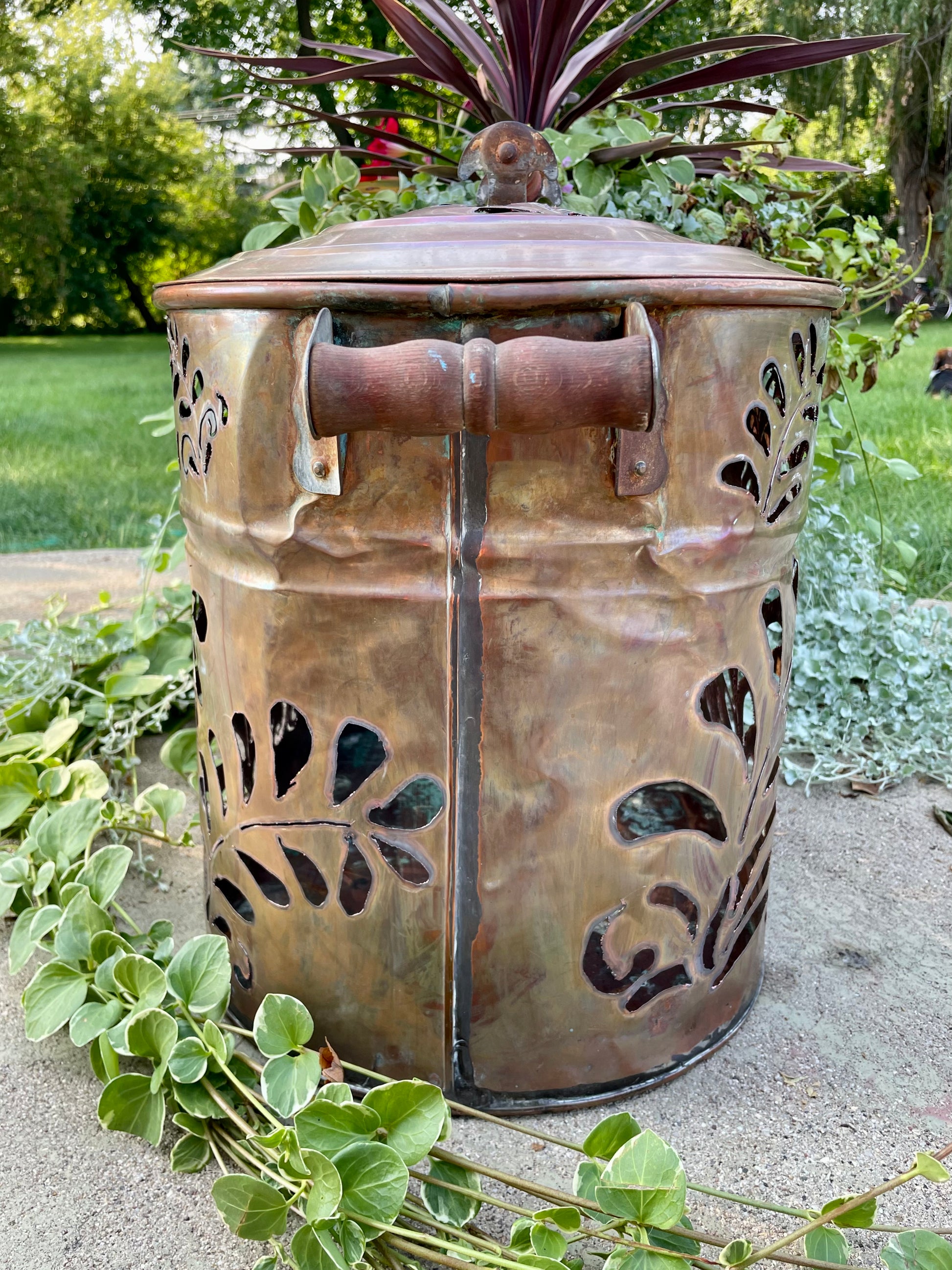 Antique hand-cut COPPER boiler with a lid. Add a string of battery-operated lights (not included) to create a luminary.