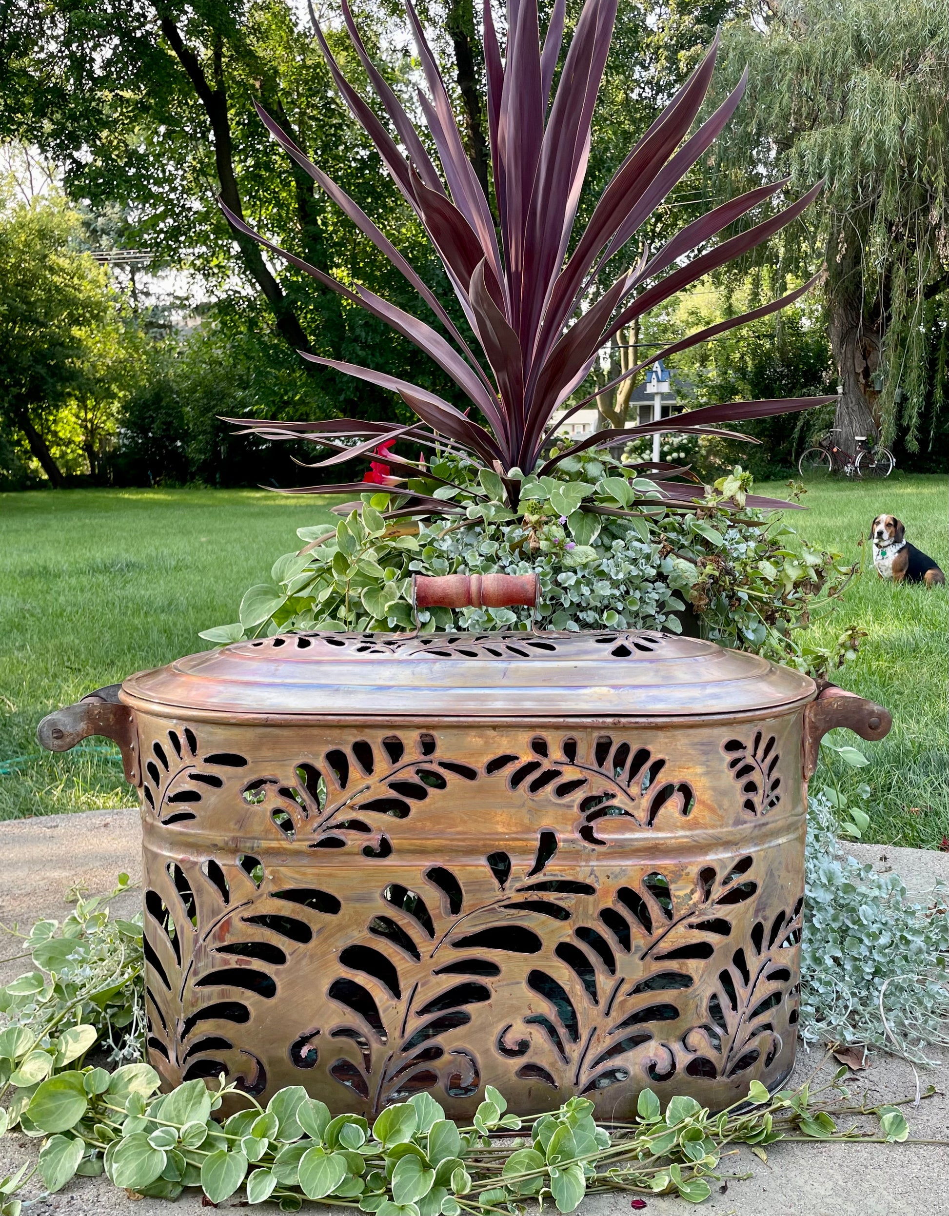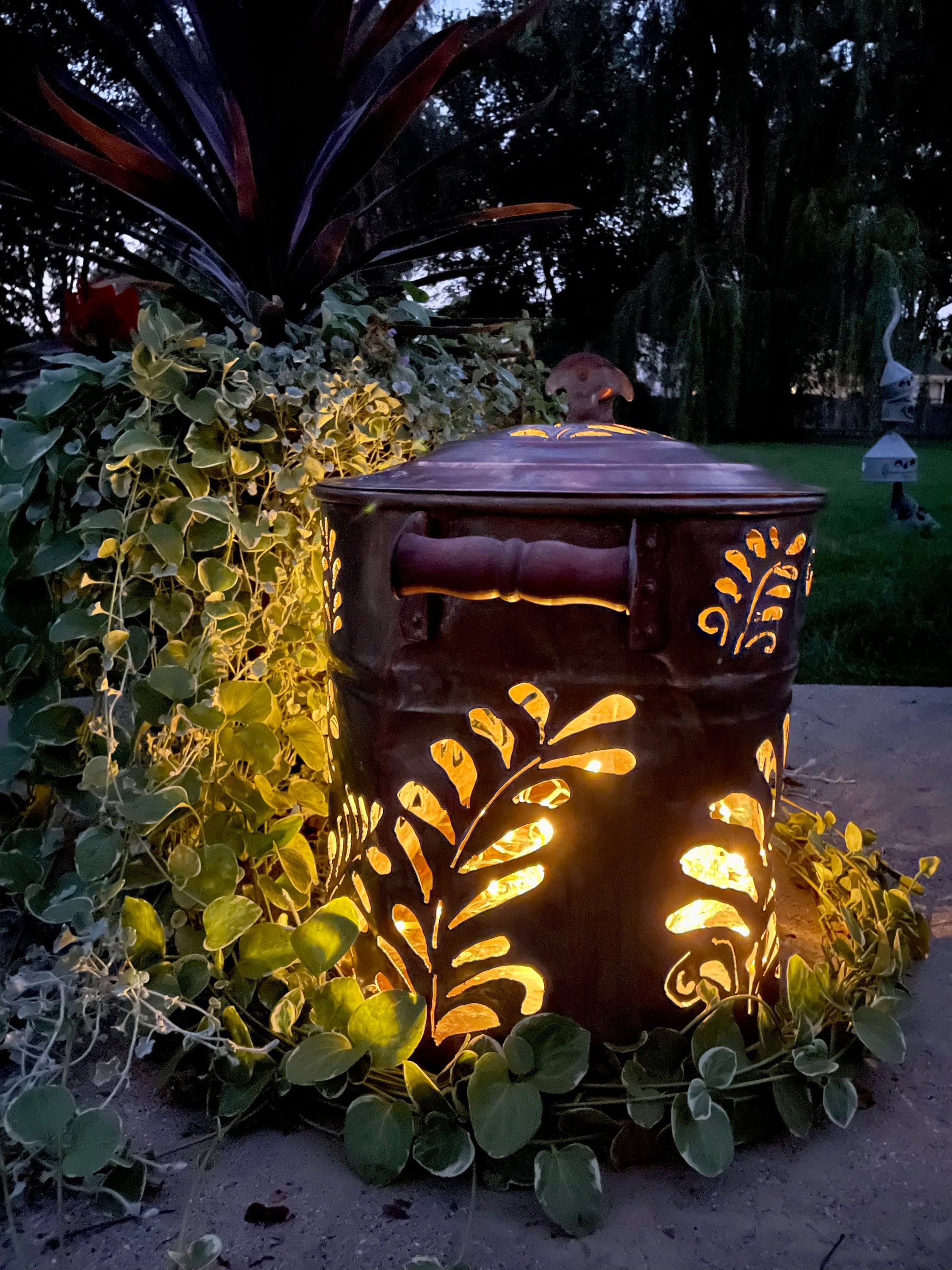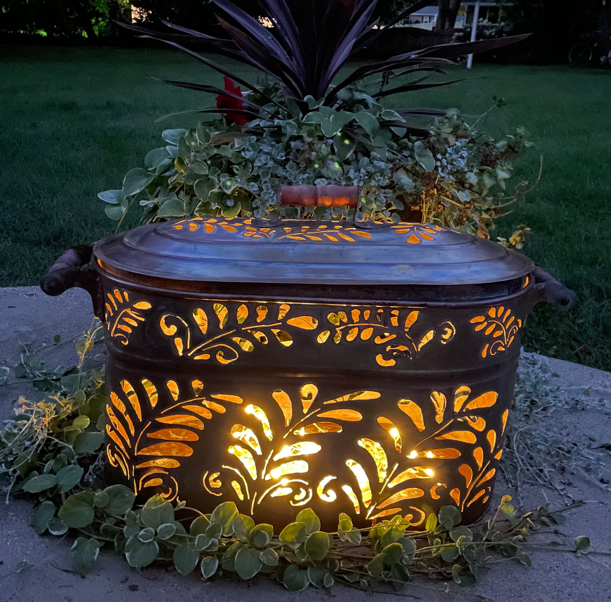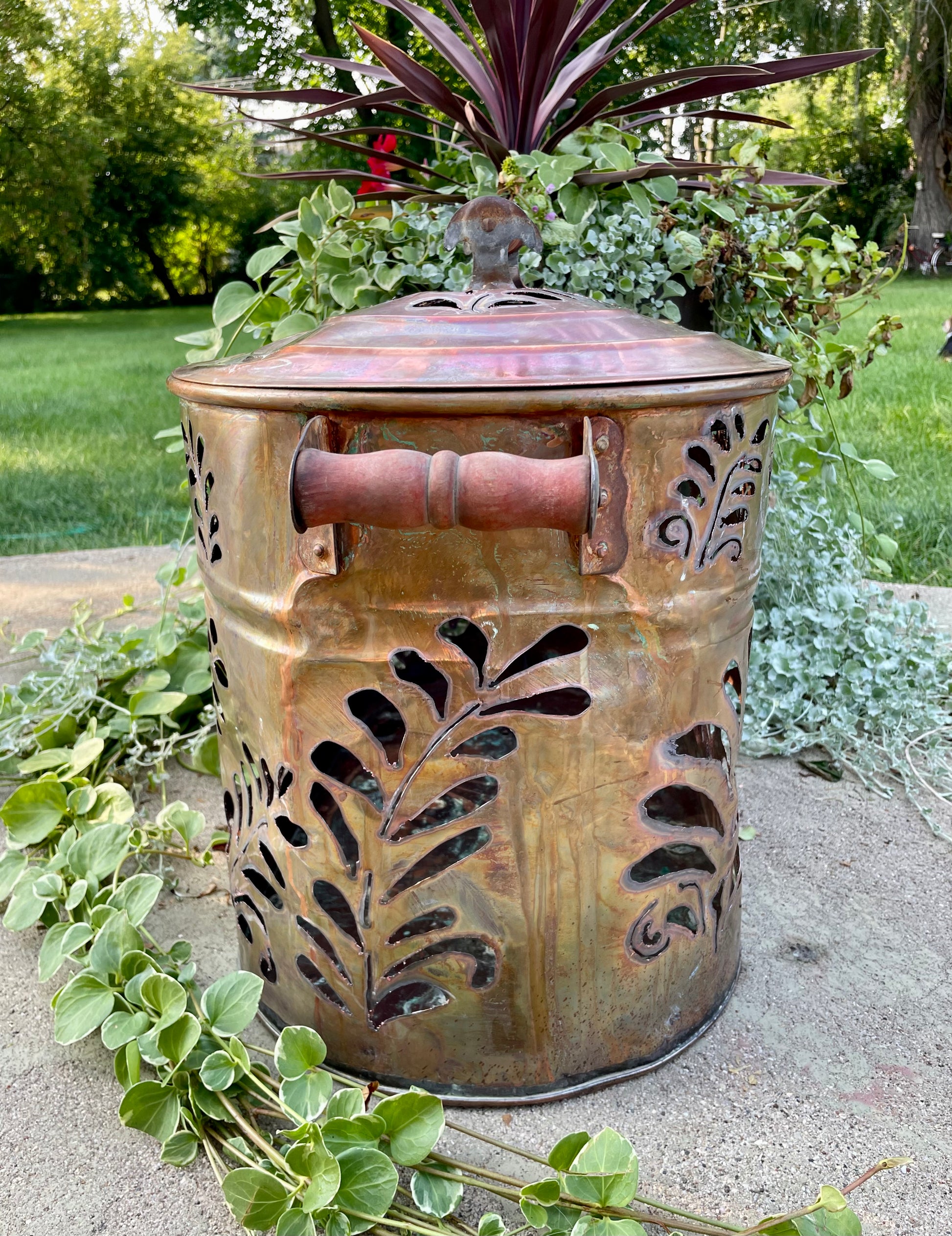 Antique hand-cut COPPER boiler with a lid. Add a string of battery-operated lights (not included) to create a luminary.