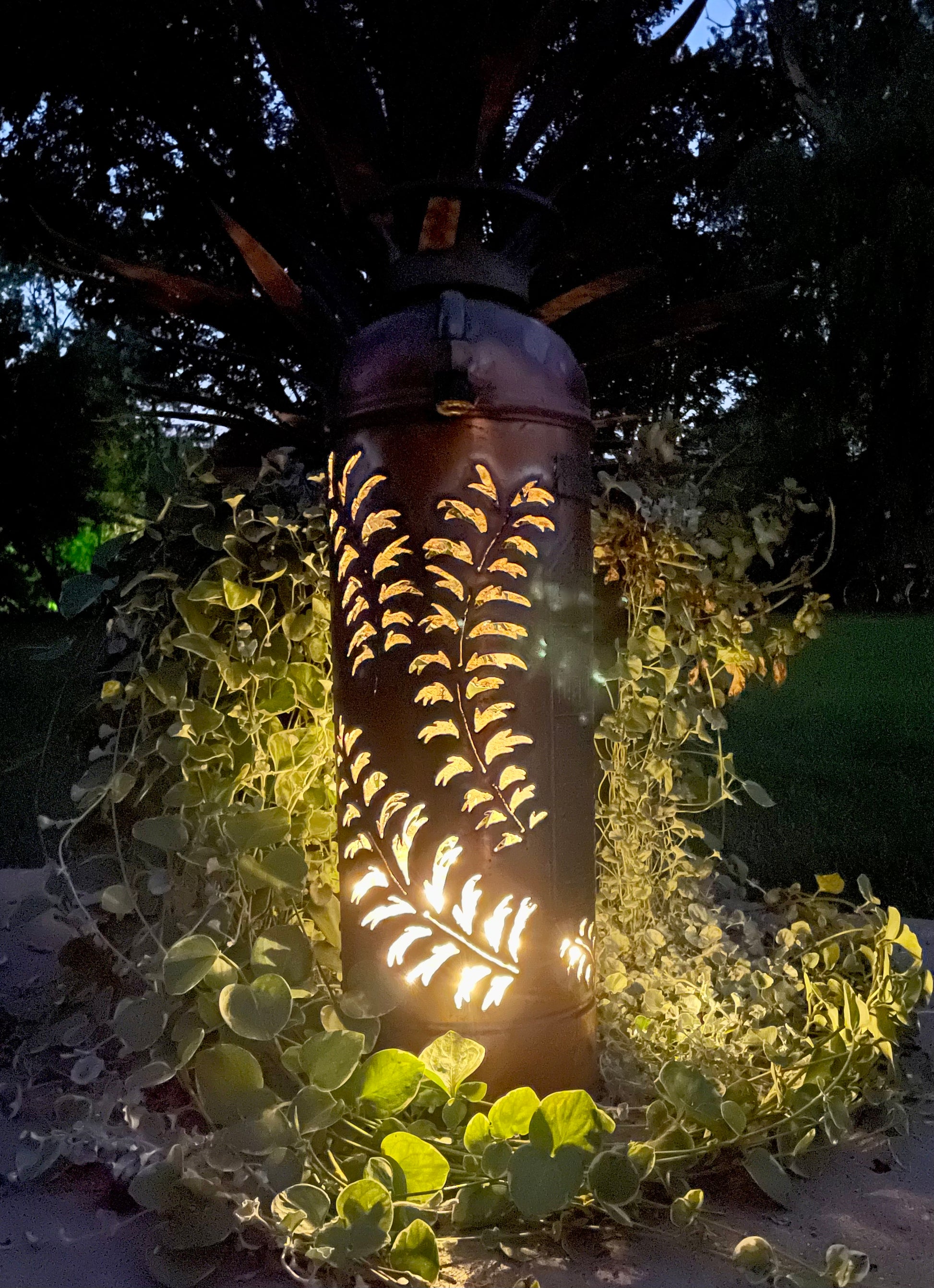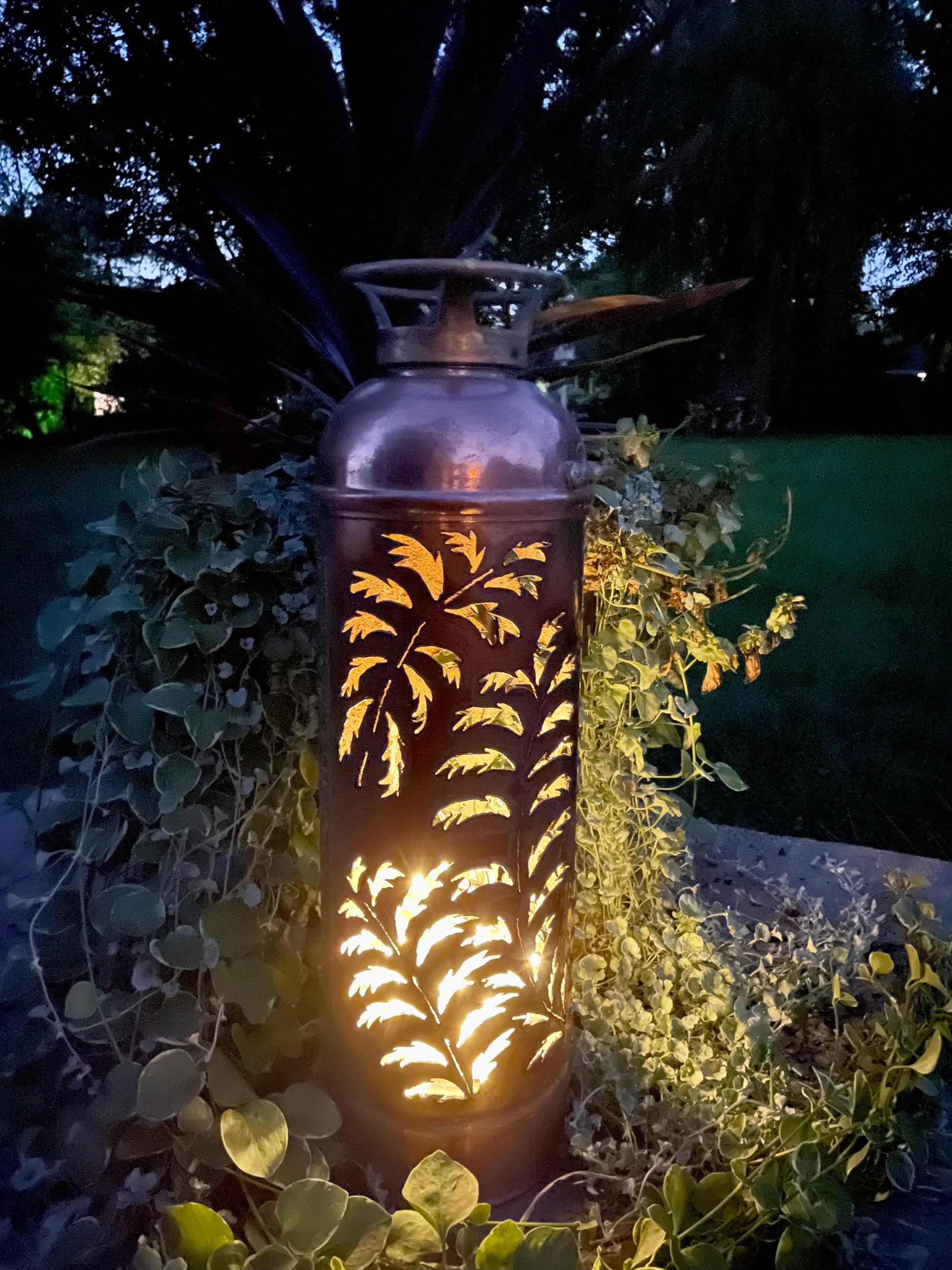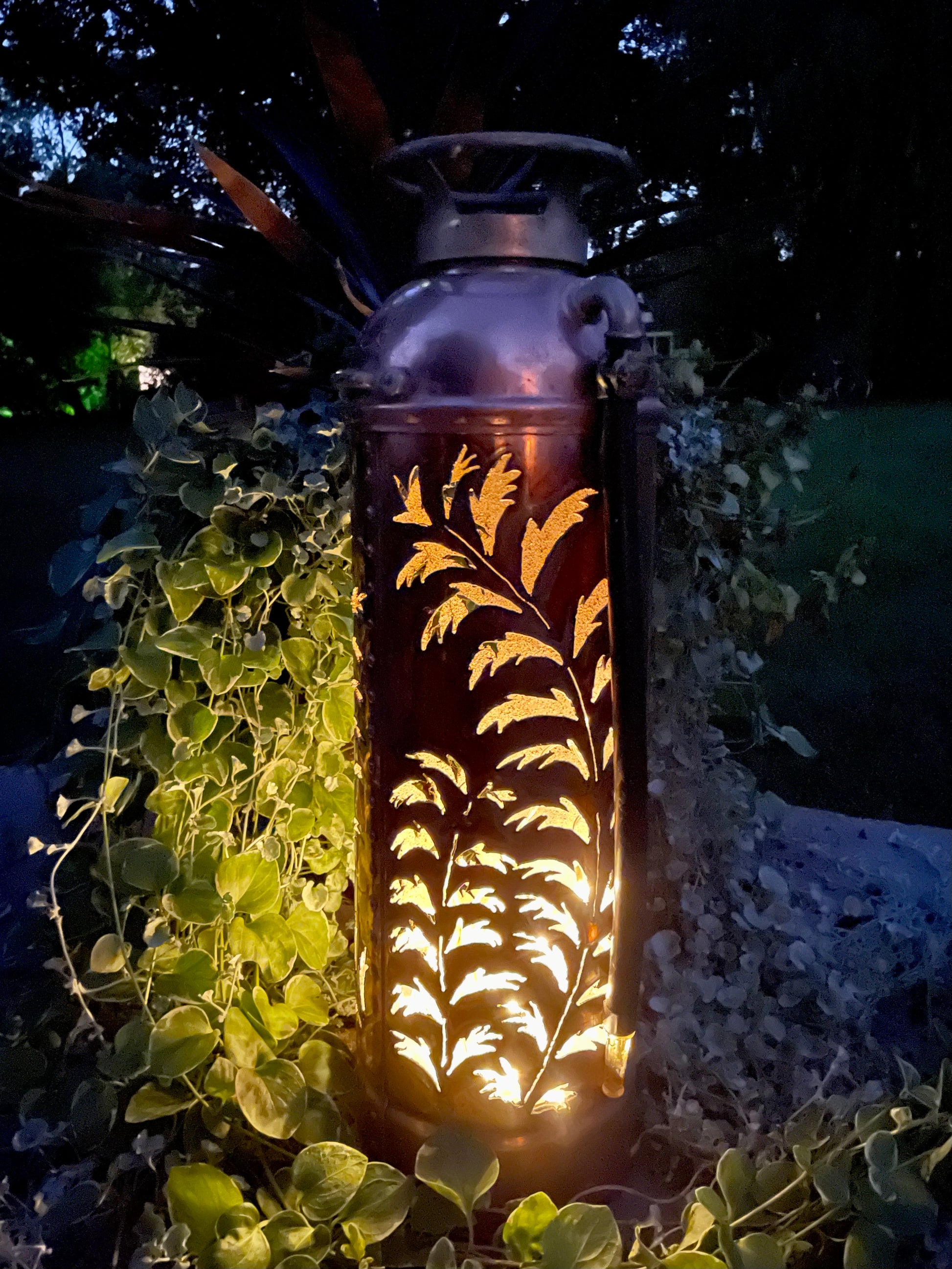 You won’t be able to put out any fires, but you will warm someone’s heart with this antique copper fire extinguisher. A hand-cut intricate leaf design makes this a conversation piece. Add a string of battery-operated lights (not included) to create a luminary.