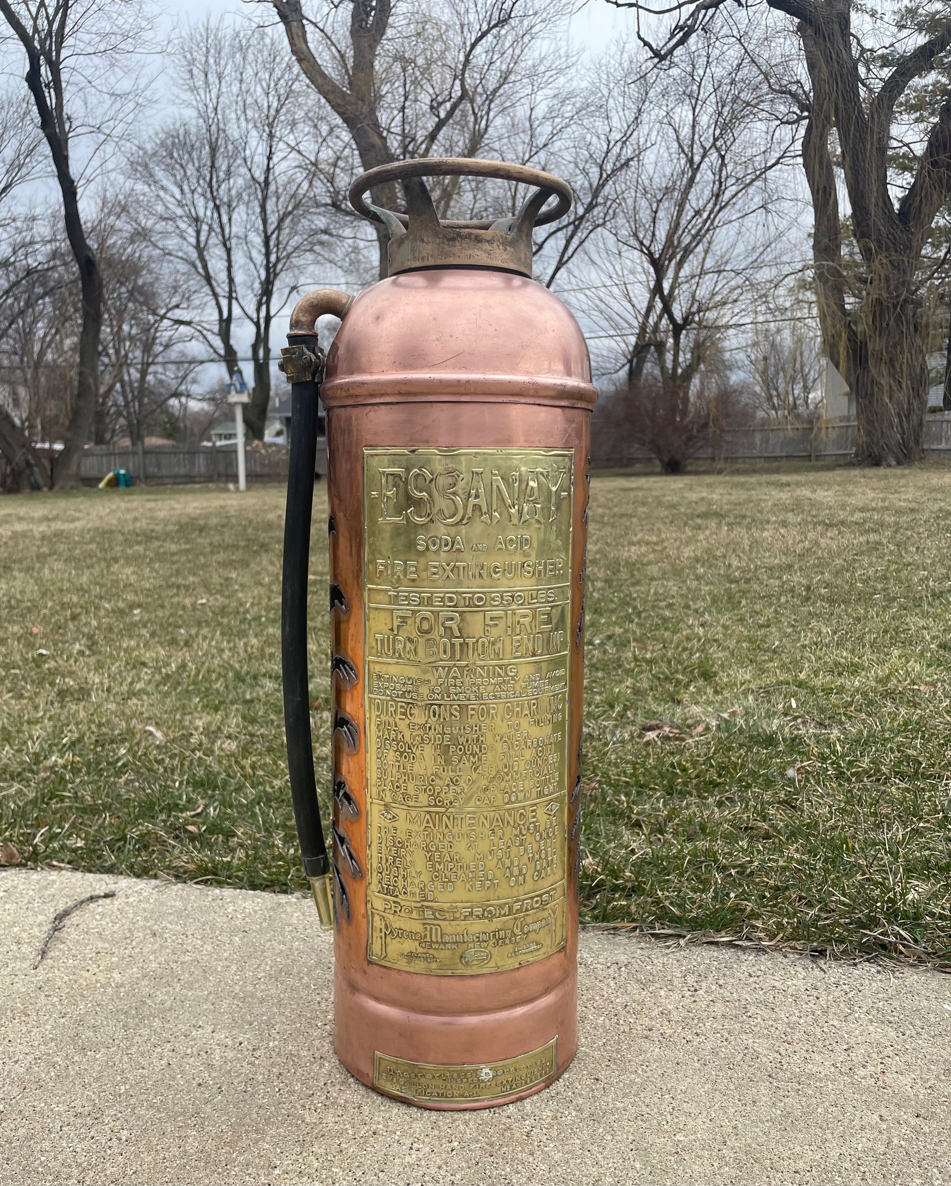 The labels are well preserved and easy to read. ESSANY Soda and Acid Fire Extinguisher Tested to 350 LBS. FOR FIRE TURN BOTTOM END UP.