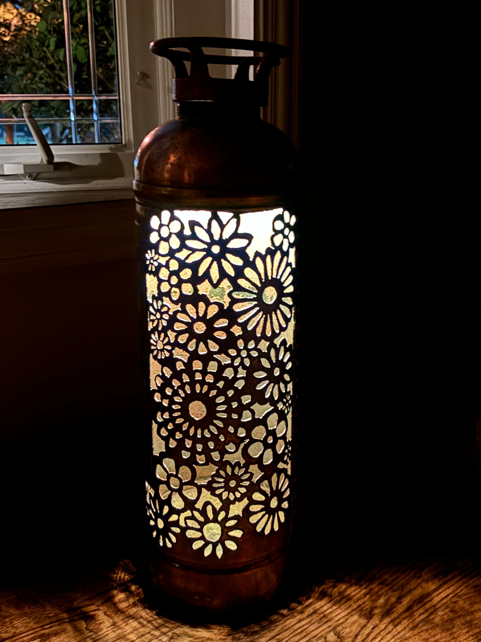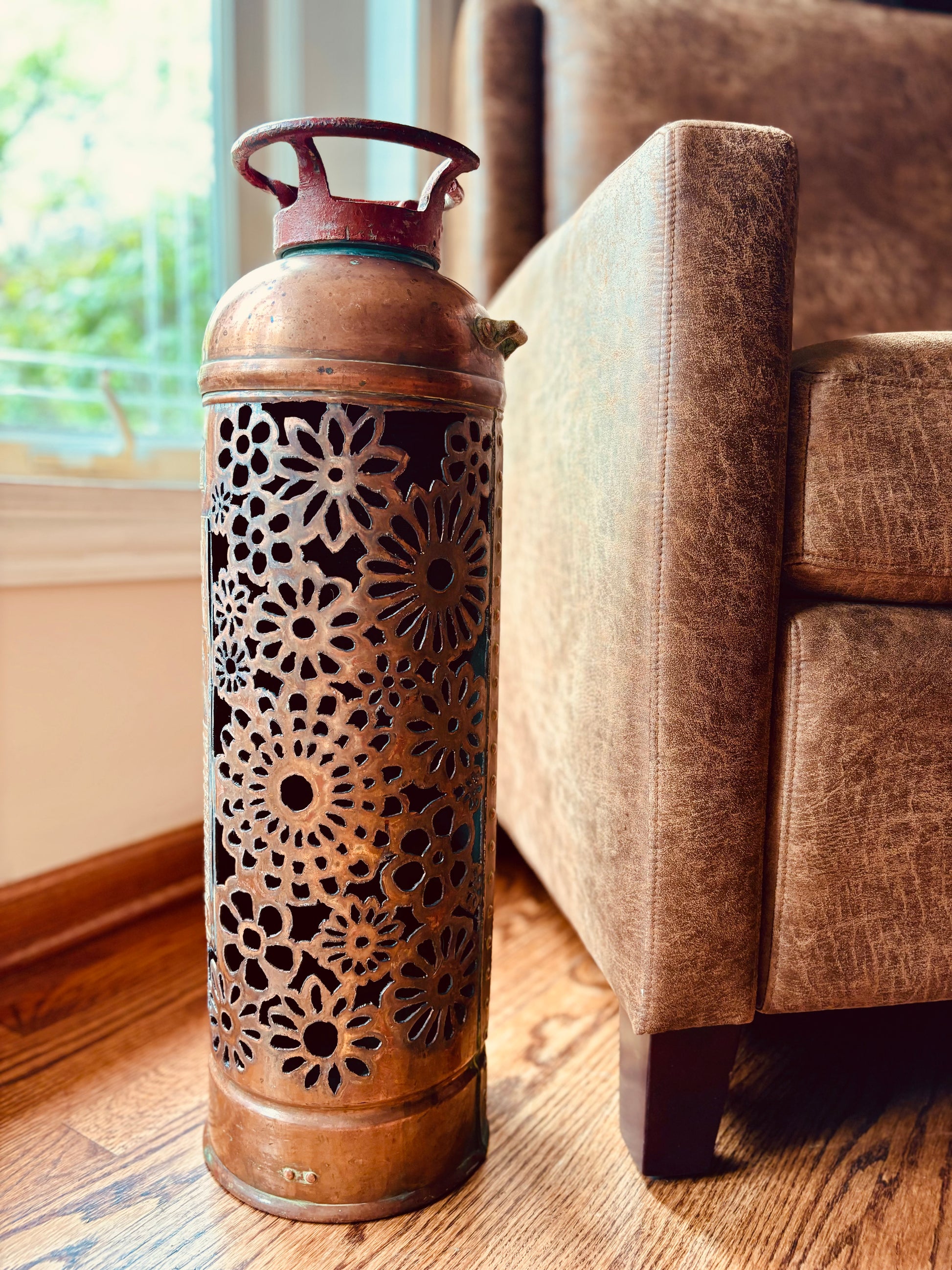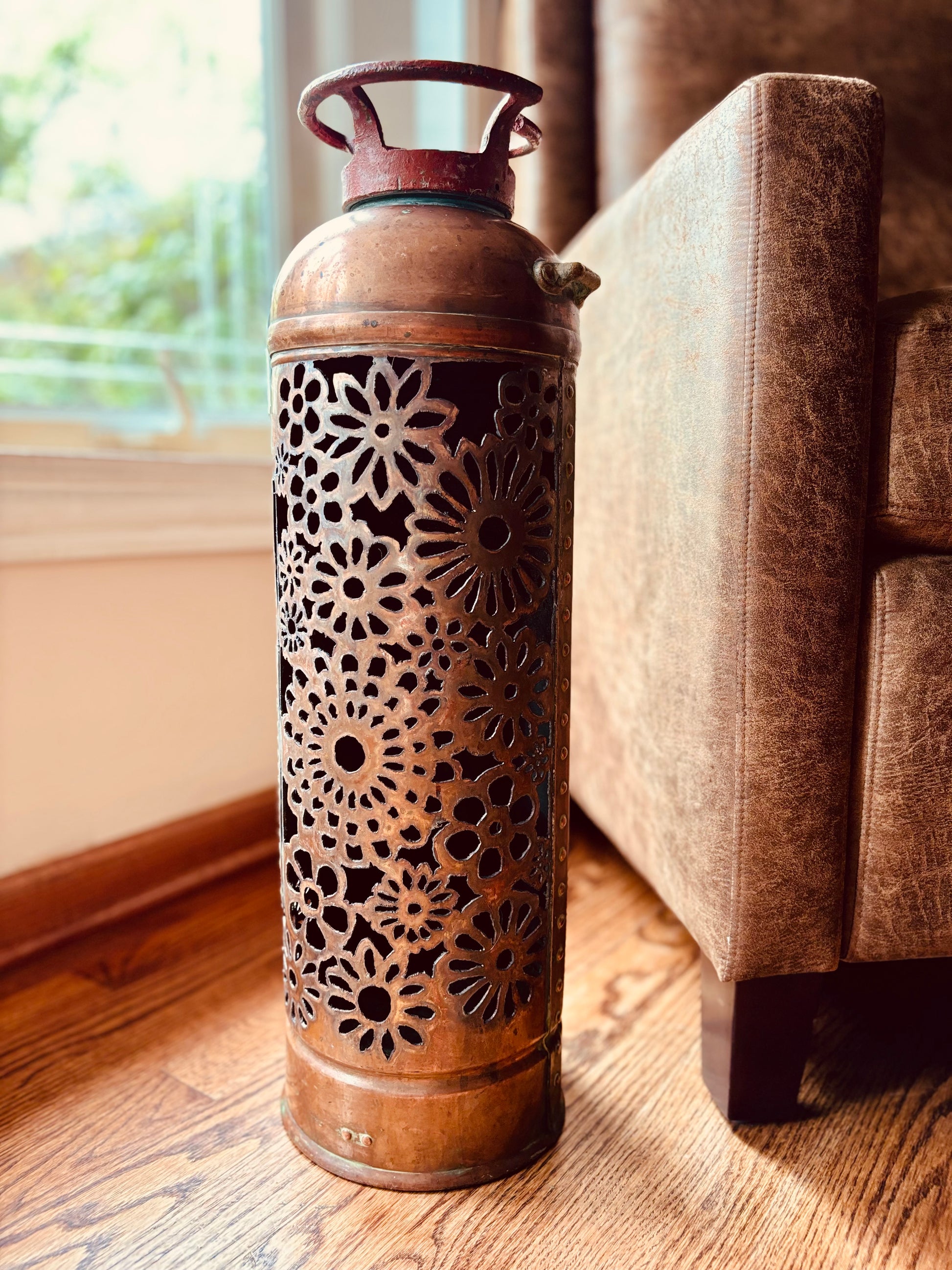 You won’t be able to put out any fires, but you will warm someone’s heart with this antique COPPER fire extinguisher. A hand-cut intricate flower design makes this a conversation piece. Indoor or outdoor decor. Perfect next to your soda, screened porch, or front steps. Add a string of battery-operated lights (not included) to create a luminary.