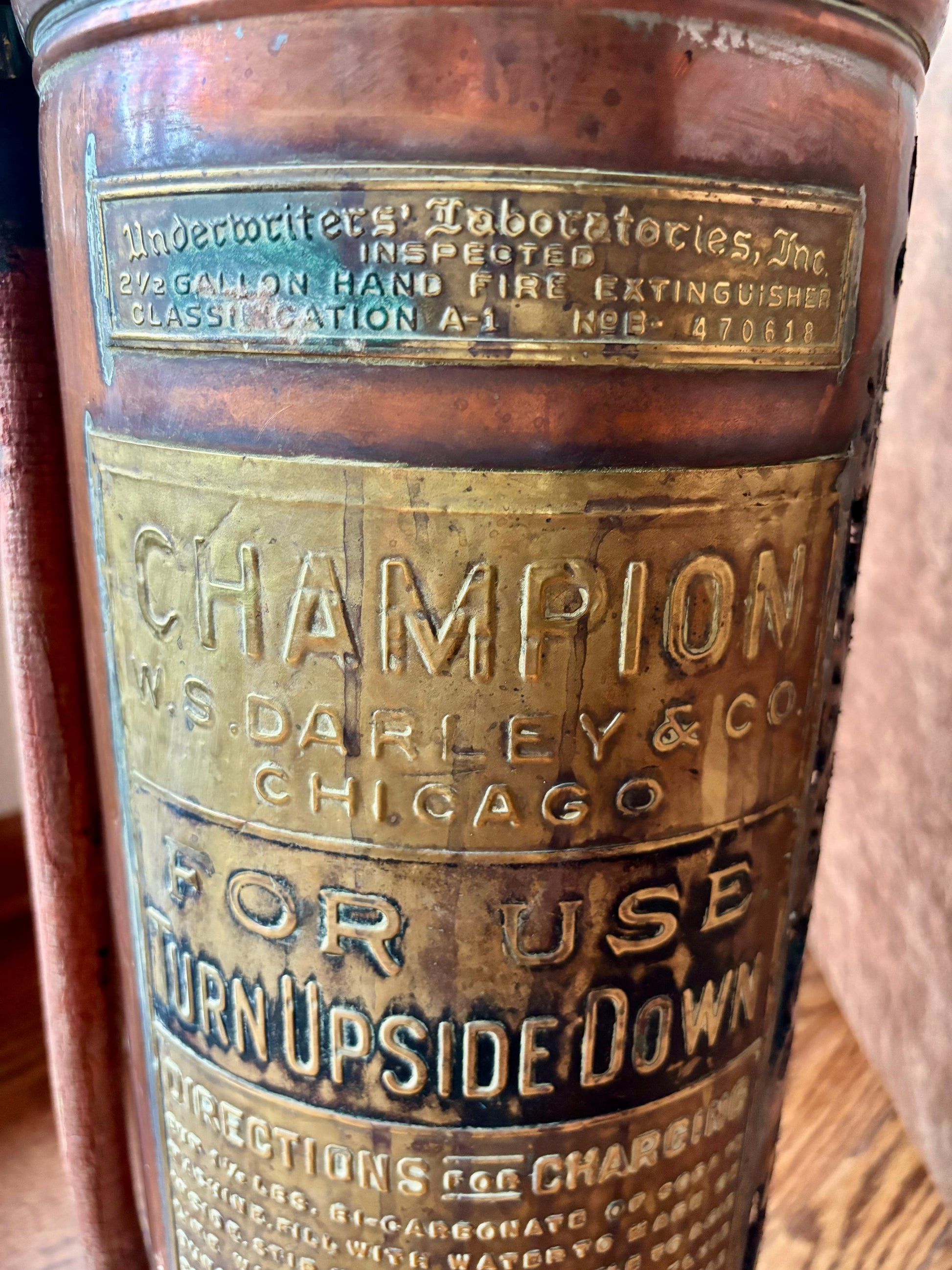 This extinguisher is intentionally cut approximately half way around so that the inner darkness, of the extinguisher, is used as a backdrop for the design. The labels are well preserved and easy to read. CHAMPION W.S. DARLEY & CO. CHICAGO (see picture for images of complete embossed label.)