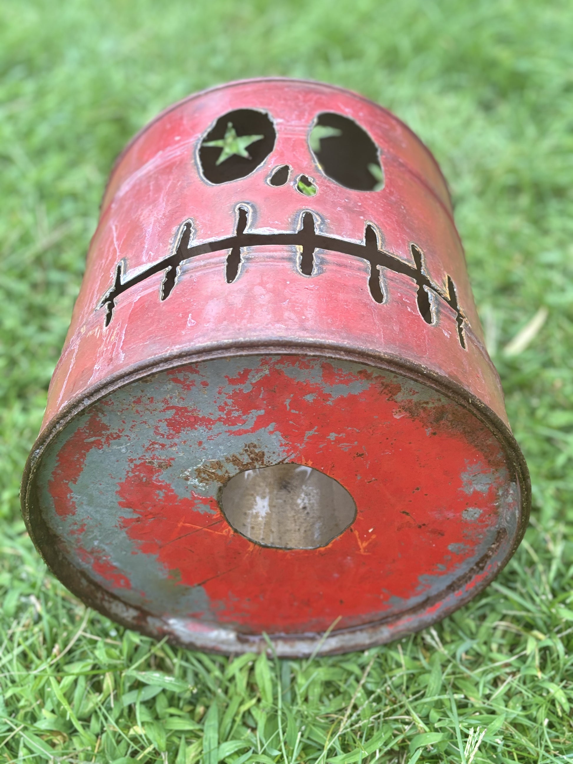 Hand cut with a plasma torch. Measures 17” tall x 12” wide and weighs 5.5 lbs. A hole has been cut in the bottom of the can to add lights (not included ).