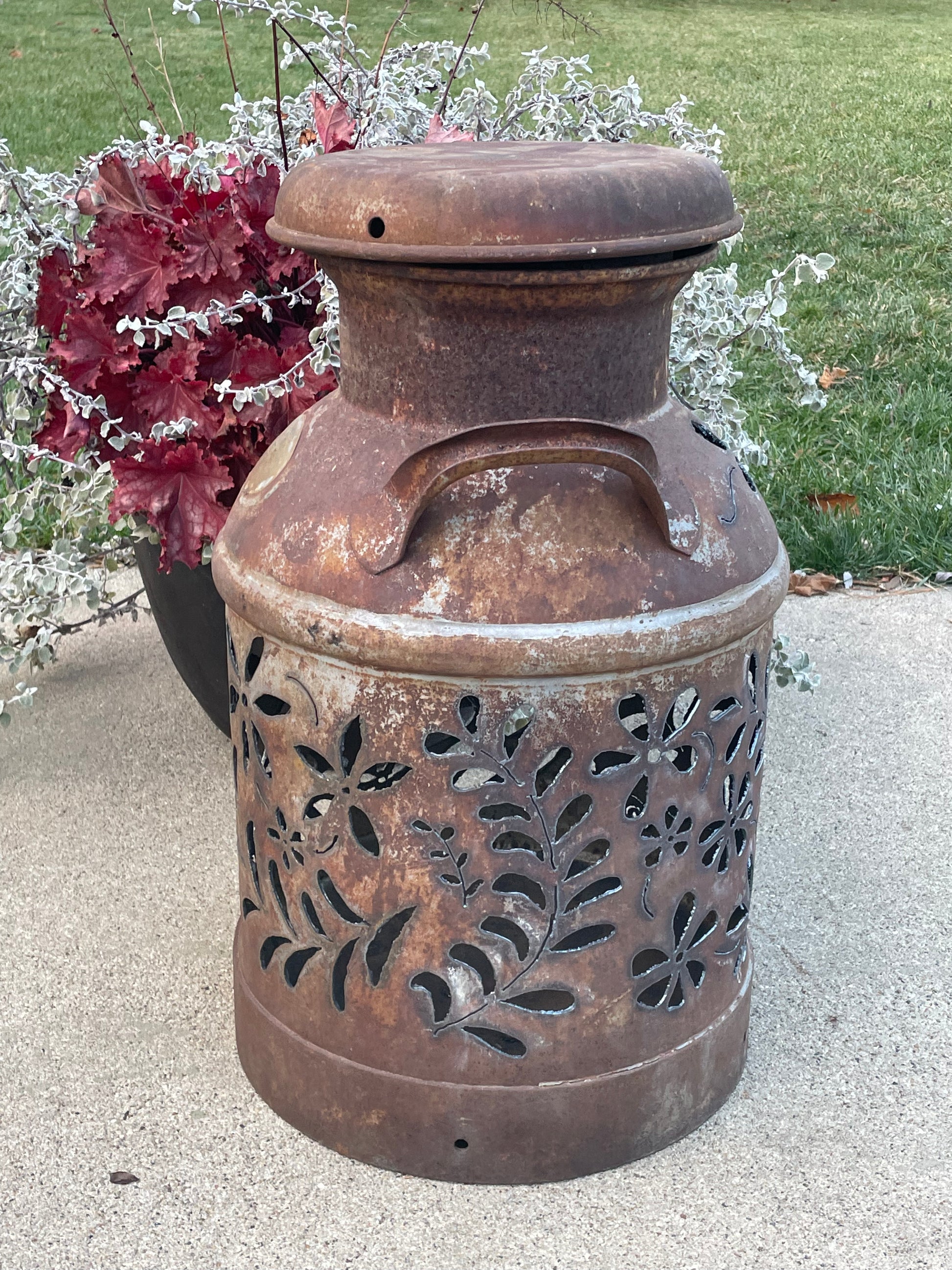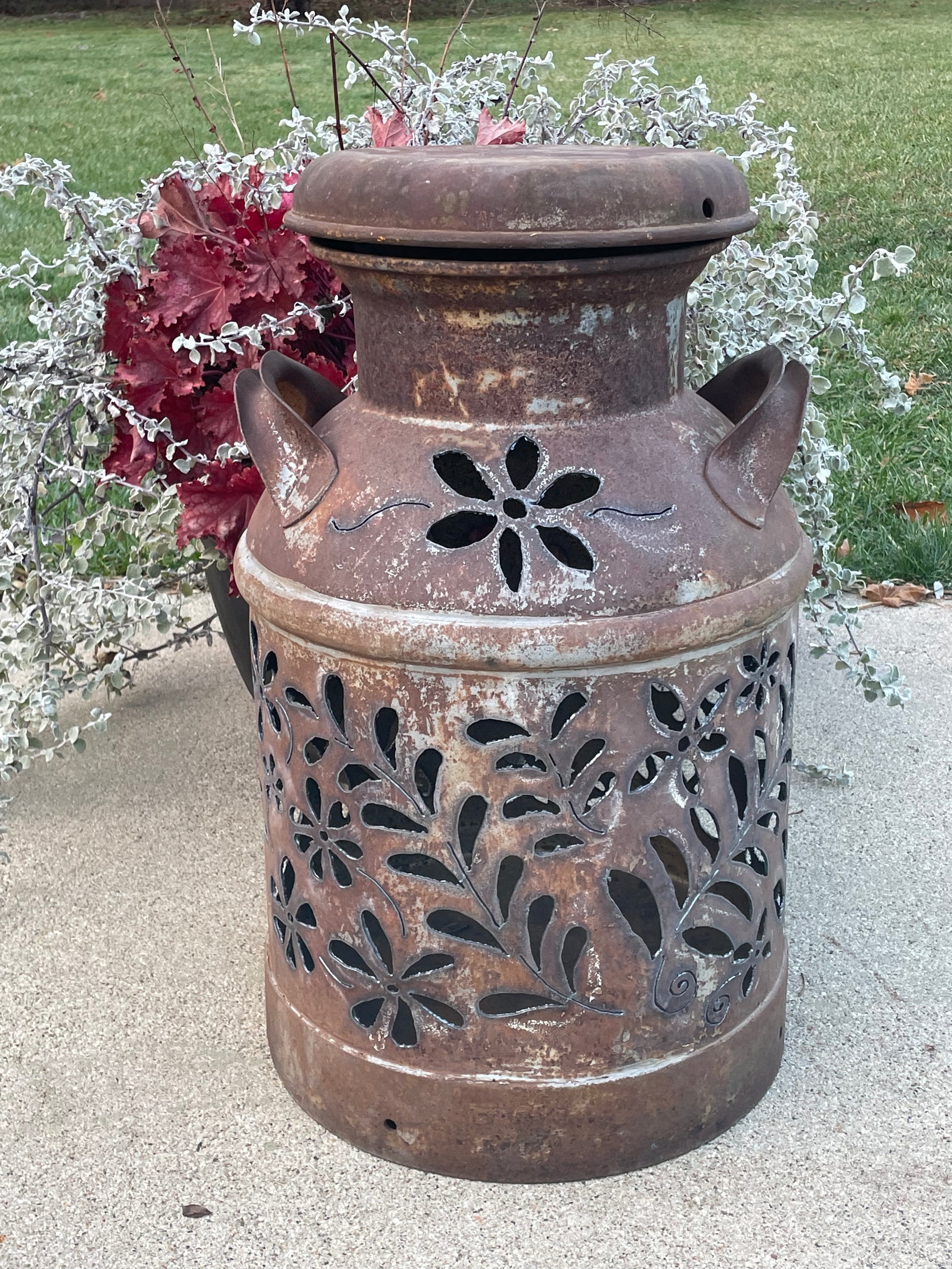 Brighten up your favorite spot with this intricately hand-cut vintage milk can.