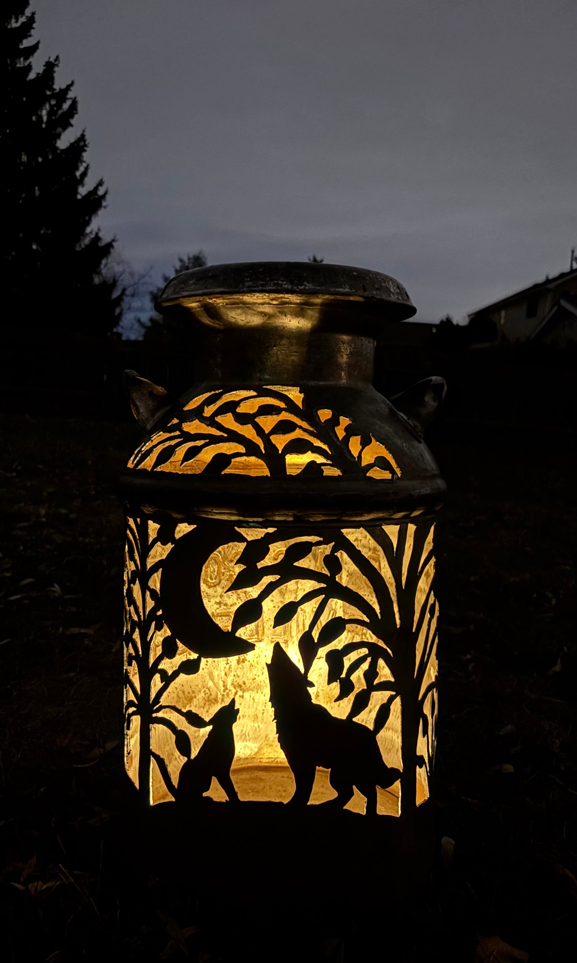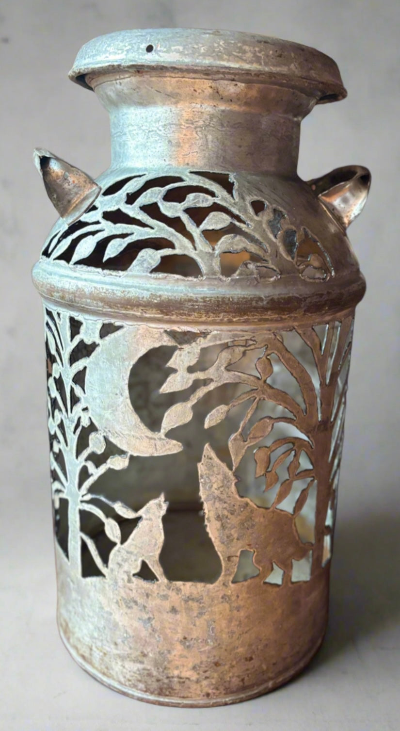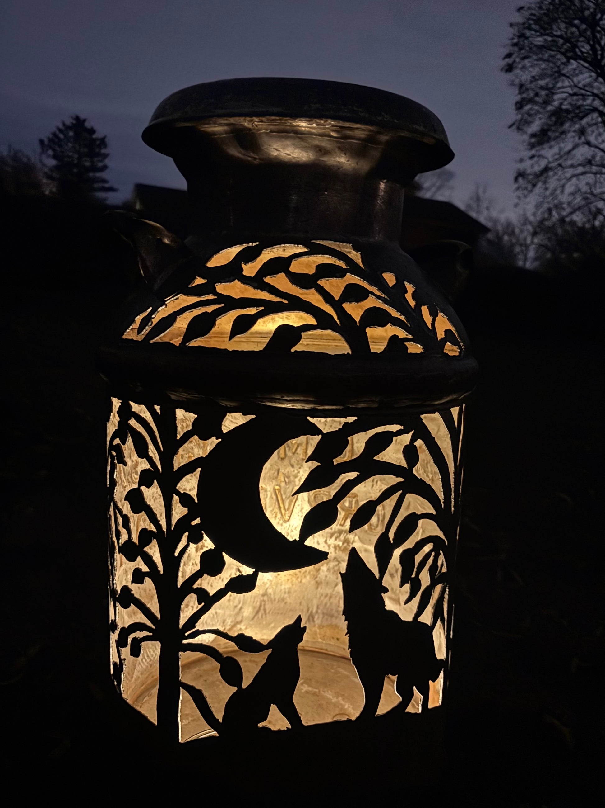 Antique milk can, intricately handcrafted with two wolves howling at the moon.