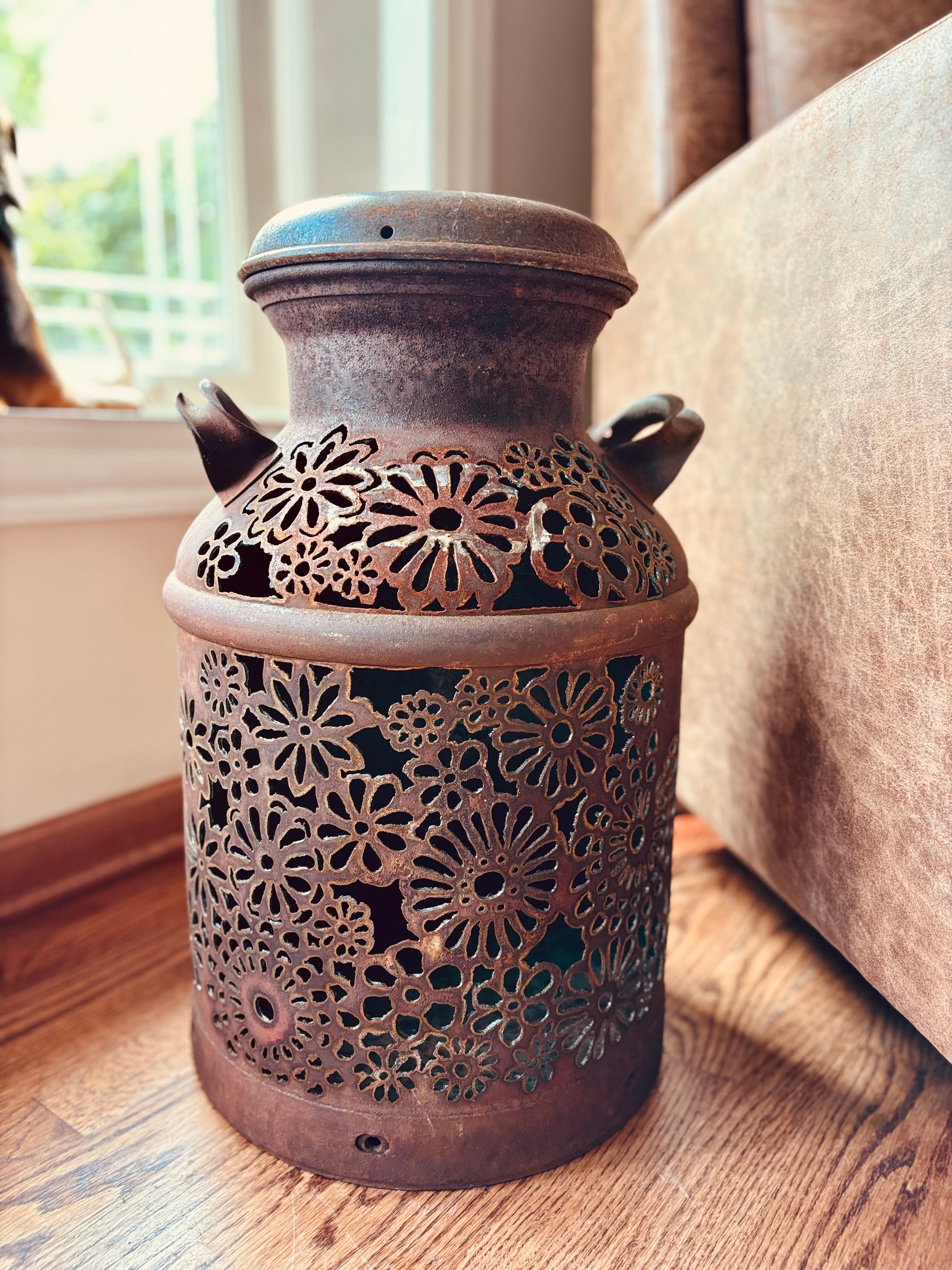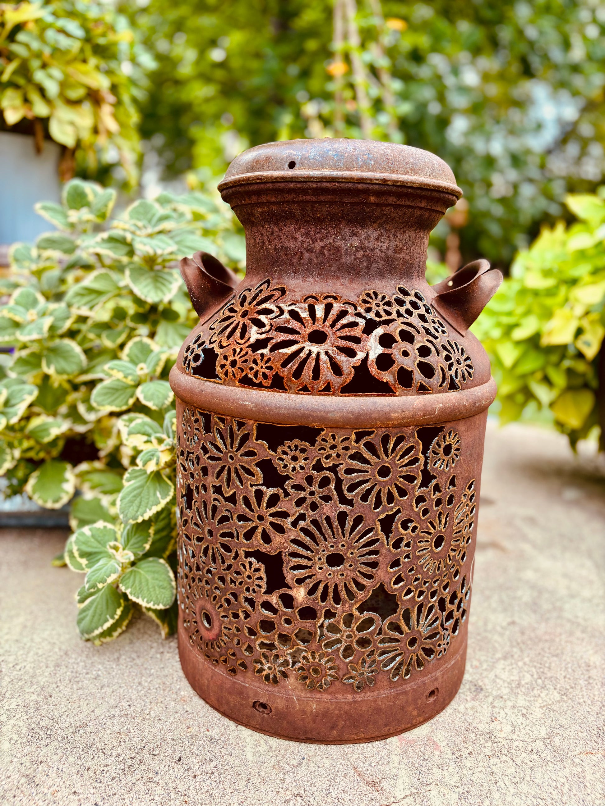 Brighten up your favorite spot with this intricately hand-cut vintage milk can with a flower design. This is a gorgeous can and can be used indoors or outdoors. The can is intentionally cut only on one side.