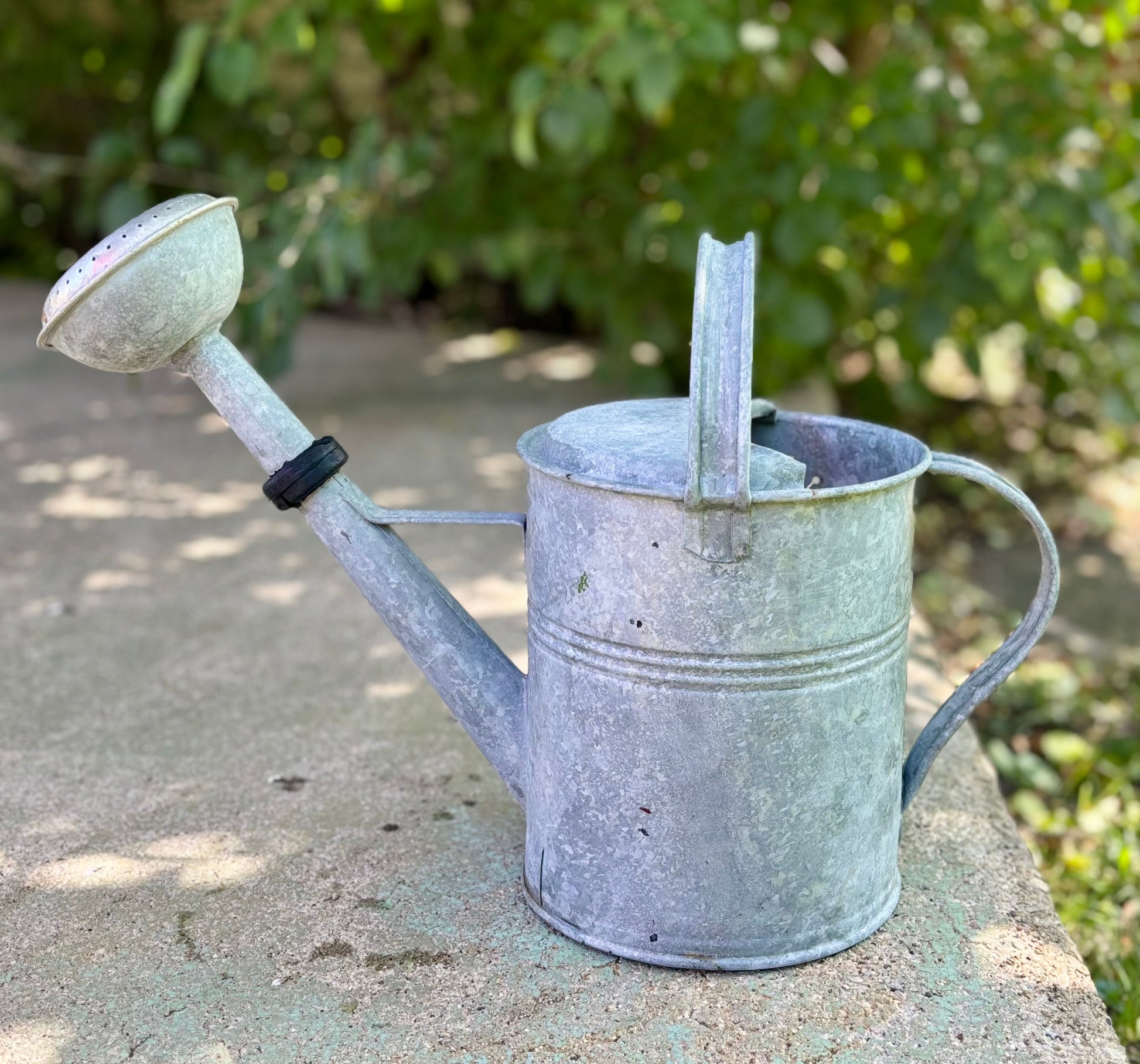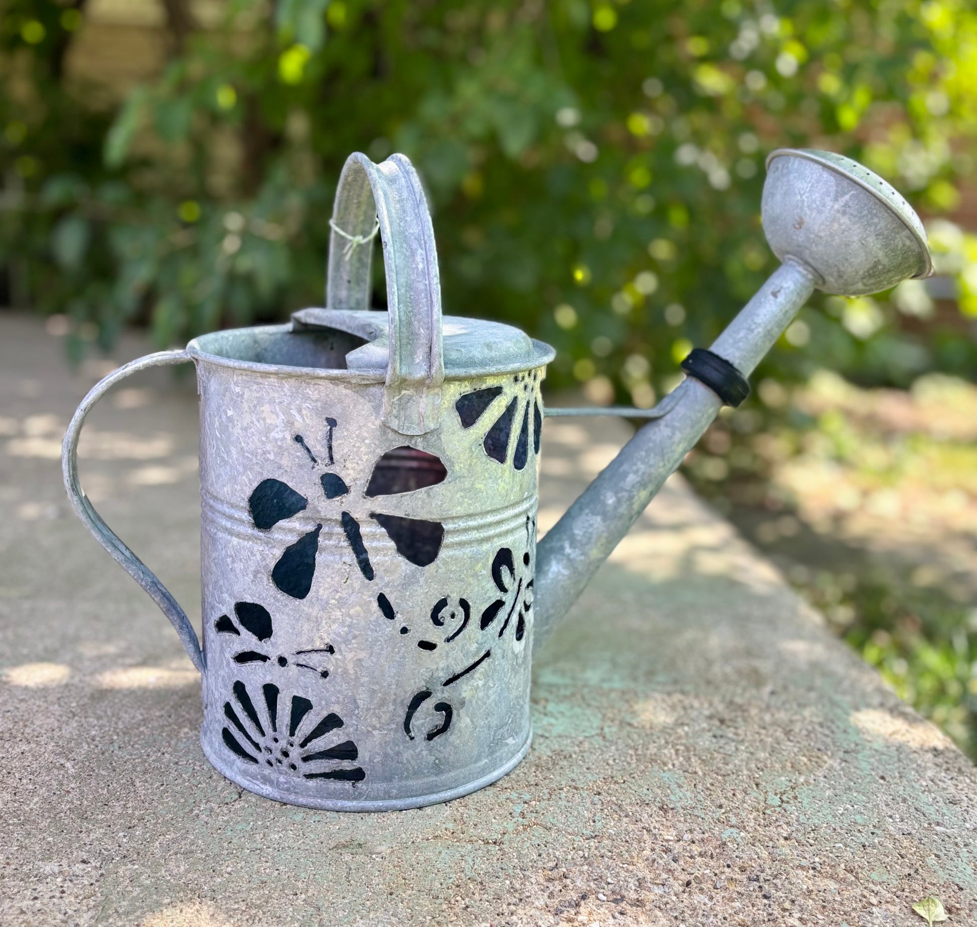 Antique watering can, handcrafted with a dragonfly and butterfly design.