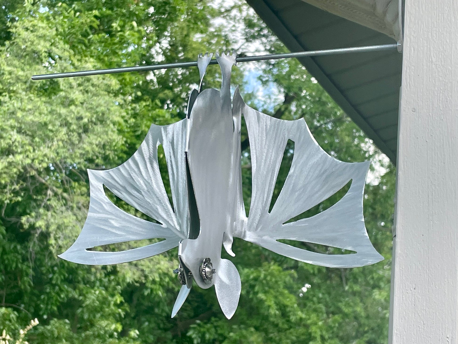 The bat measures 8” high from toe to ear and 15” wide from wing to wing. Made from aluminum (won’t rust) and grinded by hand to create unique designs in the metal. A clear-coat finish is added for extra protection.