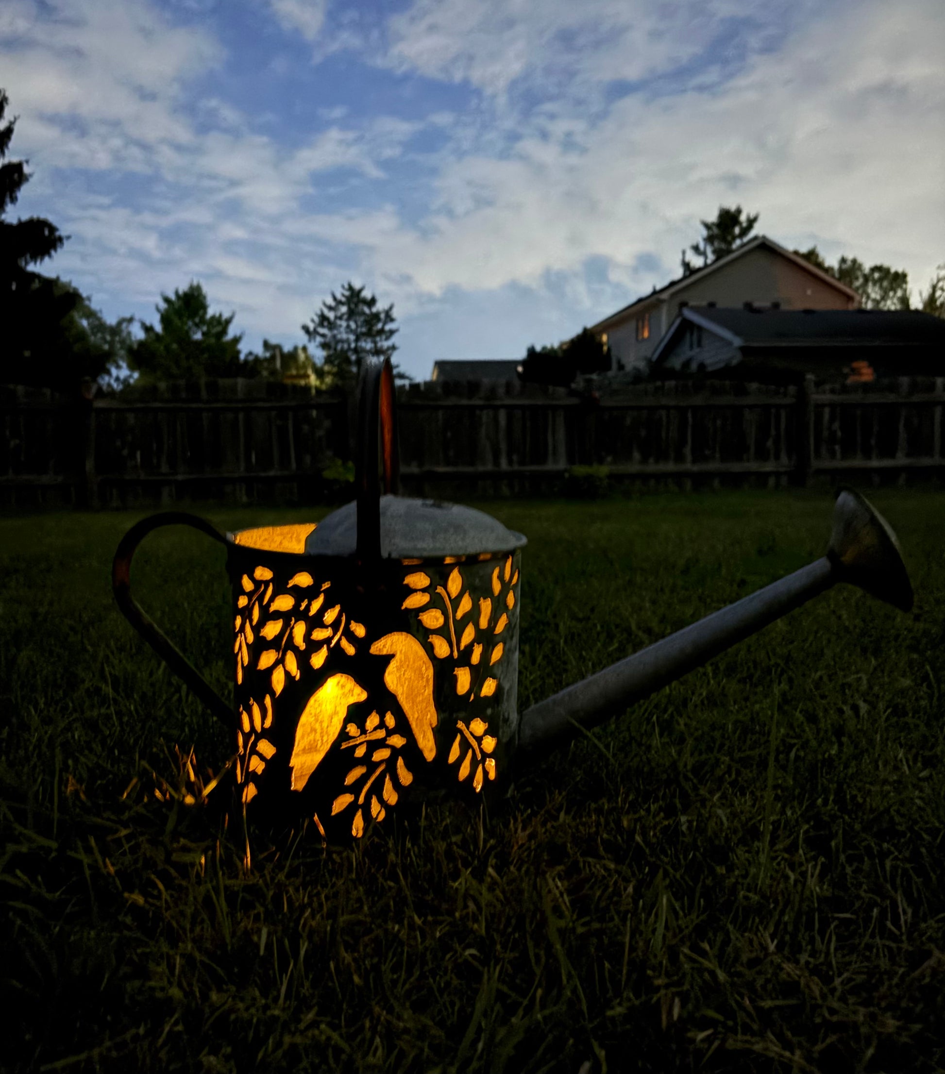 Lots of options styling this watering can. Add a string of battery-operated lights or a candle (not included) to create a luminary, use as a planter, or a piece of garden art.
