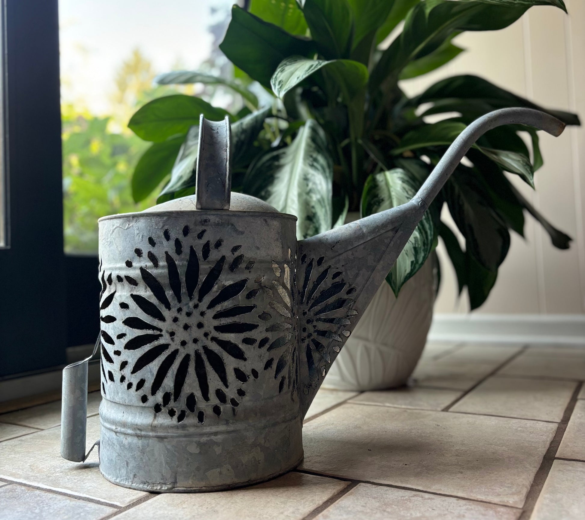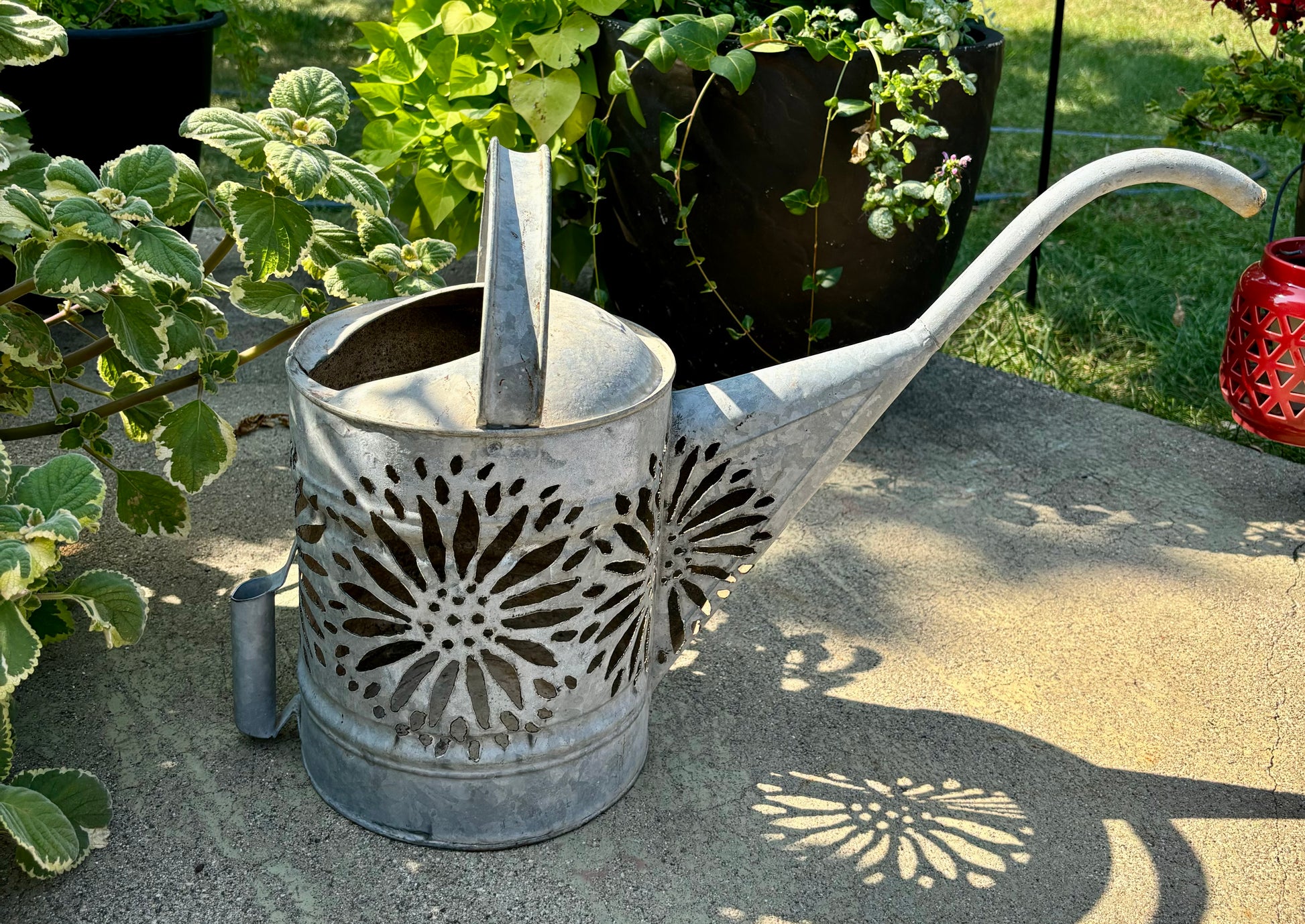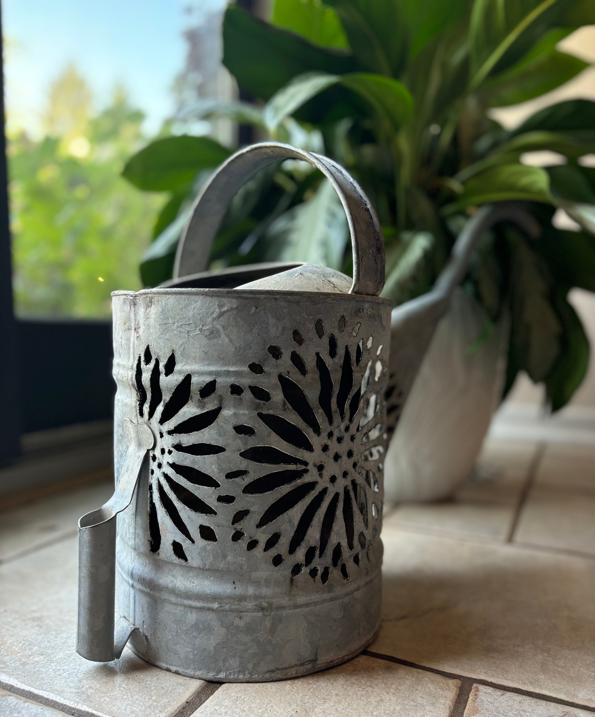 Antique watering can, hand cut with a flower design. Lots of options styling this watering can. Add a string of battery-operated (not included) to create a luminary, use as a planter, or a piece of garden art.