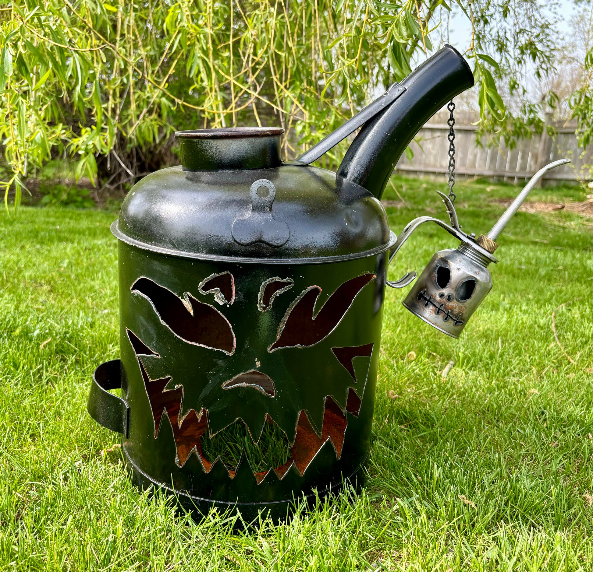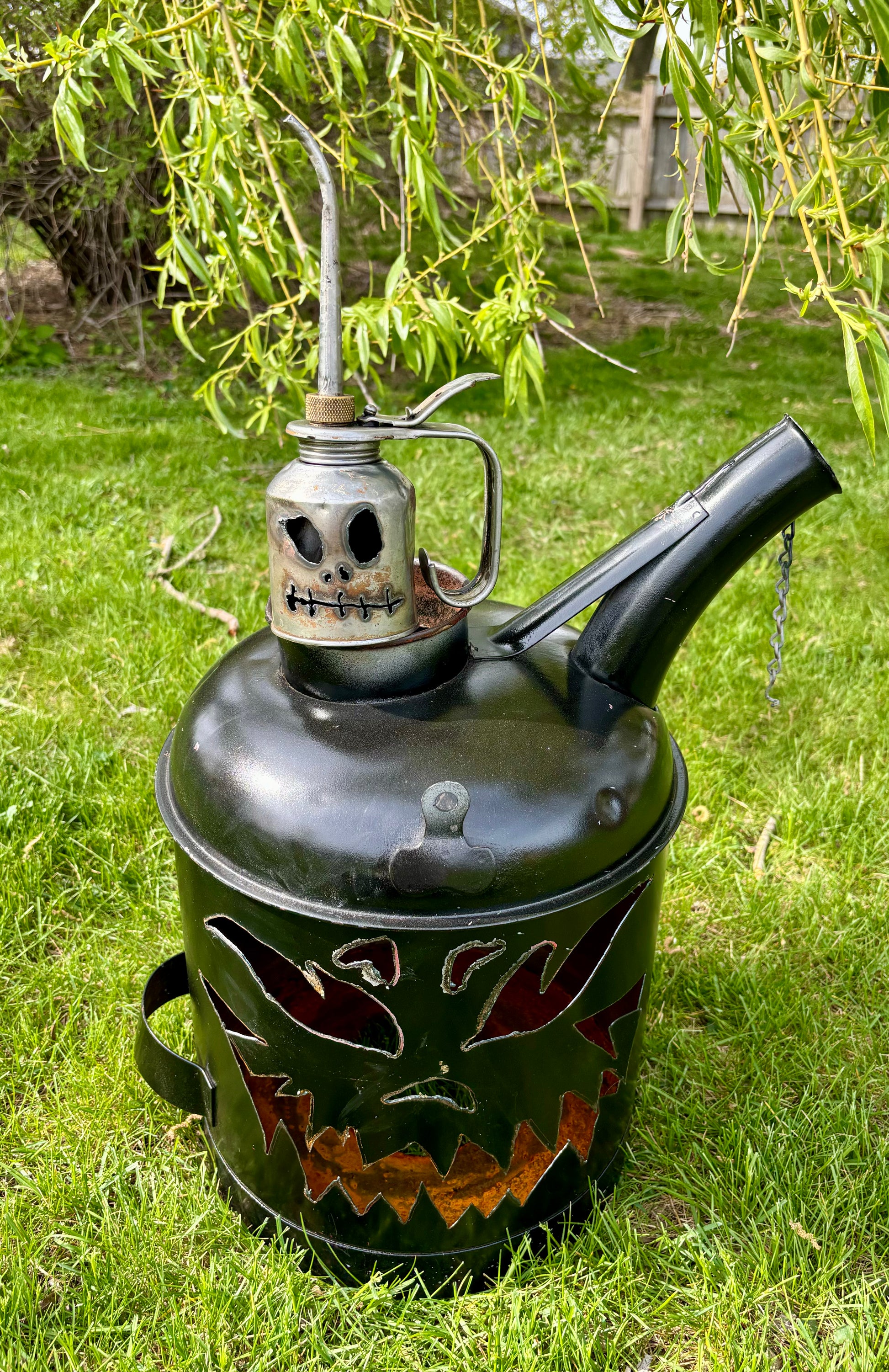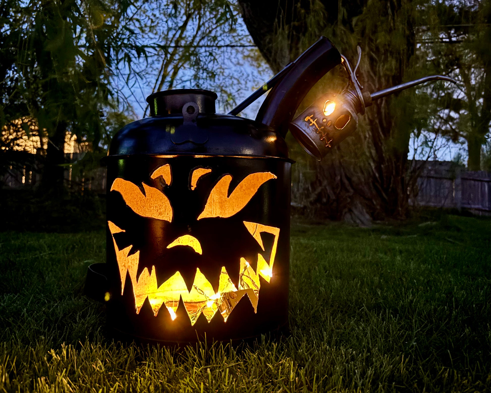 Double the fun with this vintage 5-gallon gas can and mini oil can turned spooky jack-o-lanterns. Add a string of battery-operated lights to light up your jack-o-lanterns (not included).