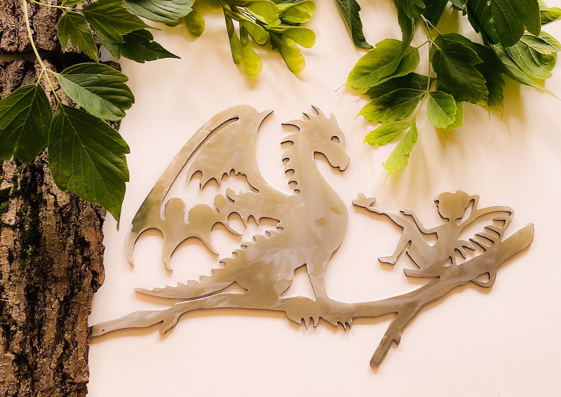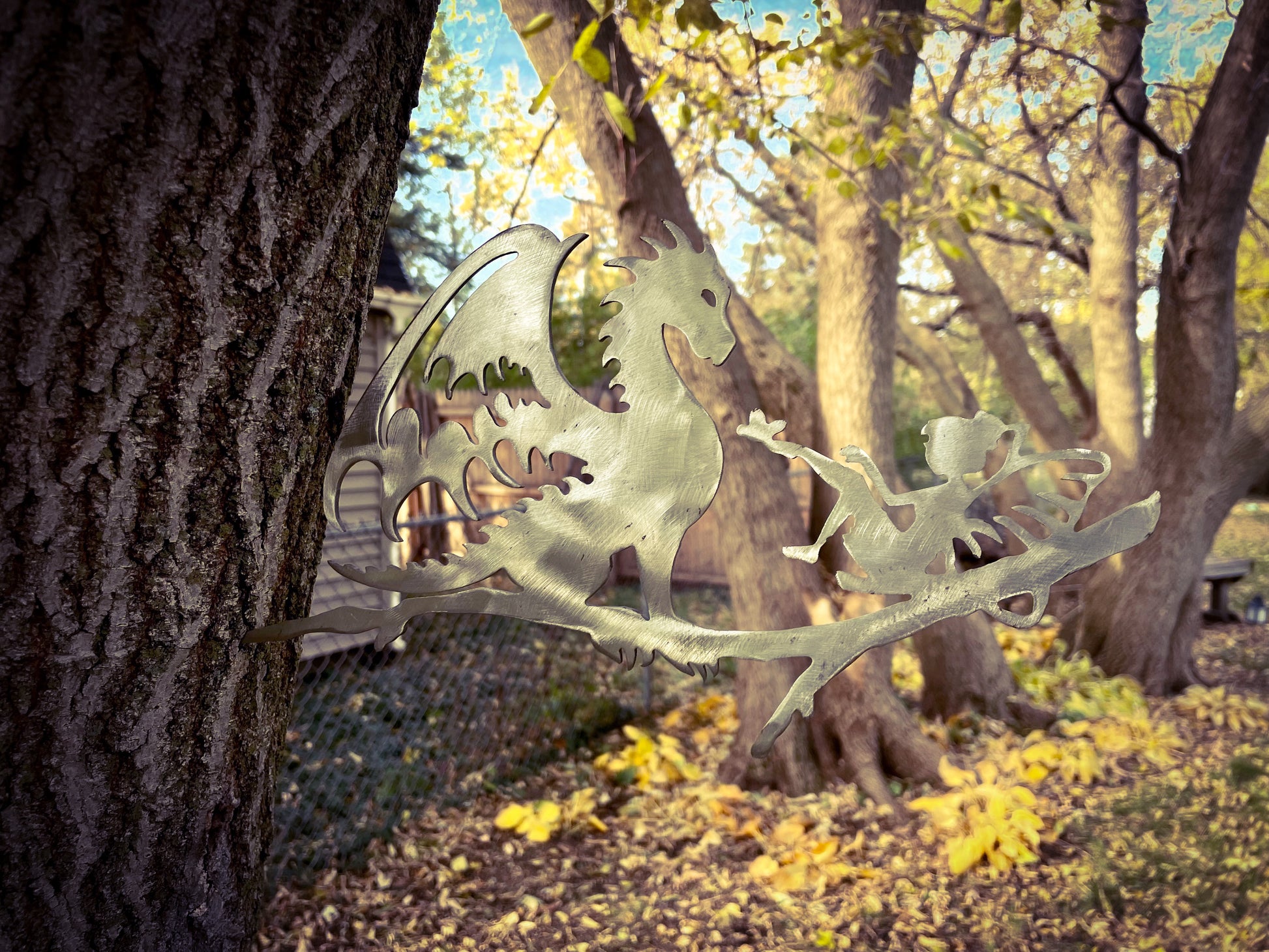 The dragon and fairy comes in two types of metal; raw steel or aluminum with a clear coat. If you choose the raw steel option, a rusty patina will develop on this piece over time. The aluminum with a clear coat will not rust and will maintain the silver/grey look.