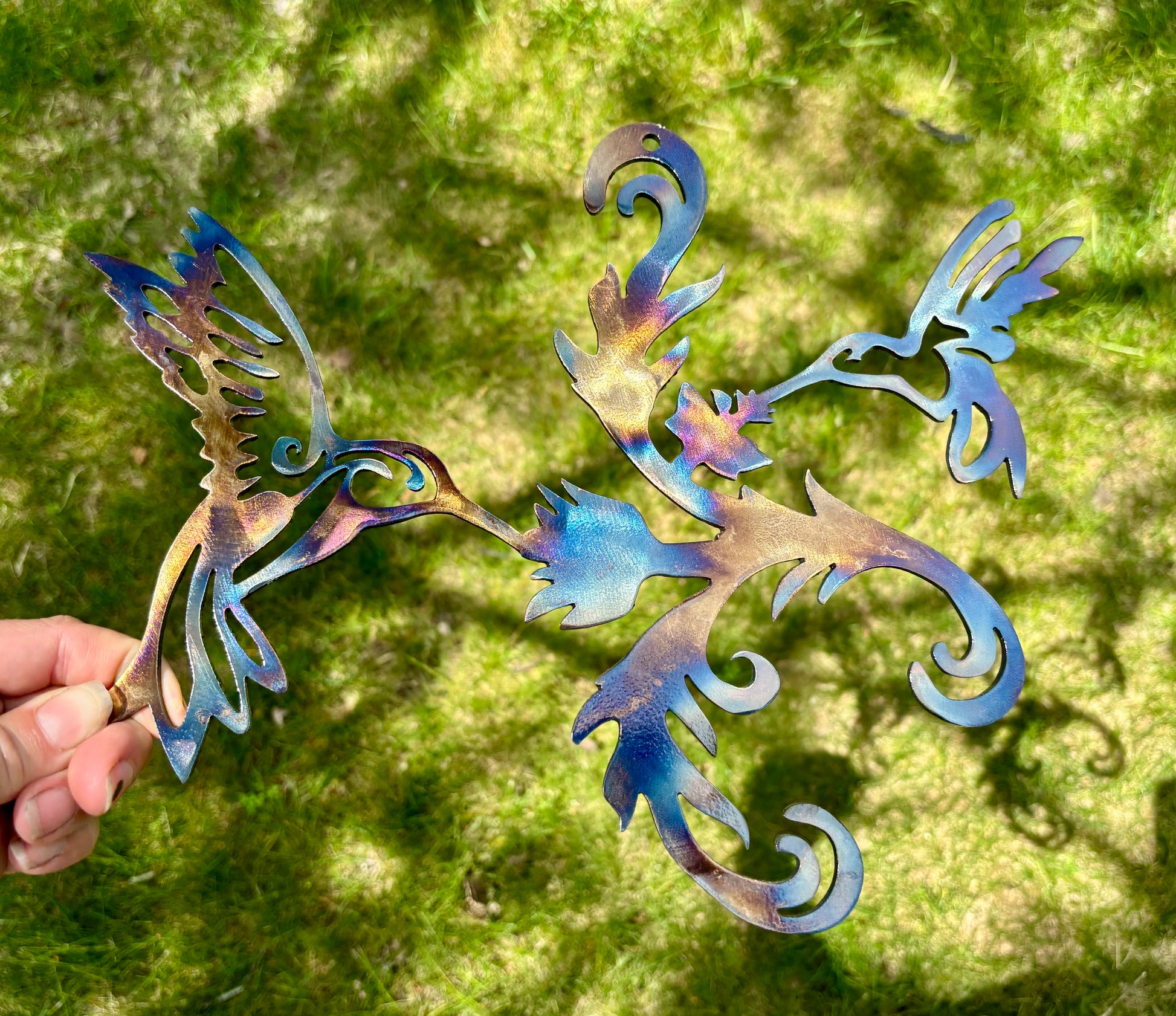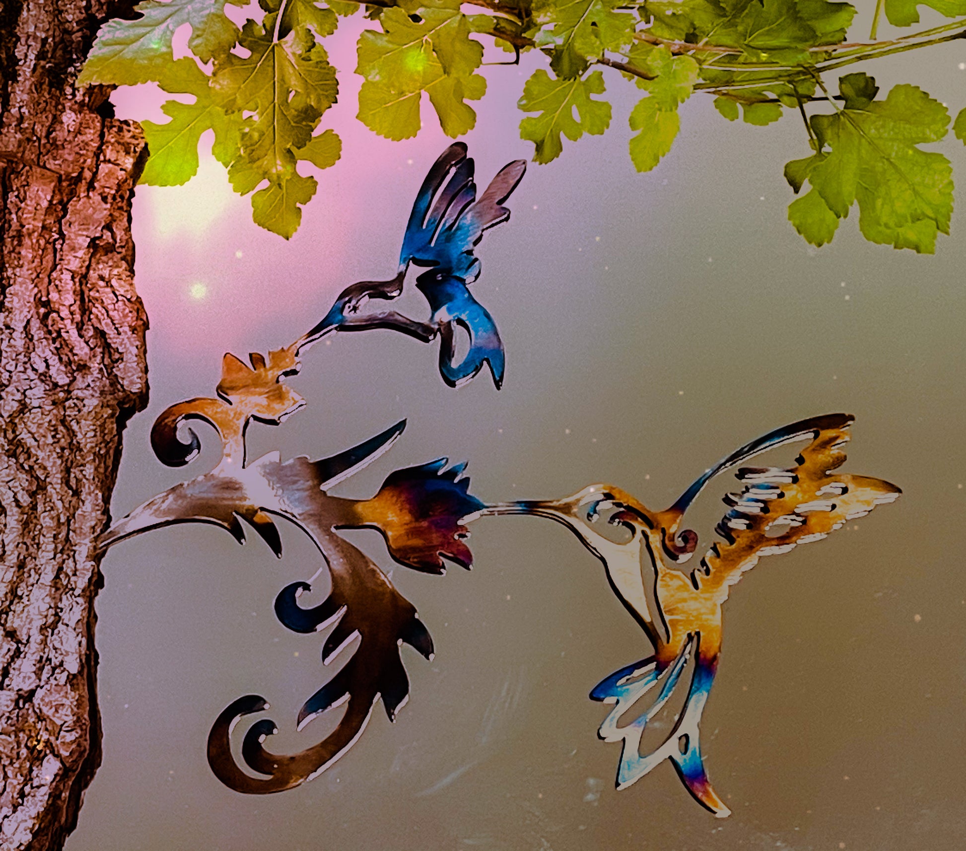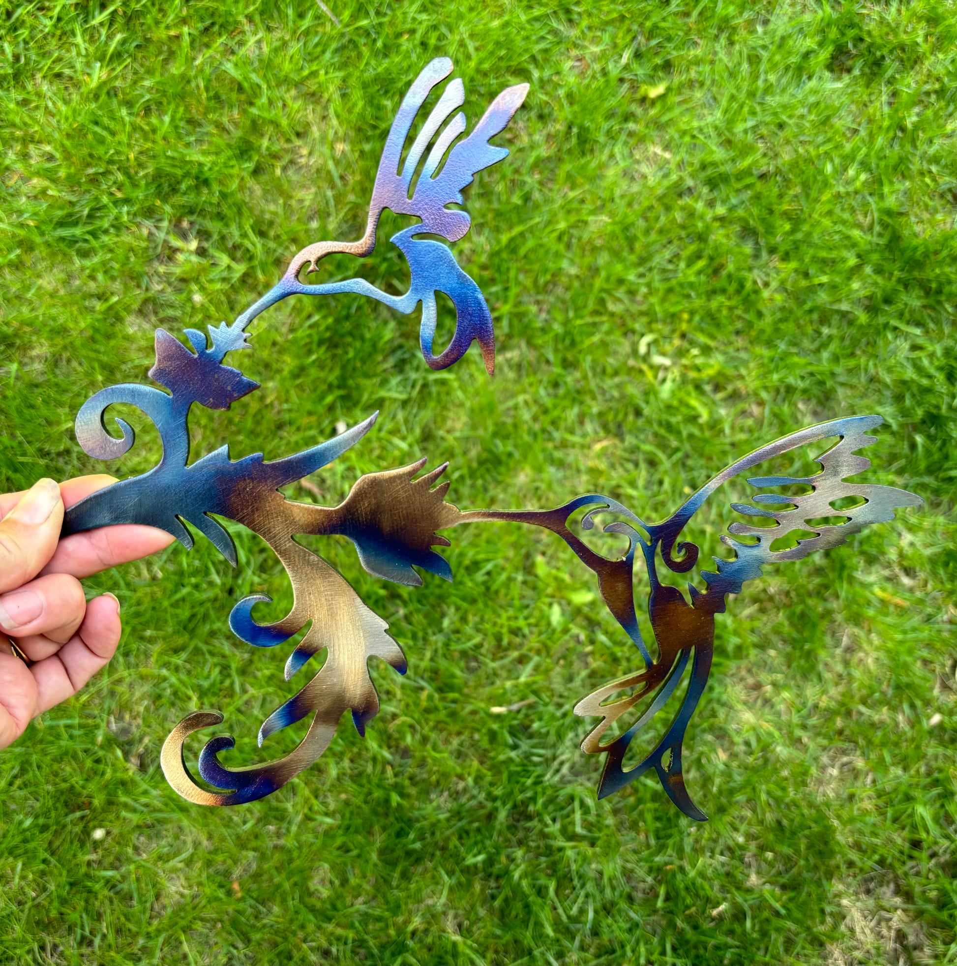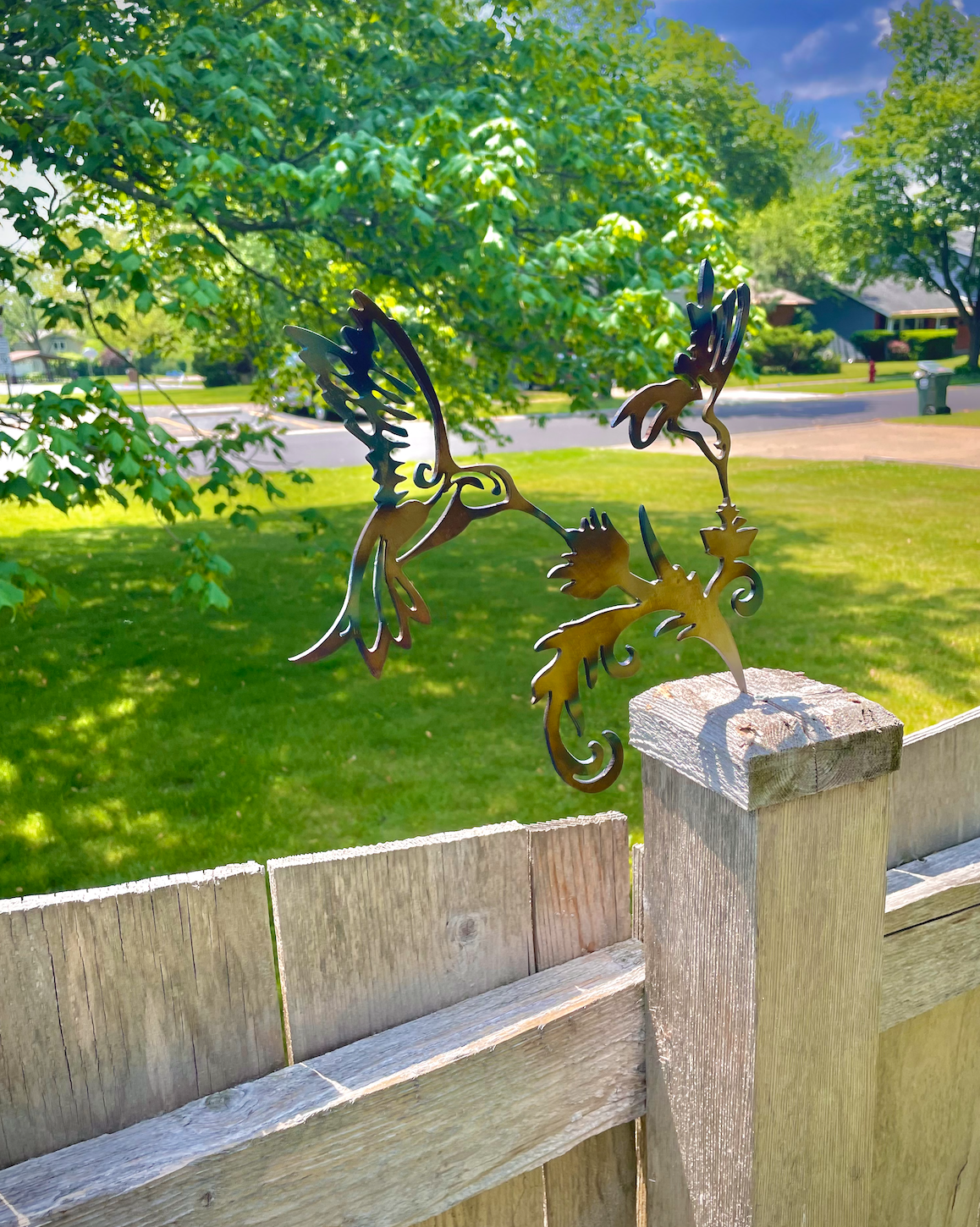 Choose between flame-painted or a raw metal finish (will develop a rusted patina). Because each hummingbird is flame painted by hand, your piece may look slightly different than the one pictured and may have some slight imperfections. Questions about finishes? Click here.