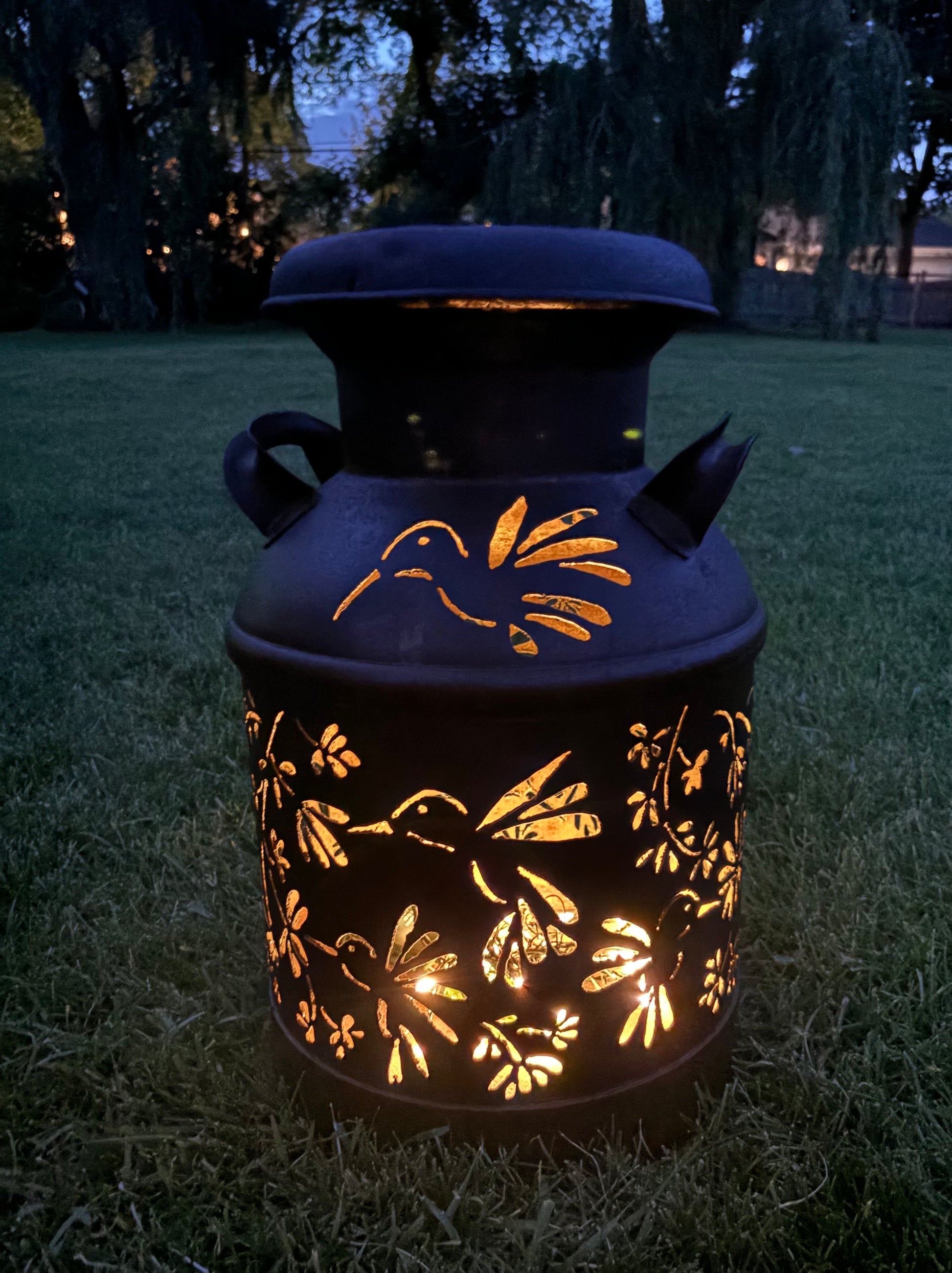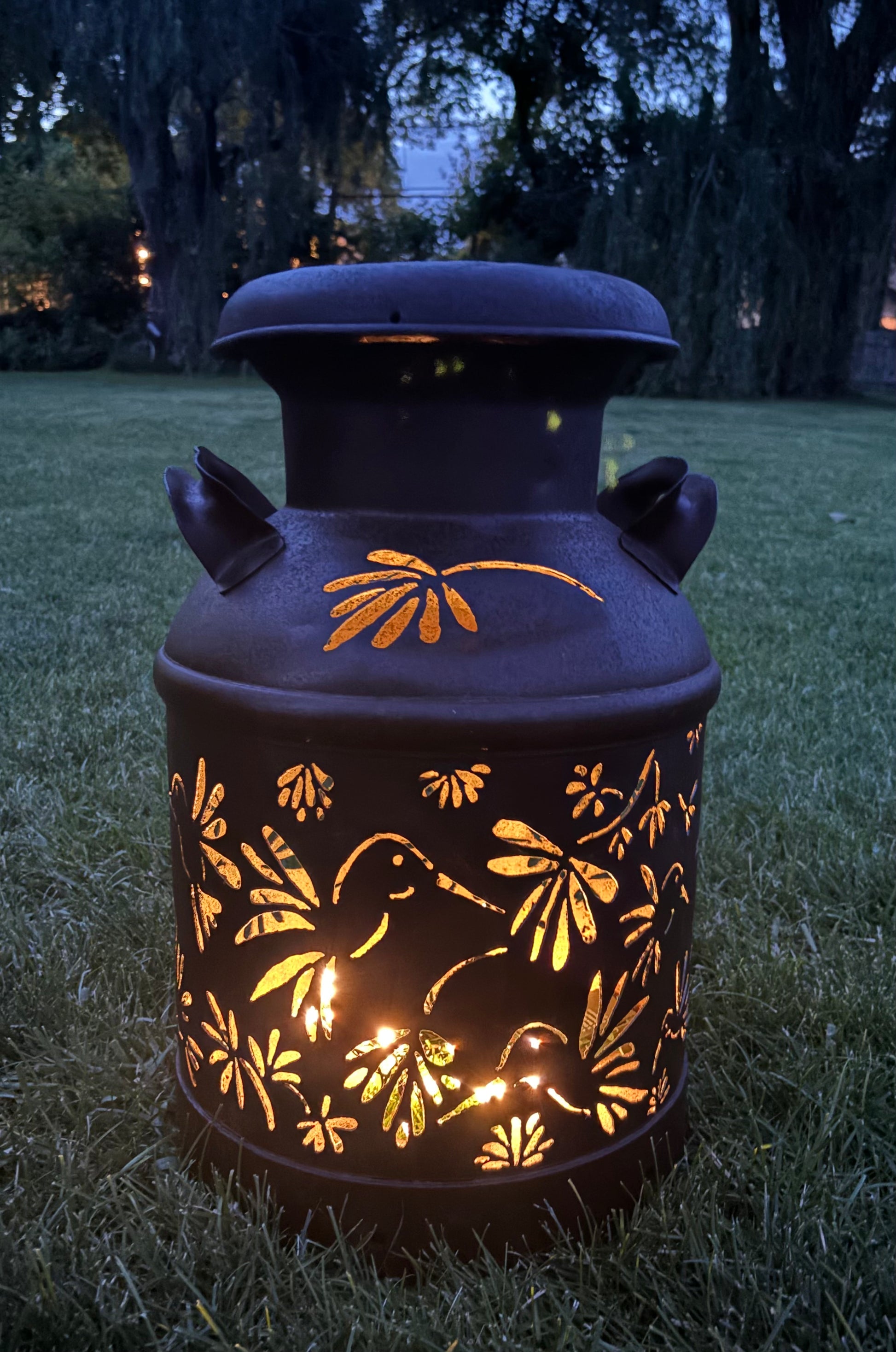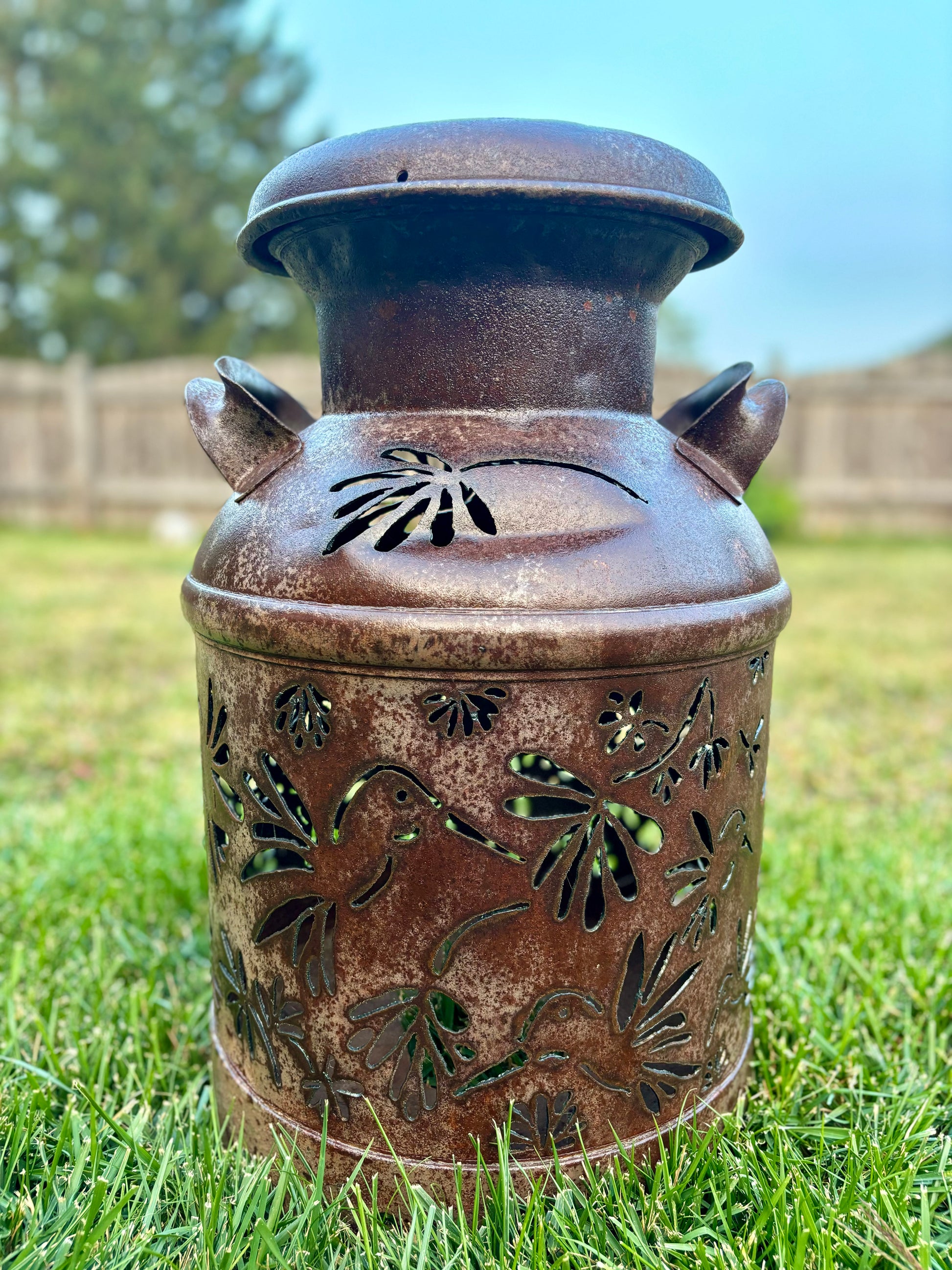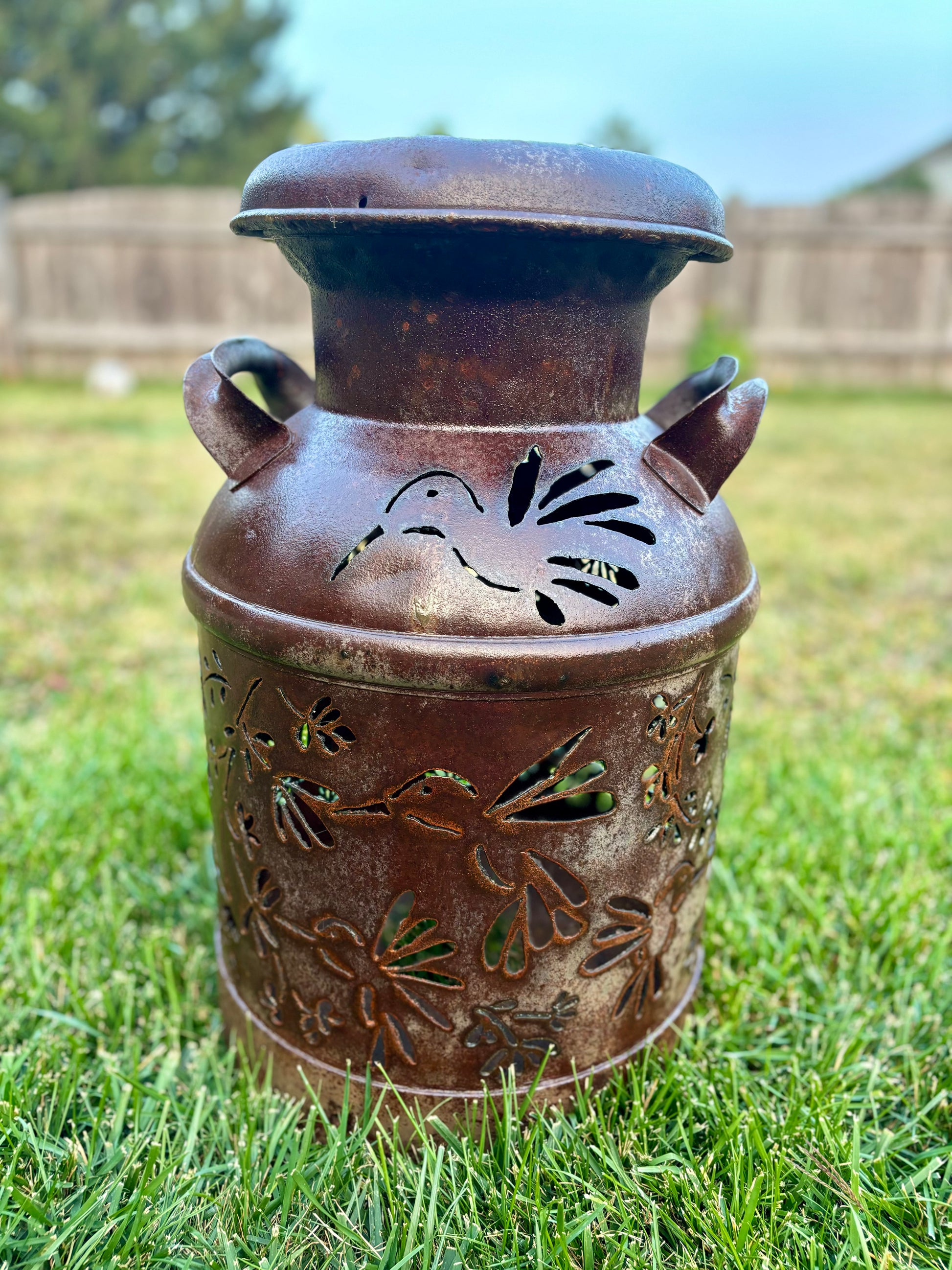 Brighten up your favorite spot with this intricately hand-cut vintage milk can displaying a flower and hummingbird design.