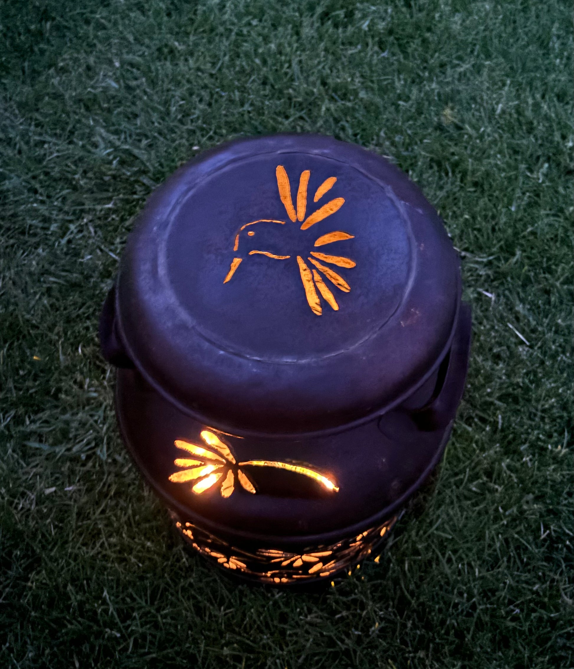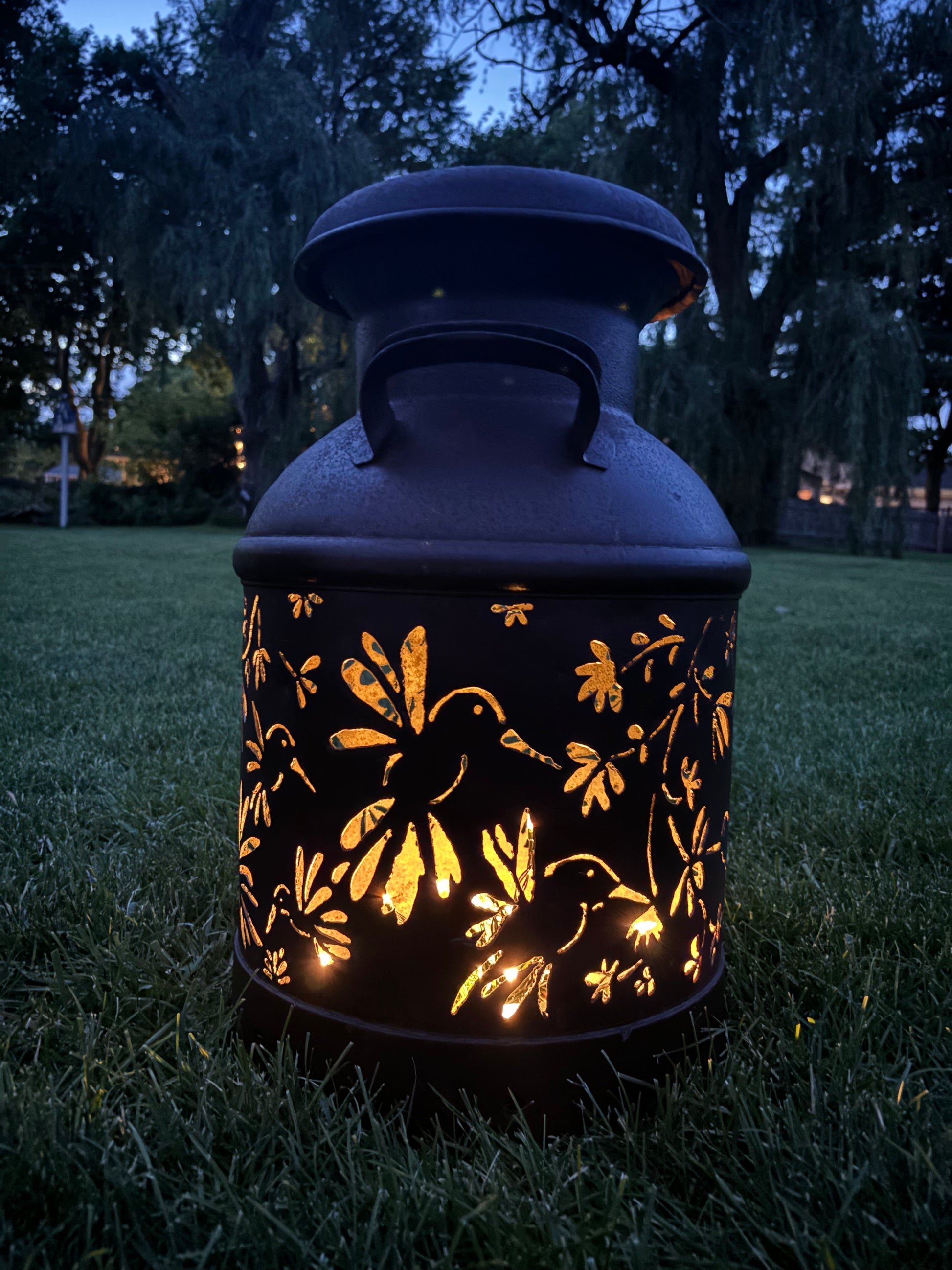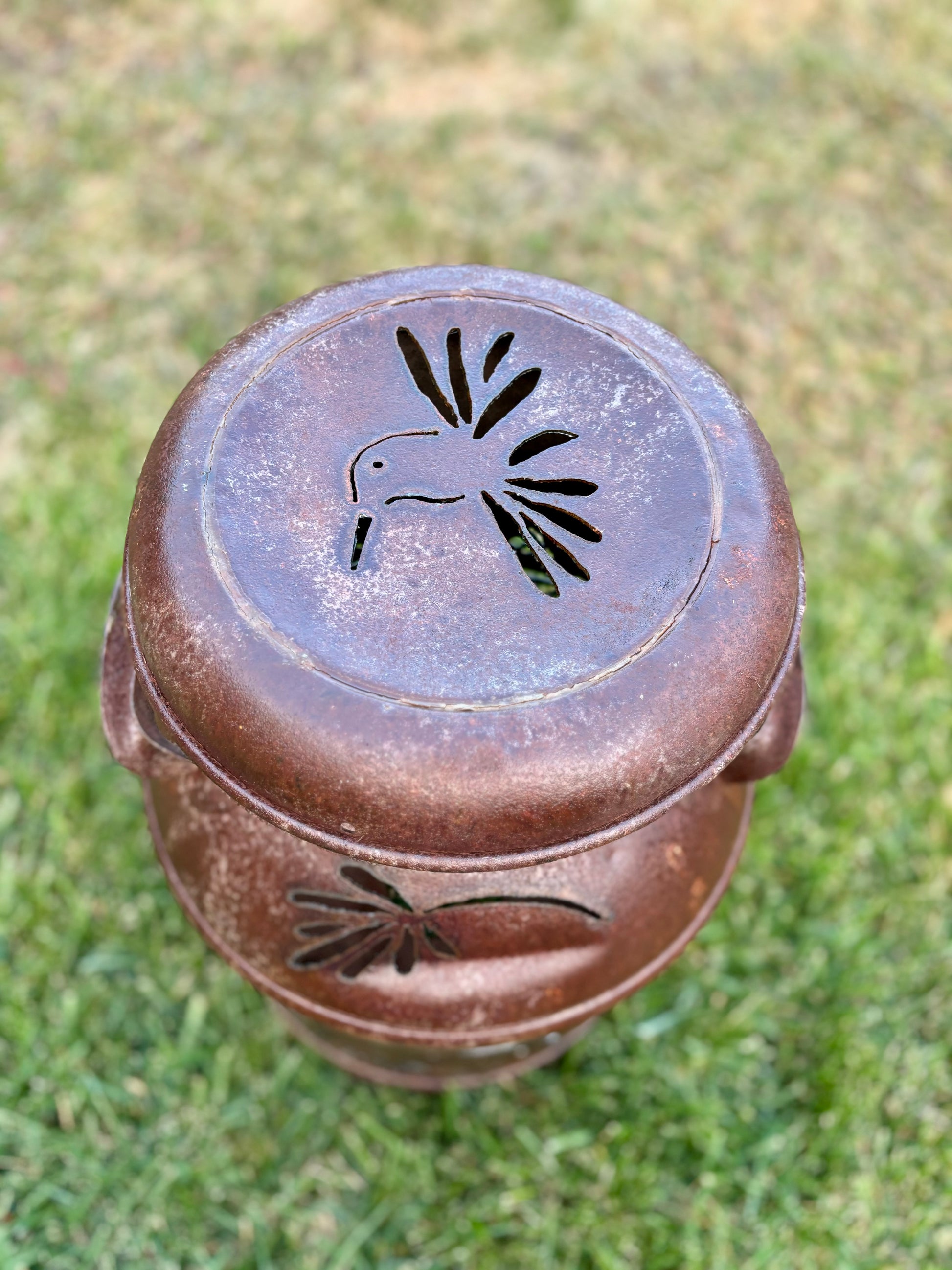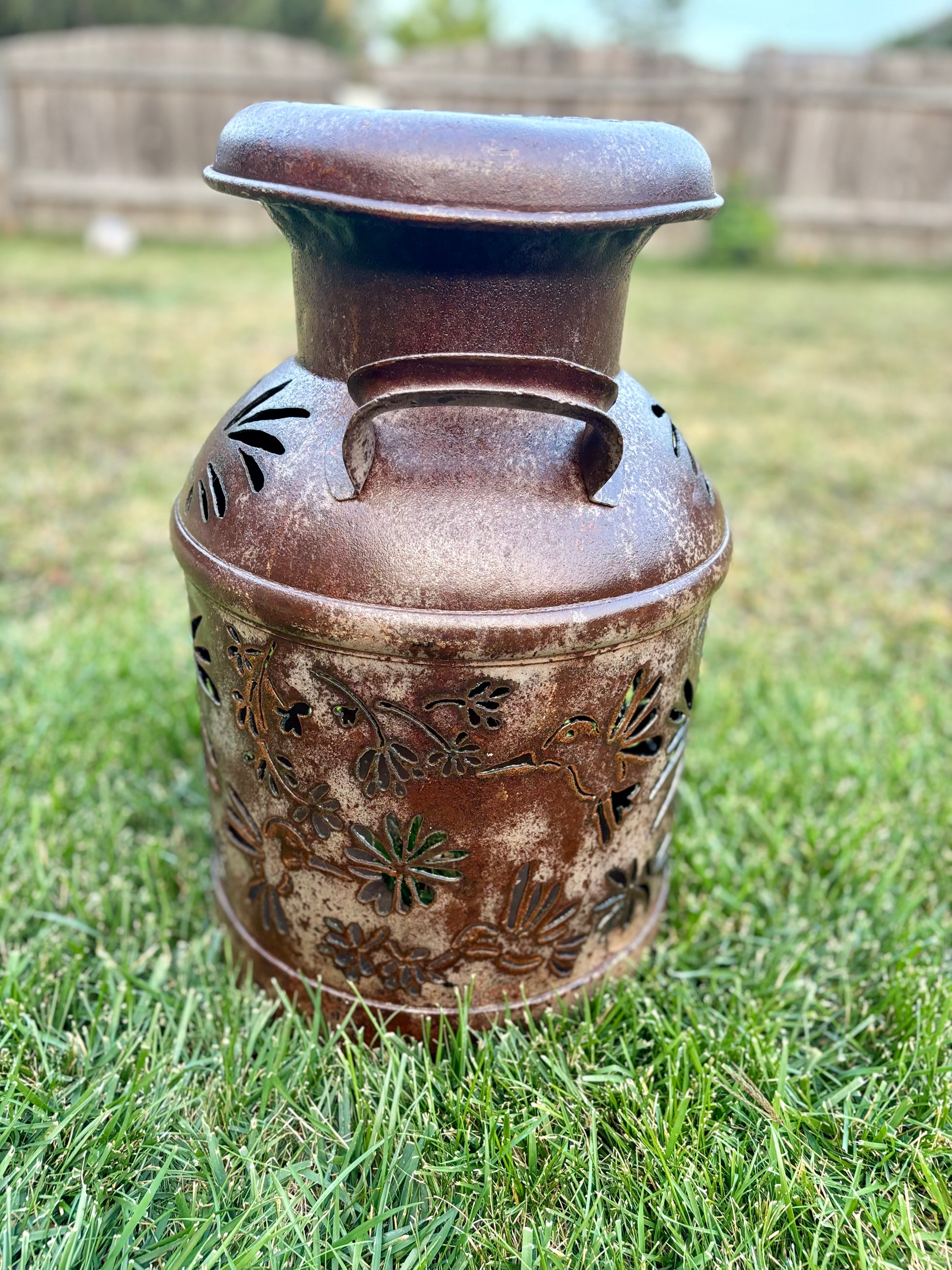 Brighten up your favorite spot with this intricately hand-cut vintage milk can displaying a flower and hummingbird design.