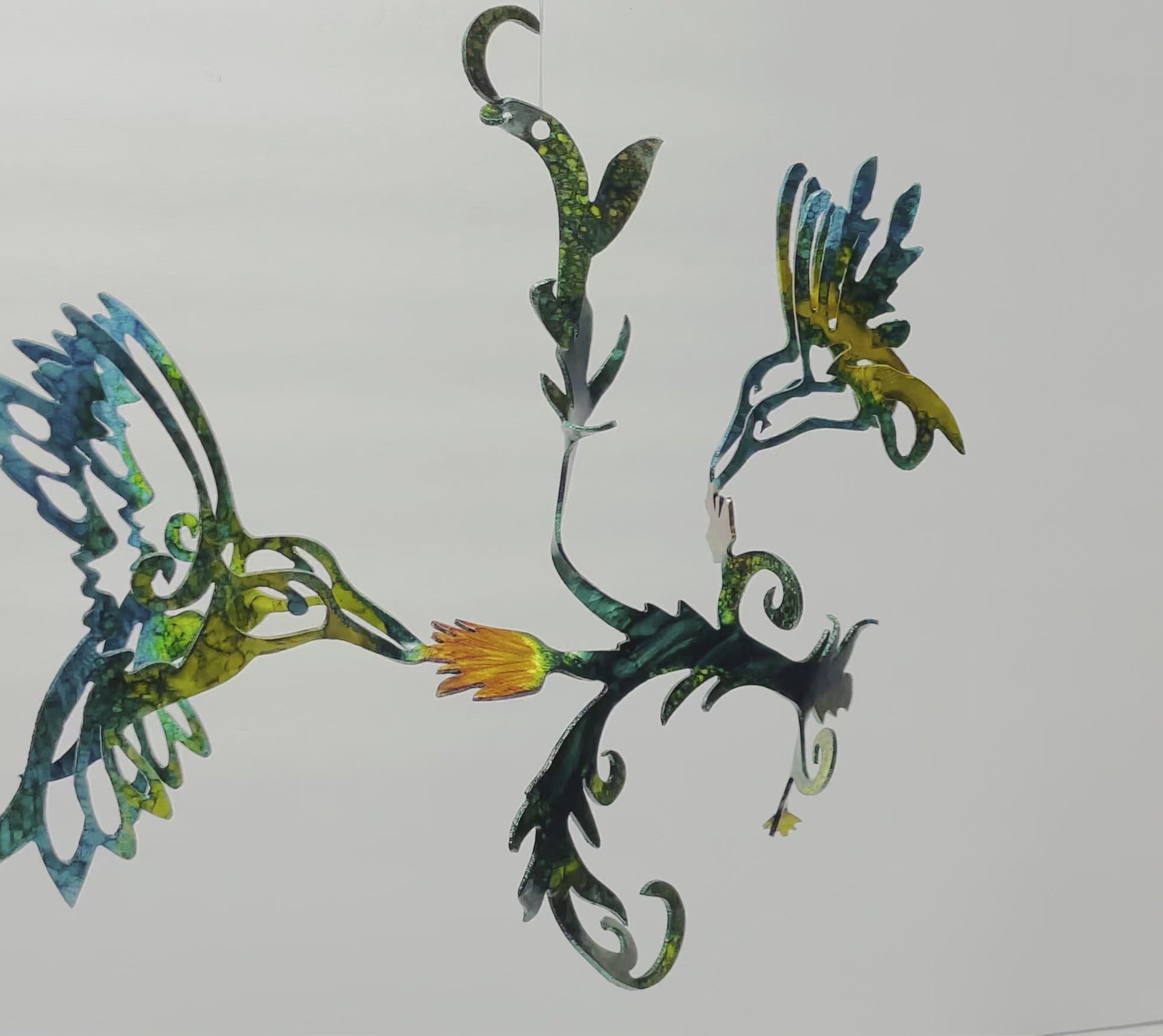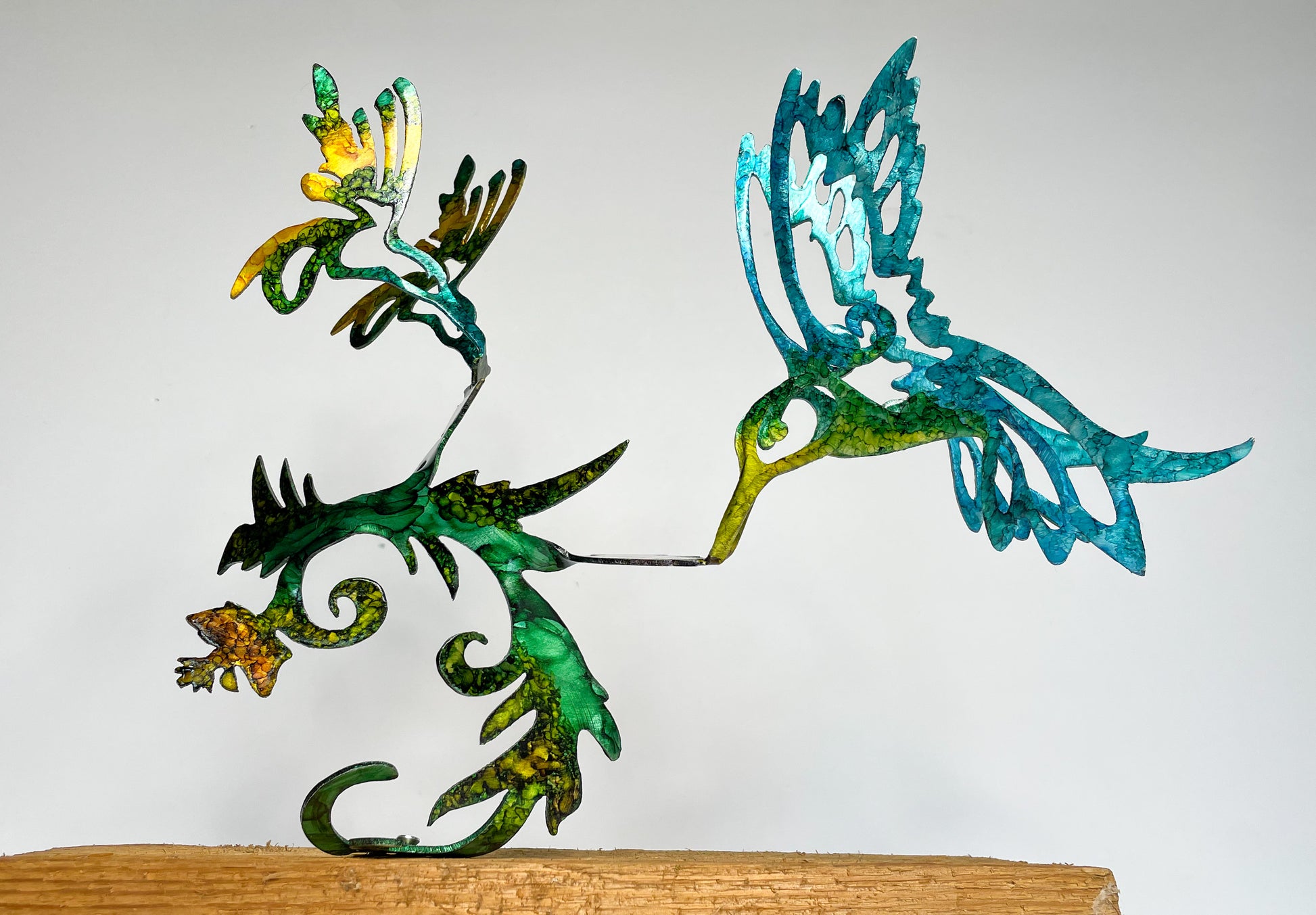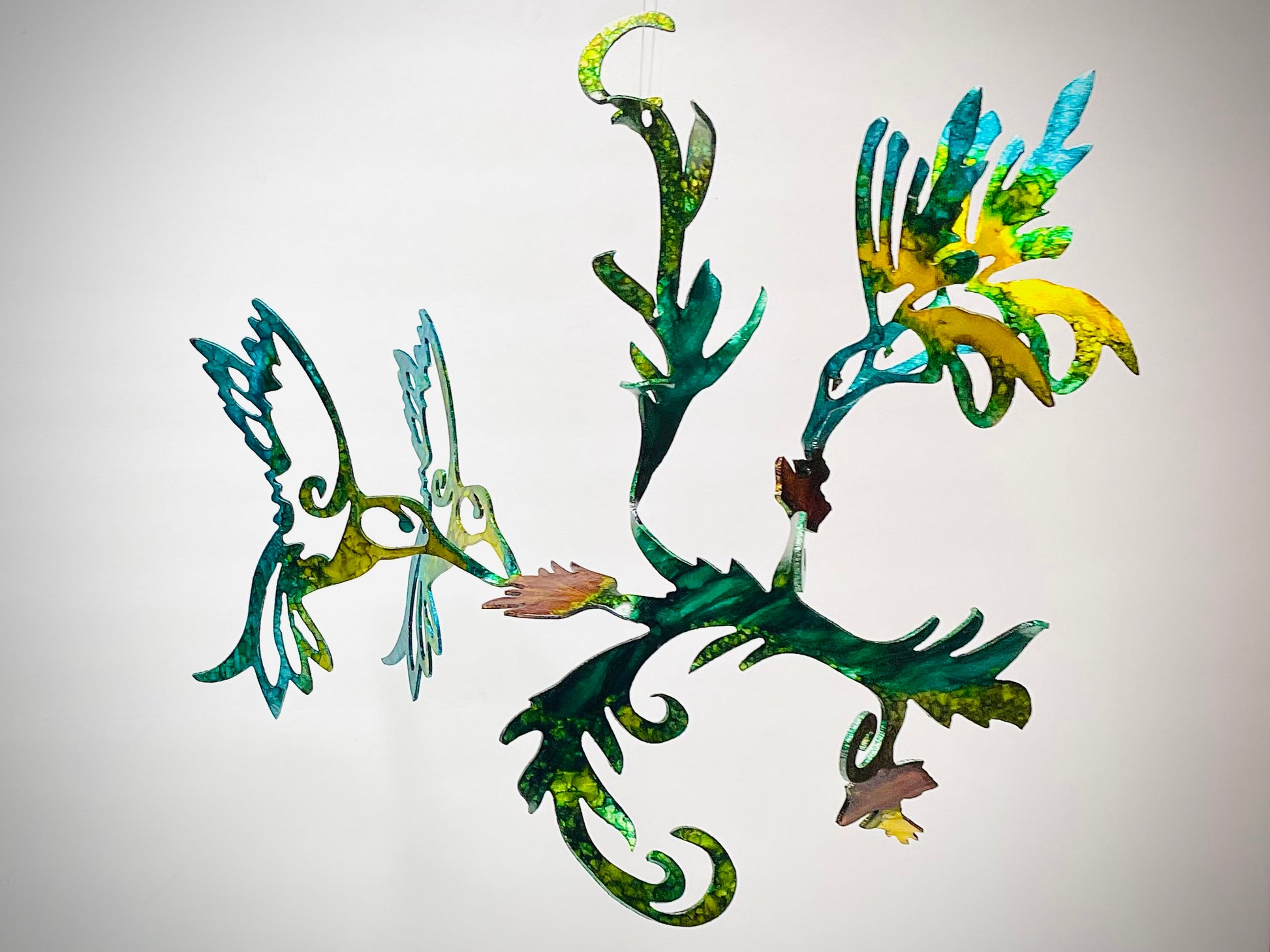 This piece is made to order, so please allow up to 7 days for your hummingbirds to be created. There will be variations in color and how it is shaped because each one is created by hand. If there are colors you want me to focus on, please include it in the notes to seller when you checkout. Made from aluminum, no need to worry about rust. Cut and bent to shape. Painted with metal dyes and clear coated for extra protection.