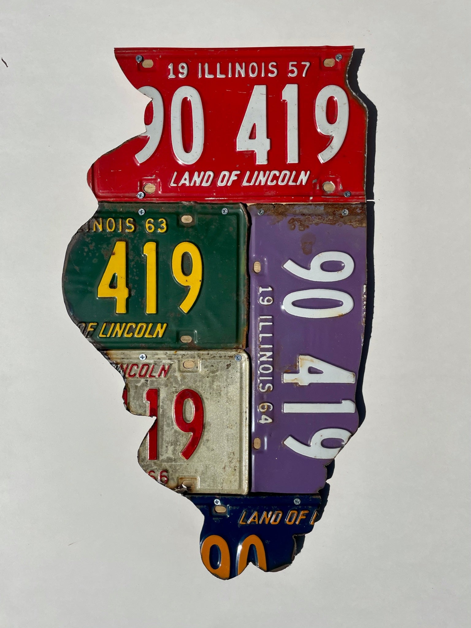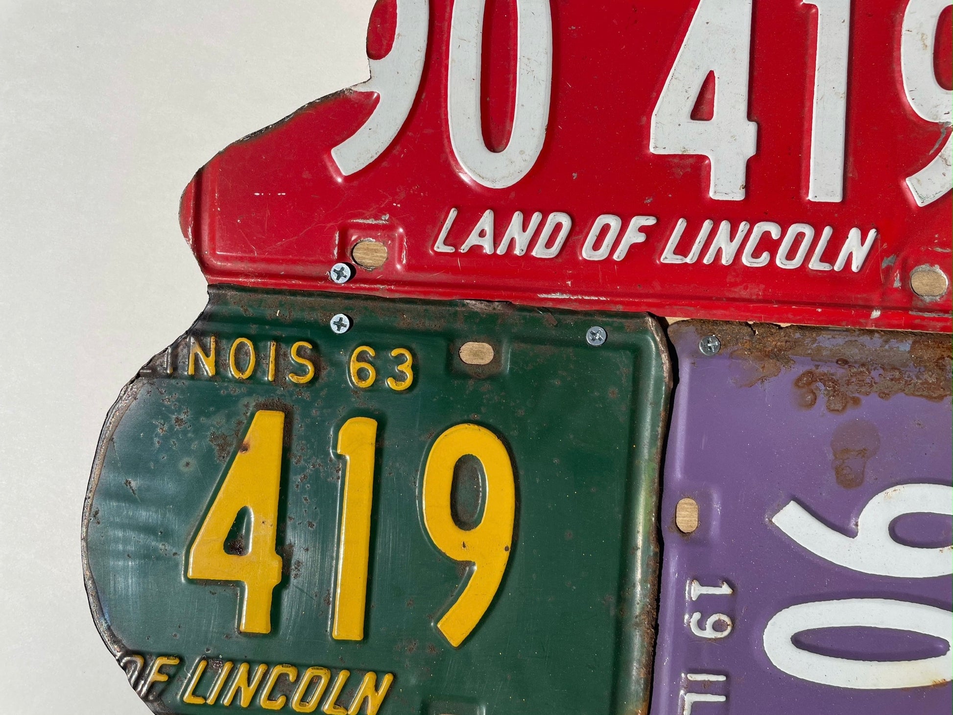 Enjoy this one-of-a-kind GENUINE Illinois license plate wall art. These plates all have the same license plate number 90419 from 1957, 1959, 1960, 1963, 1967. (The year cannot be seen on the 1960 plate because of the shape of the sign.) The license plates have been mounted onto a .5" wood board with a sawtooth picture hanger installed. The license plates have been hand cut with a plasma torch giving them a burnt edge, which adds to the artistic interest of this piece. Because these license plates are original and have been used on a vehicle, they are bent and rusted in some places.