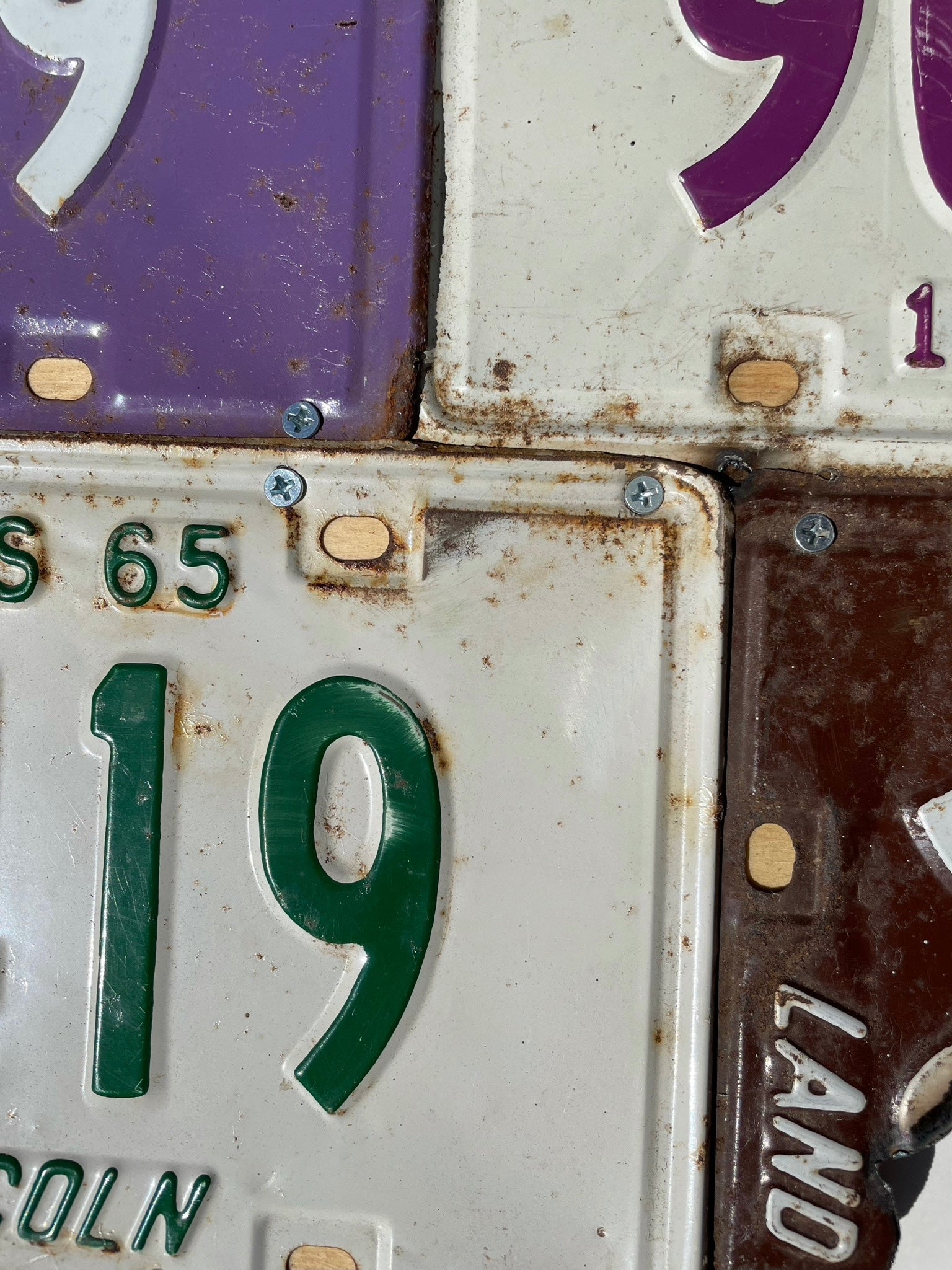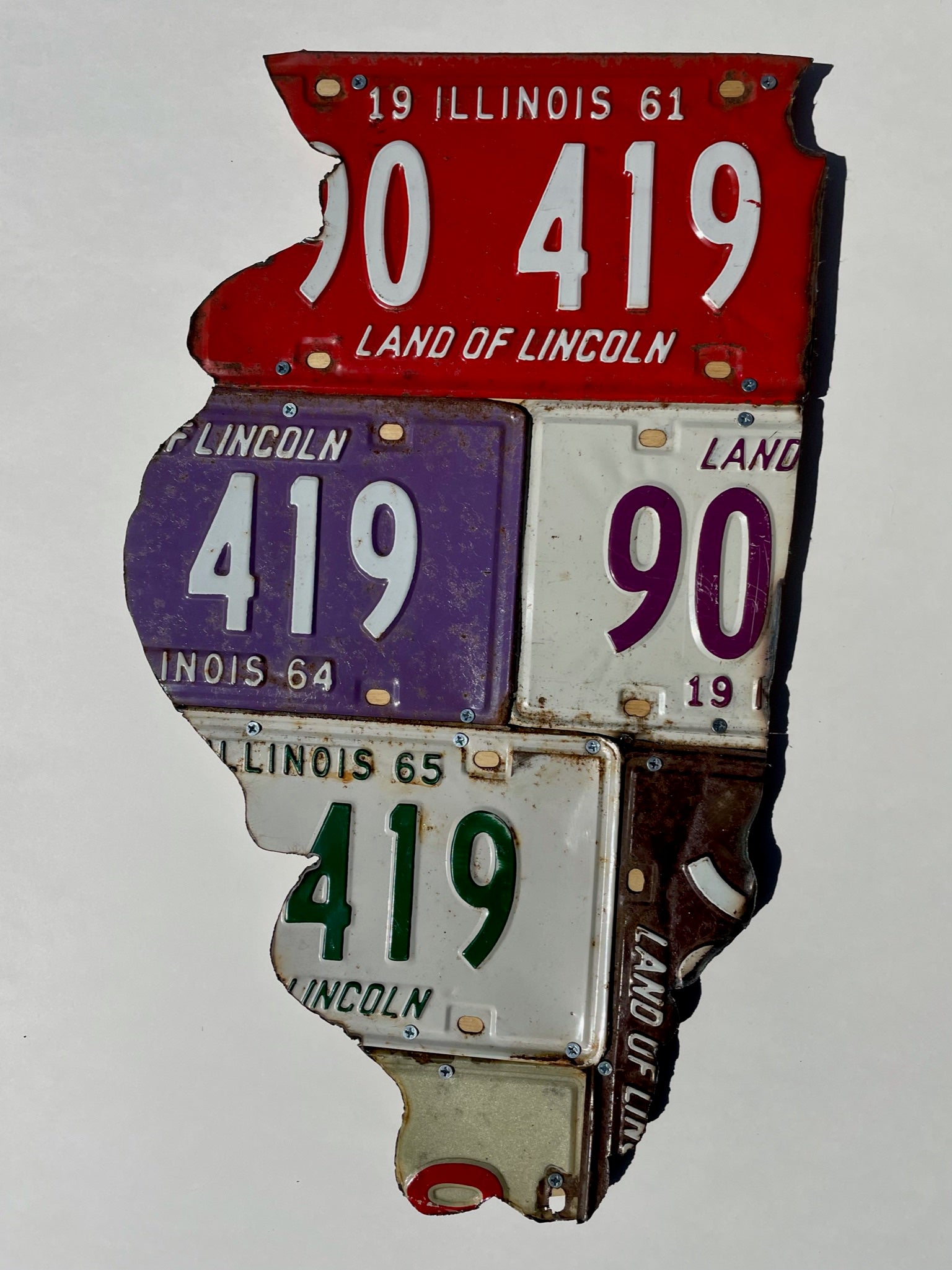 Enjoy this one-of-a-kind GENUINE Illinois license plate wall art. These plates all have the same license plate number 90419 from 1958, 1959, 1961, 1964, 1965, and 1968. (The year cannot be seen on all plates because of the shape of the sign.) The license plates have been mounted onto a .5" wood board with a sawtooth picture hanger installed. The license plates have been hand cut with a plasma torch giving them a burnt edge, which adds to the artistic interest of this piece. Because these license plates are original and have been used on a vehicle, they are bent and rusted in some places.