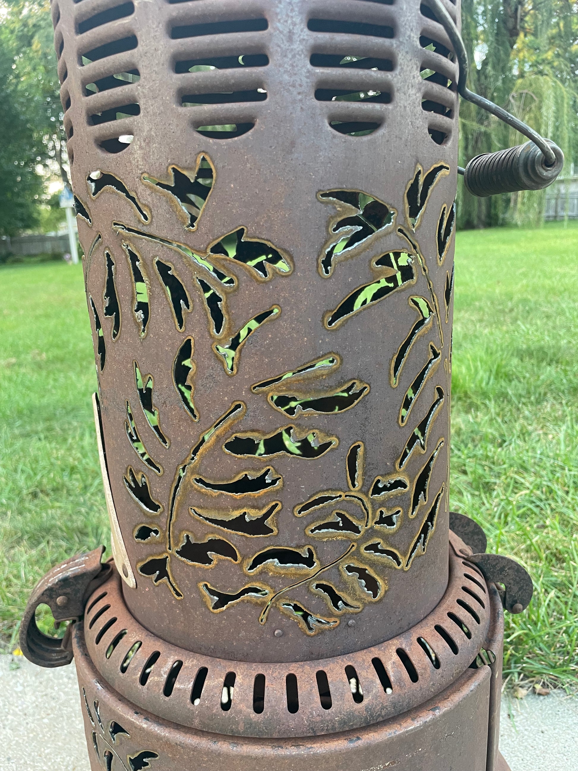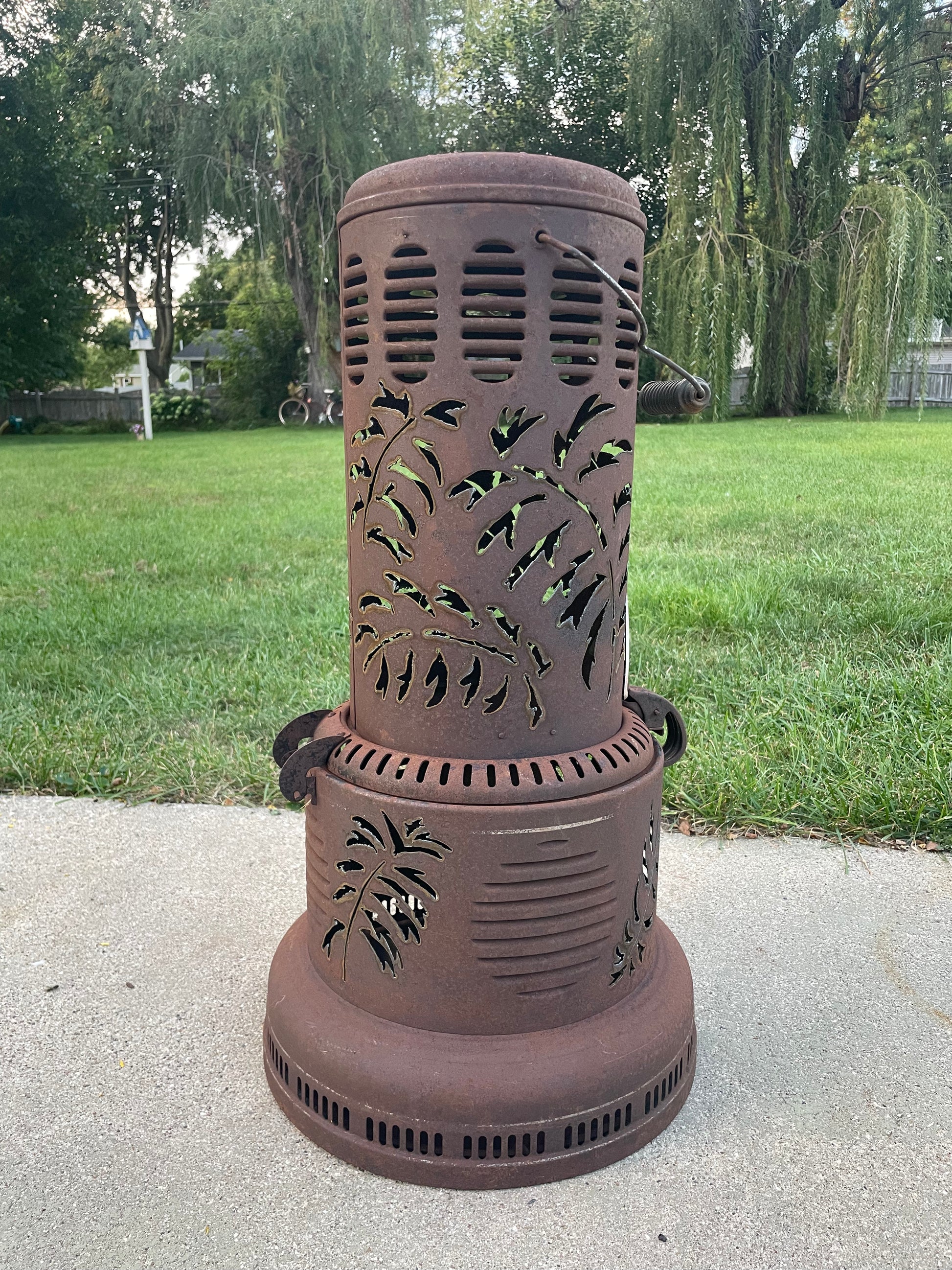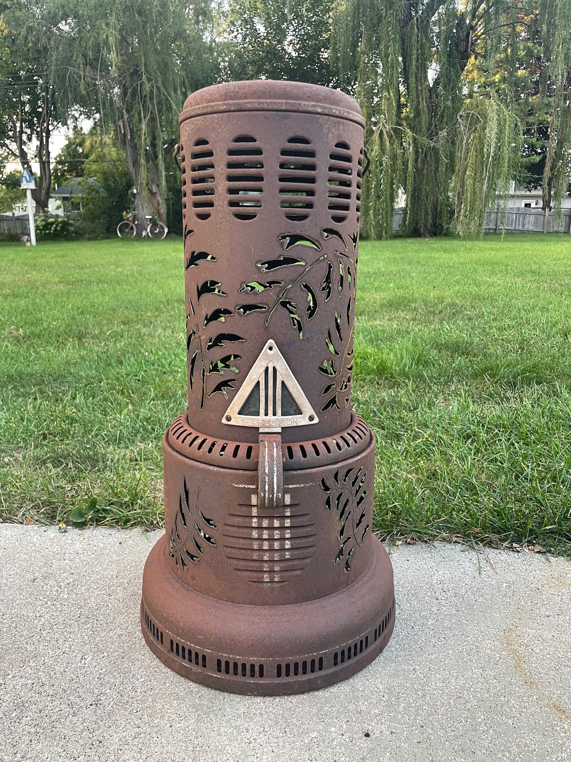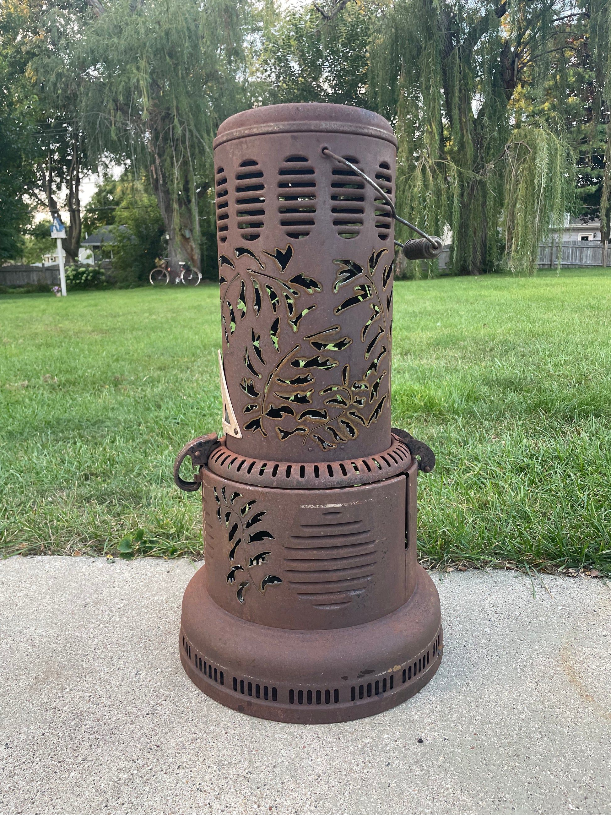 This beauty is a vintage Perfection Oil Heater/Parlor Stove, hand cut with an intricate design, and will bring an element of old-fashioned class to your space. The heater easily opens up so that a string of battery-operated lights (not included) can be added to create a luminary.