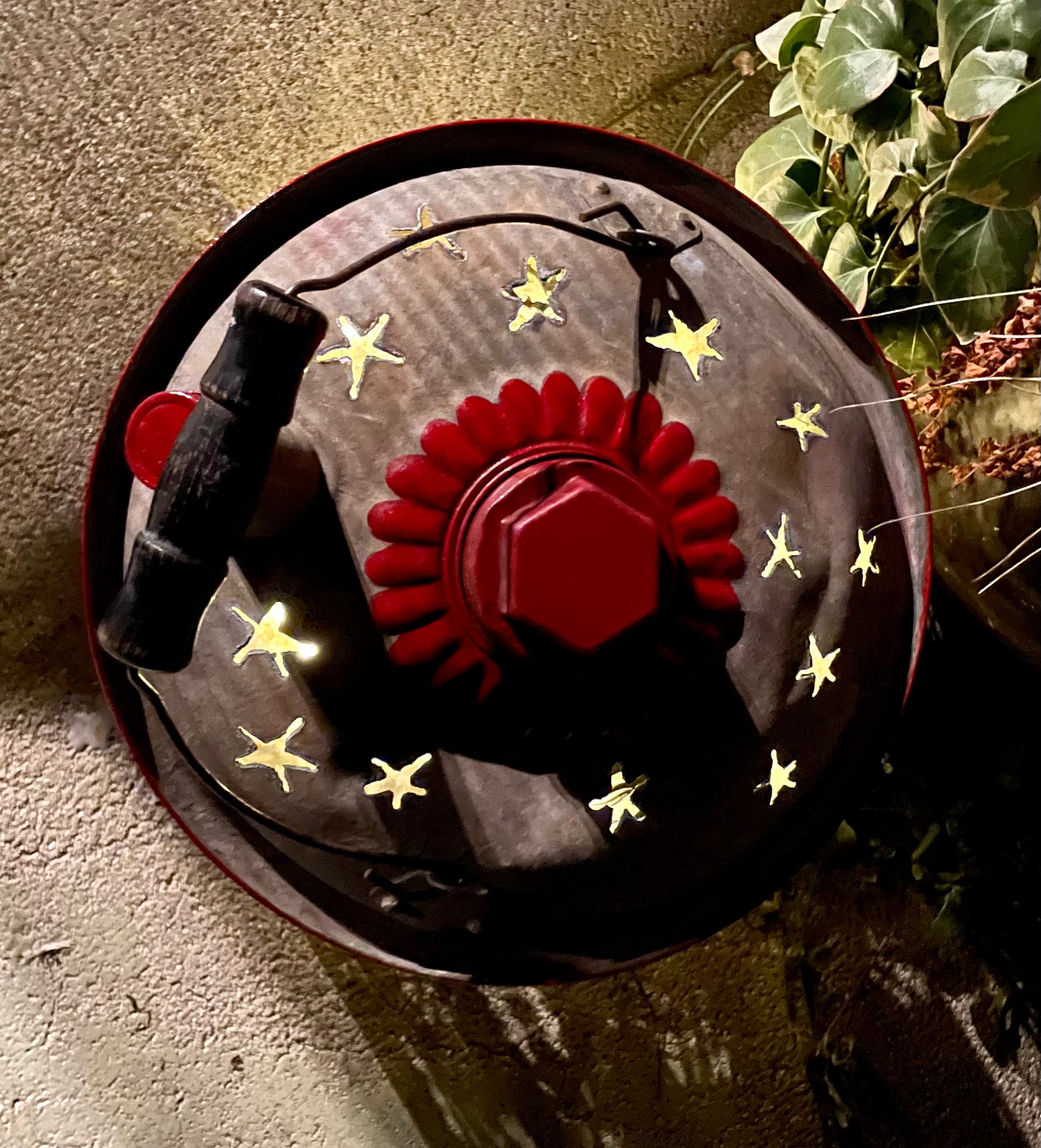 Two stripes of red paint have been freshly applied where the original paint once was. A hole has been cut in the bottom to easily add lighting if you wish.