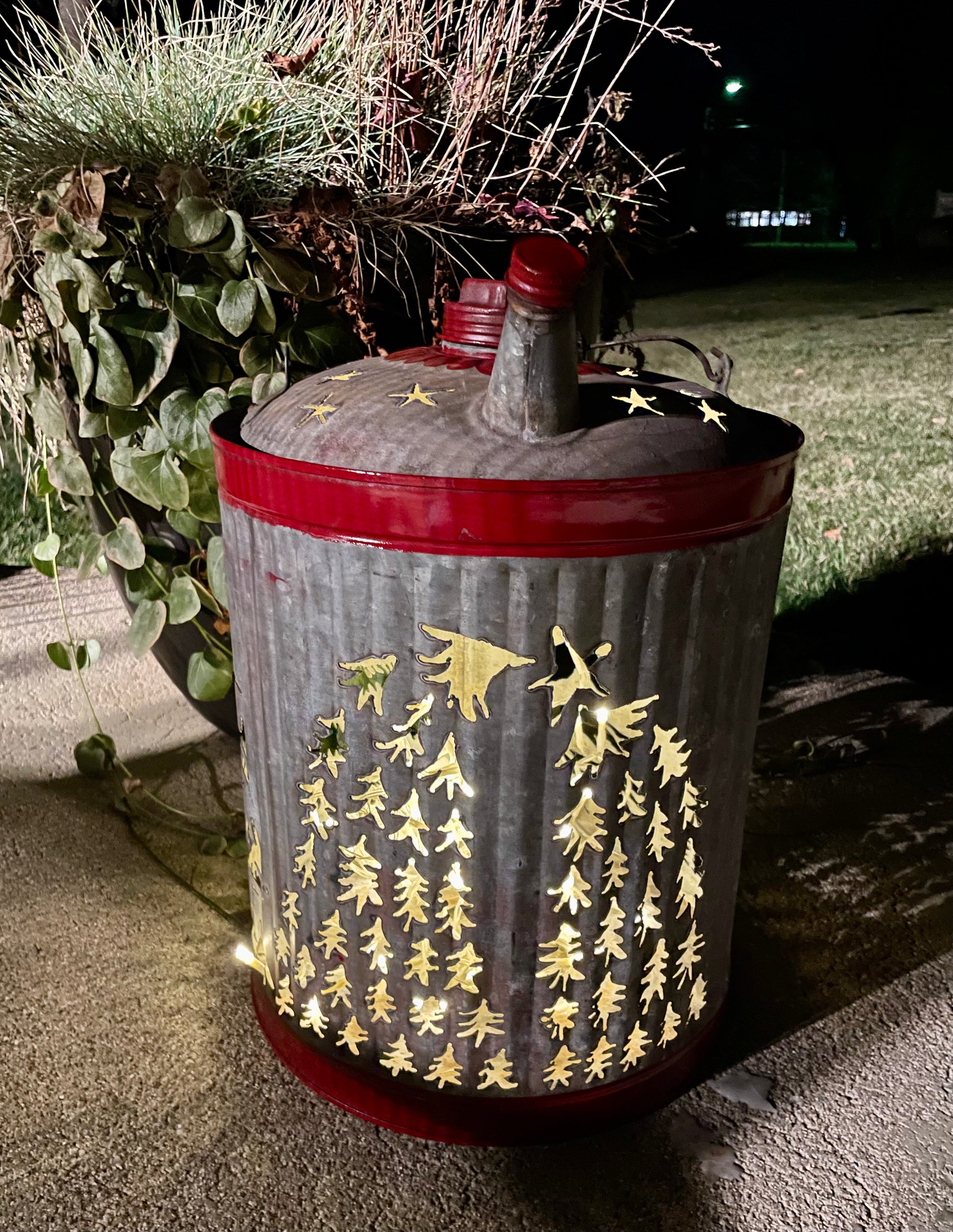 Light up your Christmas season with this vintage galvanized gas can, hand cut, featuring a variety of uniquely designed Christmas trees. Add a string of battery operated lights (not included) to create a luminary.