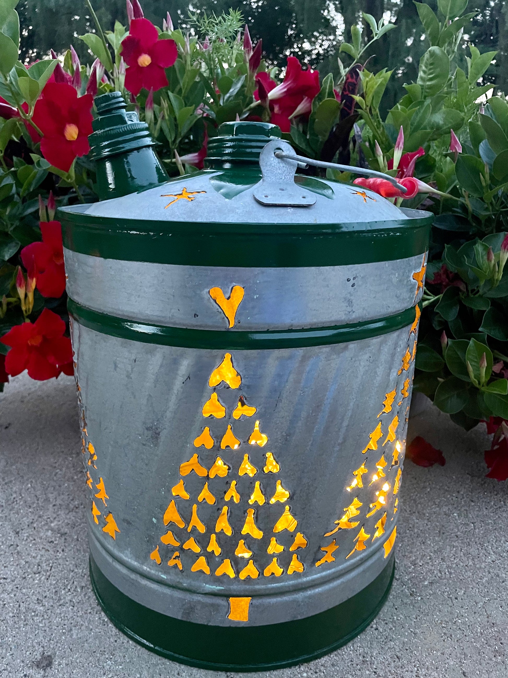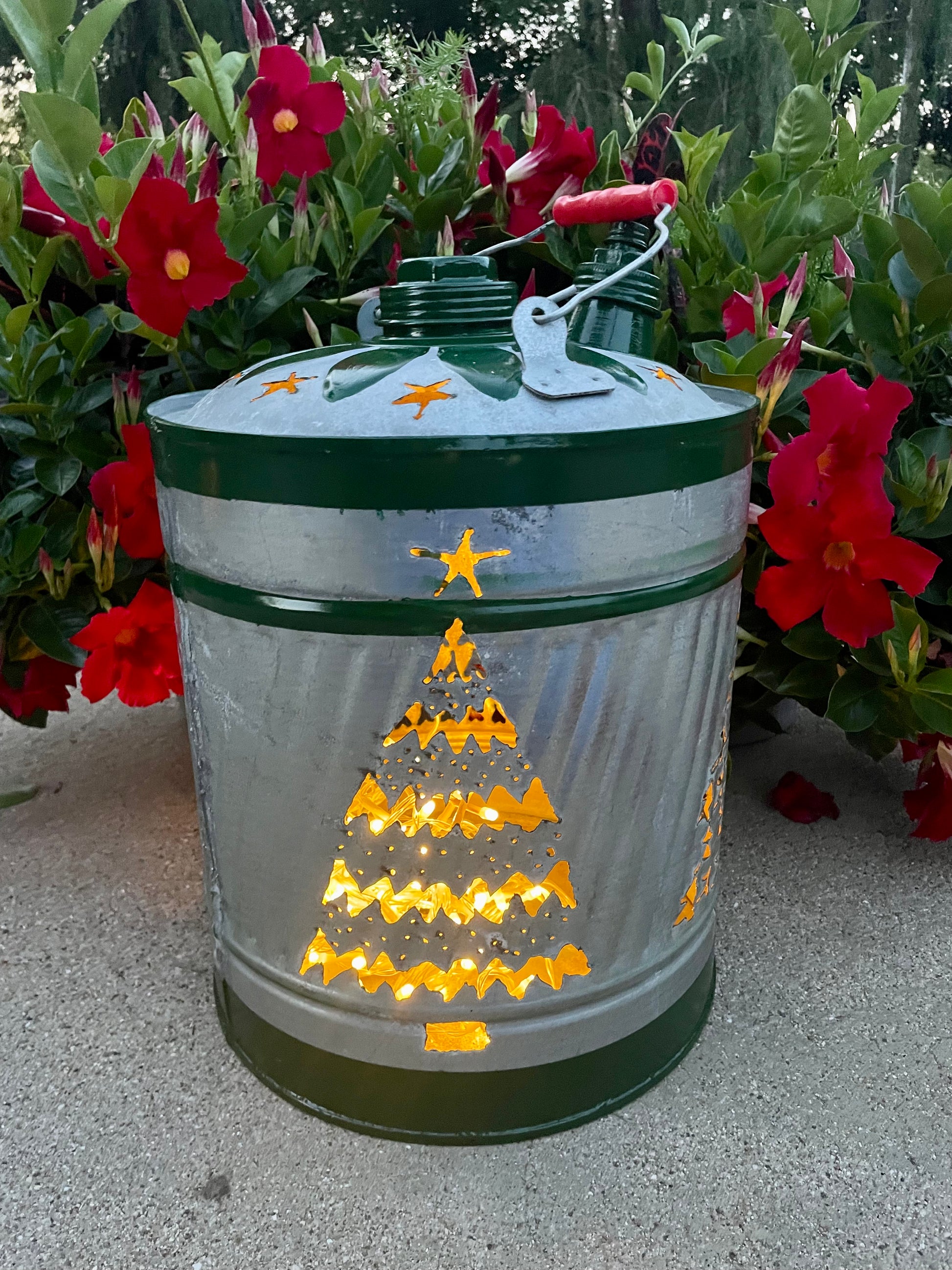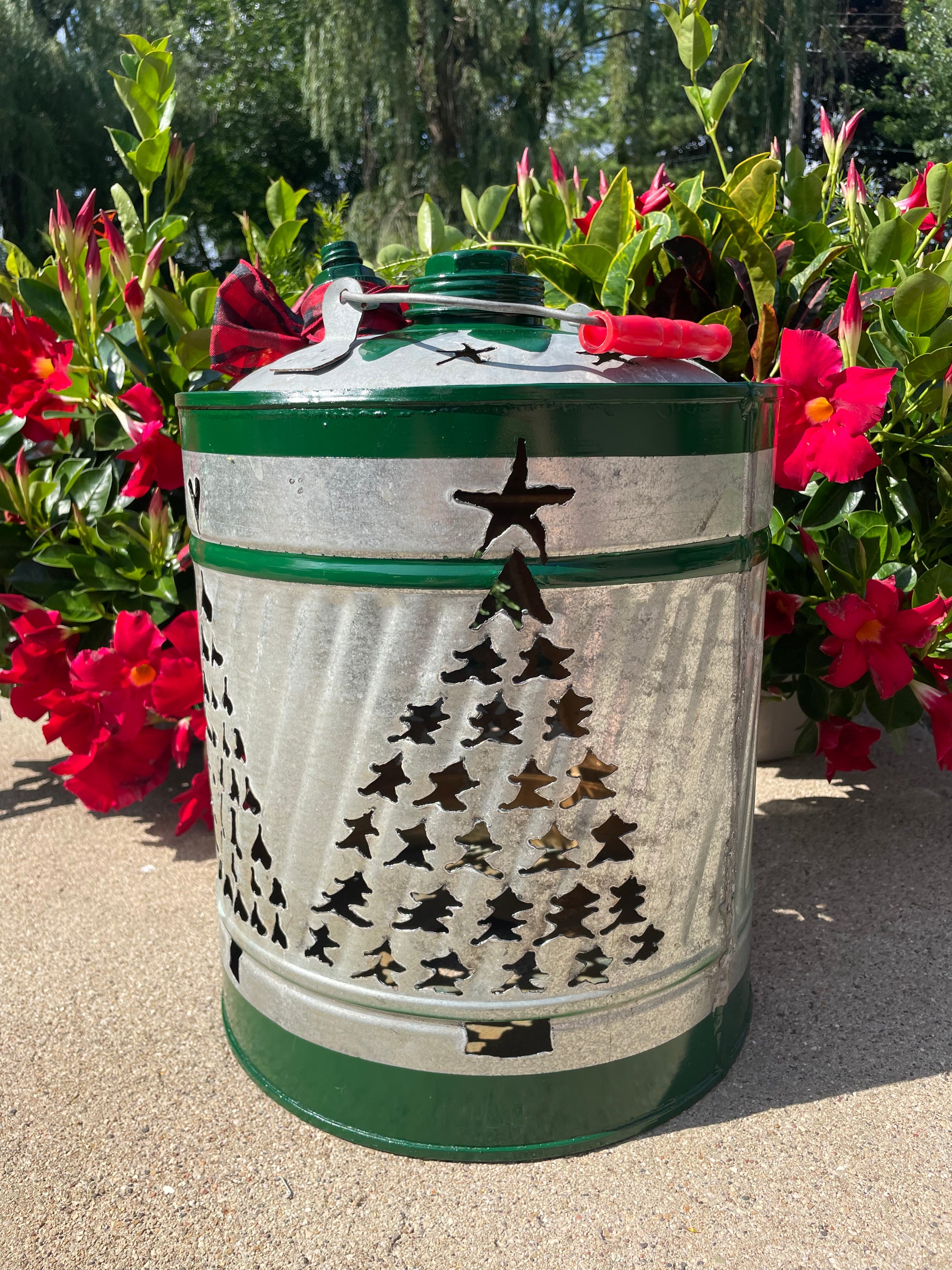 Light up your Christmas season with this vintage 5-gallon galvanized gas can, hand cut, featuring a variety of uniquely designed Christmas trees. Add a string of battery operated lights (not included) to create a luminary.