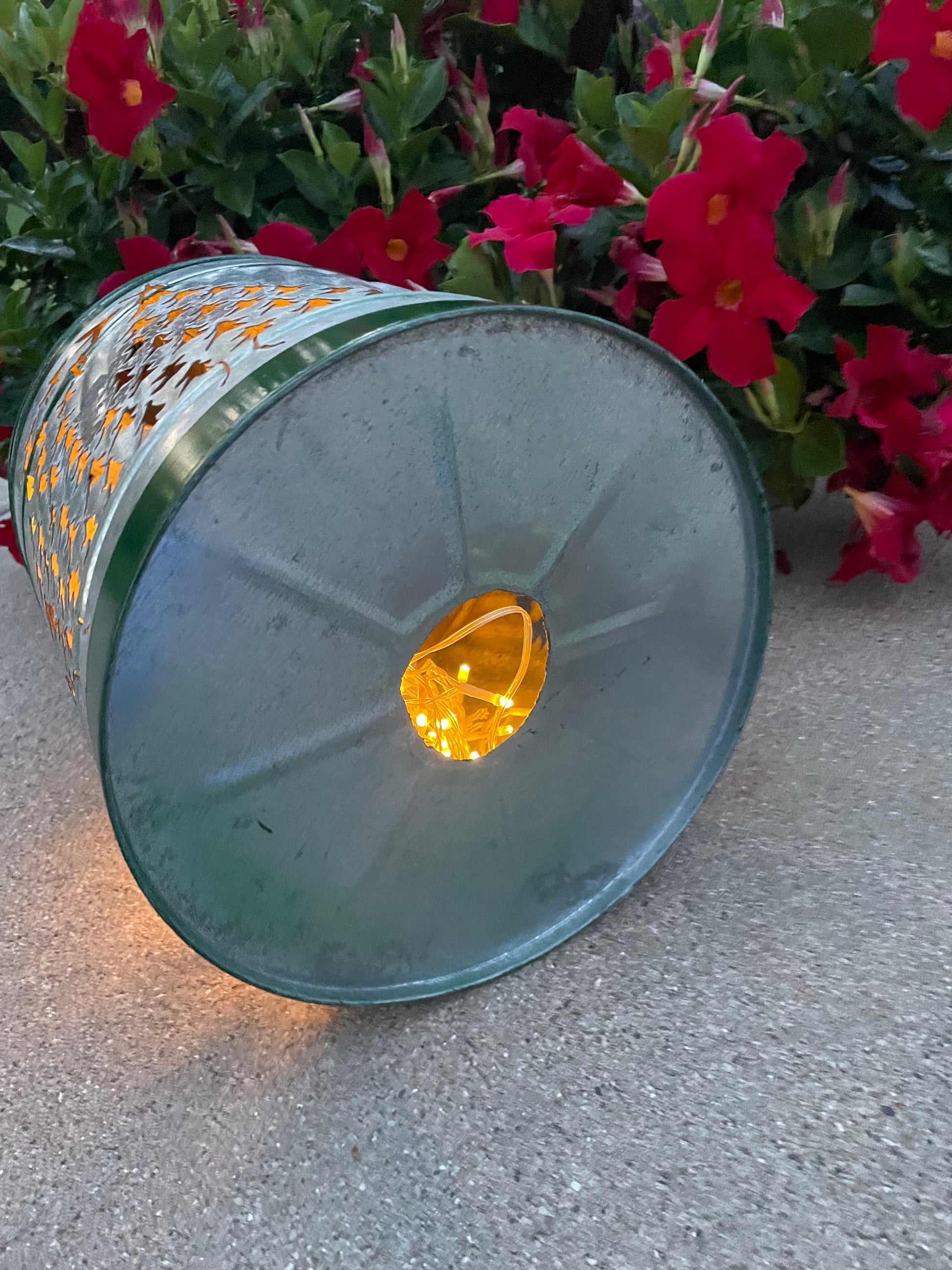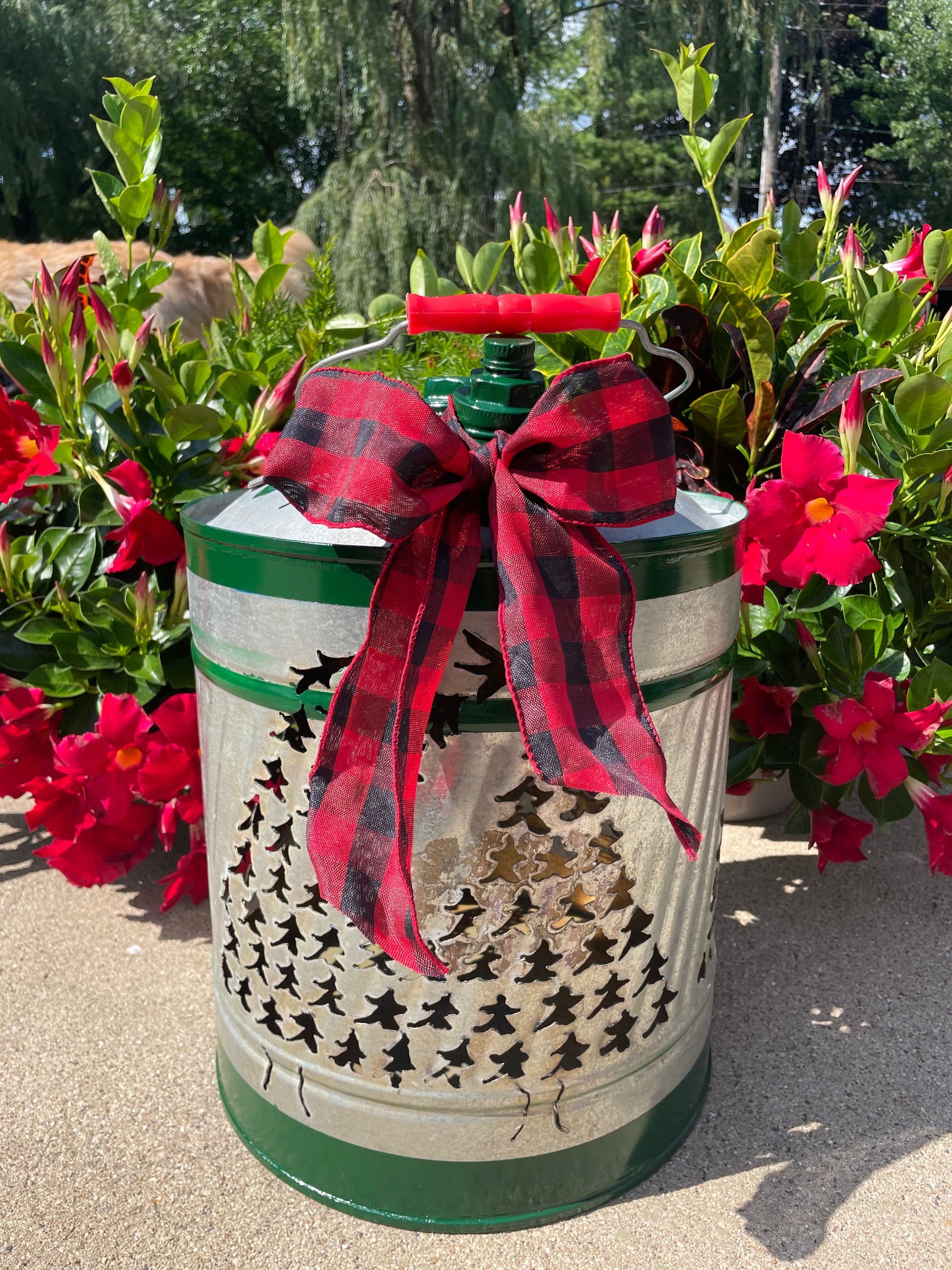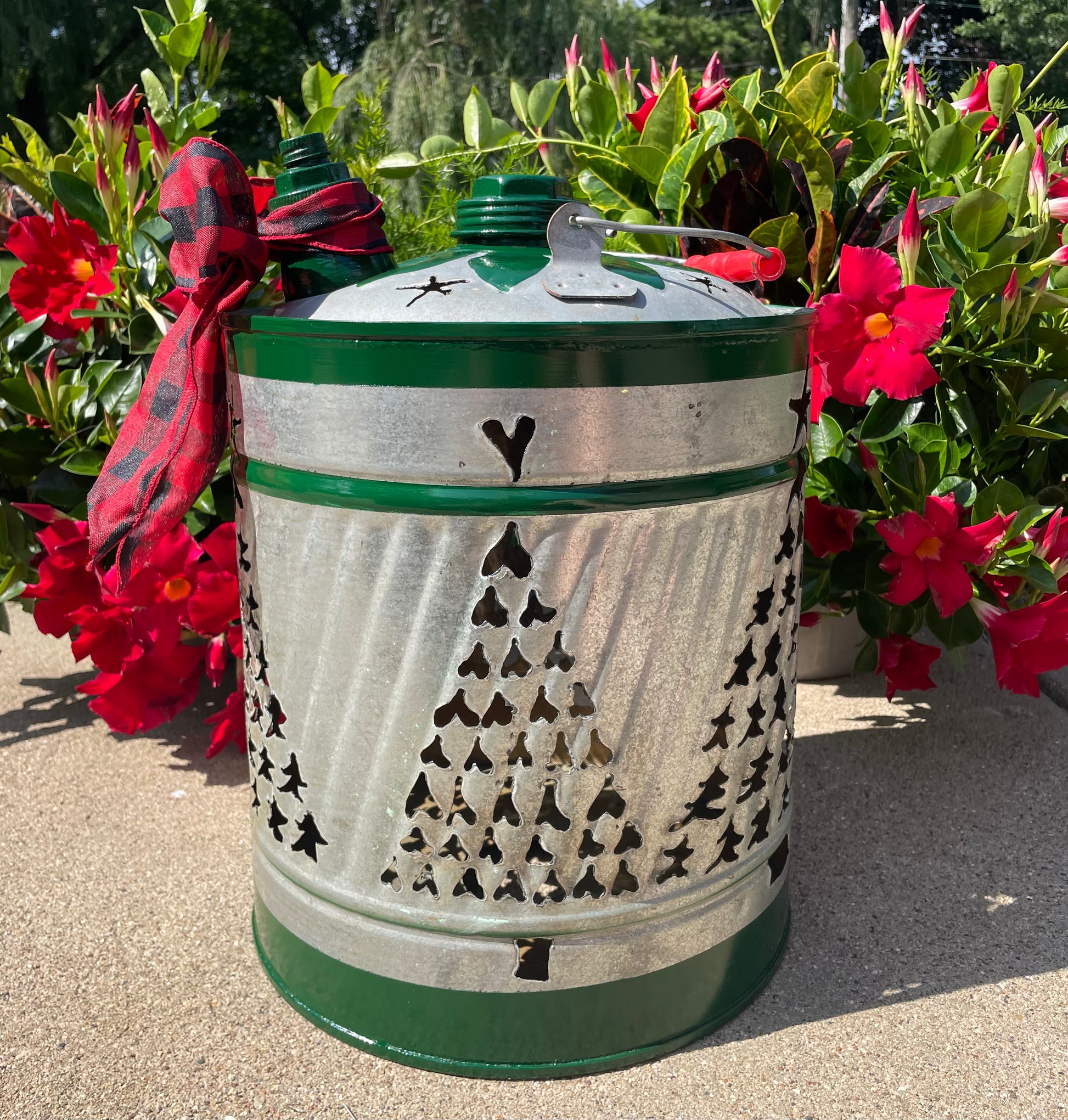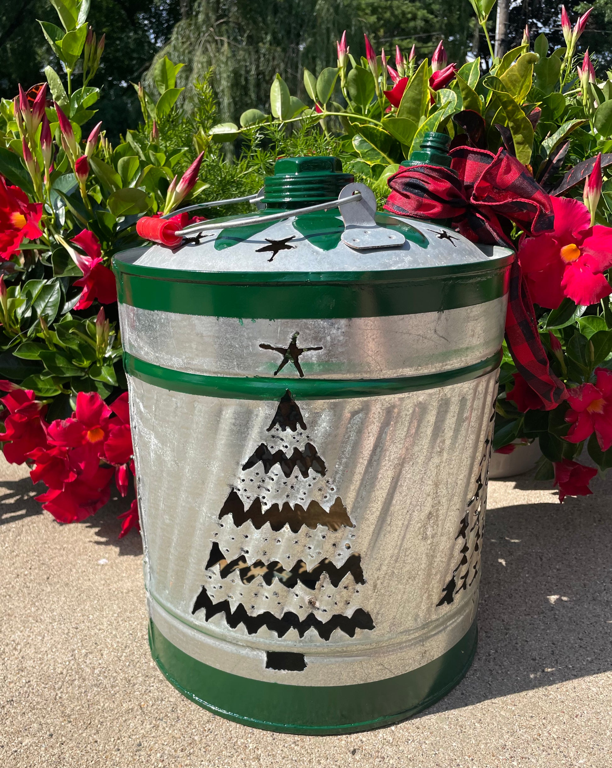 Light up your Christmas season with this vintage 5-gallon galvanized gas can, hand cut, featuring a variety of uniquely designed Christmas trees. Add a string of battery operated lights (not included) to create a luminary.