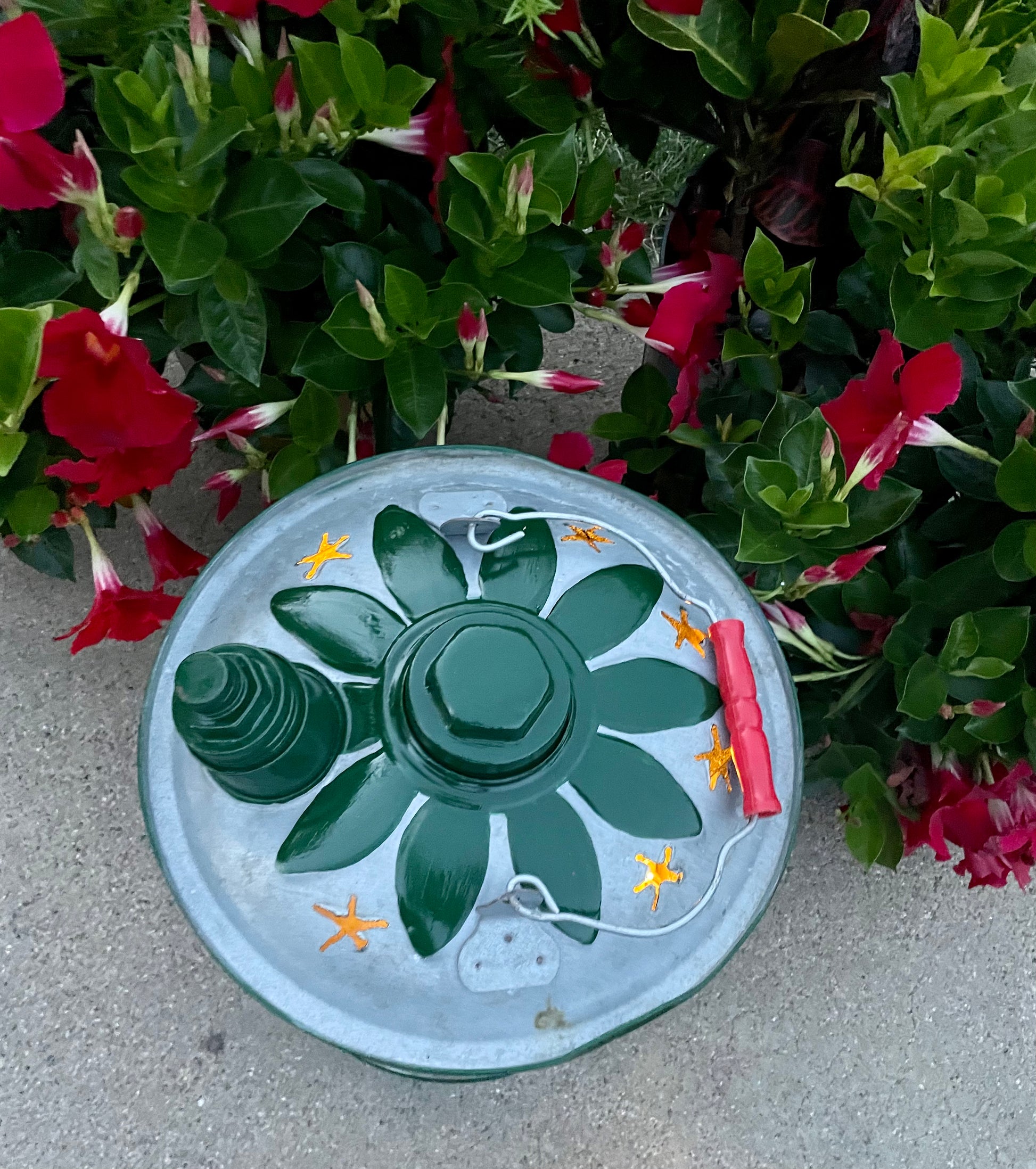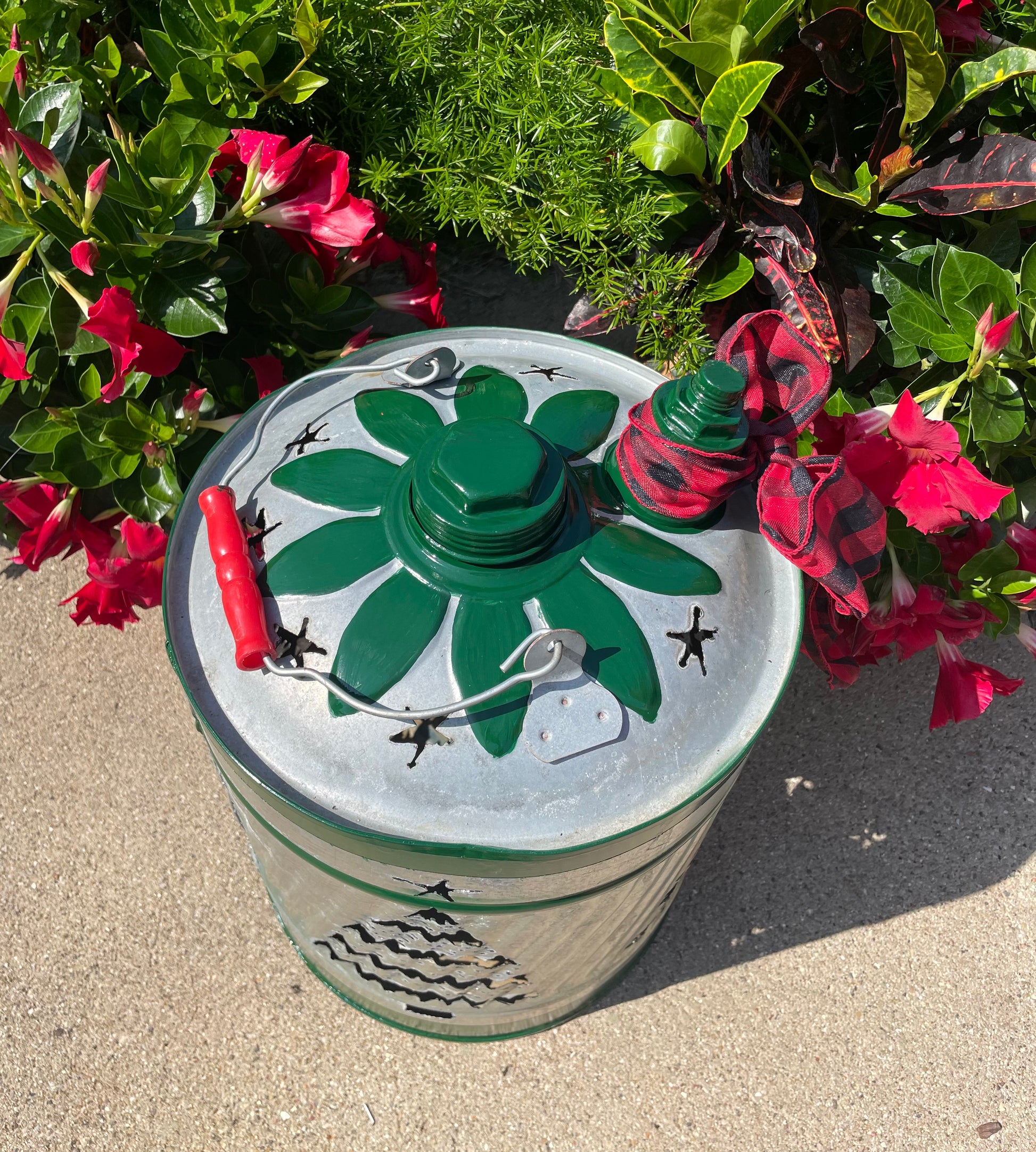Three stripes of green paint have been freshly applied where the original paint once was. A green pointsetta has also been painted on the top of the can. A hole has been cut in the bottom to easily add lighting if you wish.