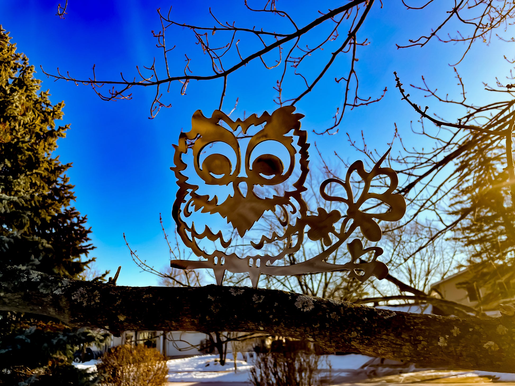 This owl will have a raw steel finish and comes in two installation designs. Either a single stake from the side or two small stakes at the bottom. The owl is made with a minimum of 11 gauge metal (1/8” thick).