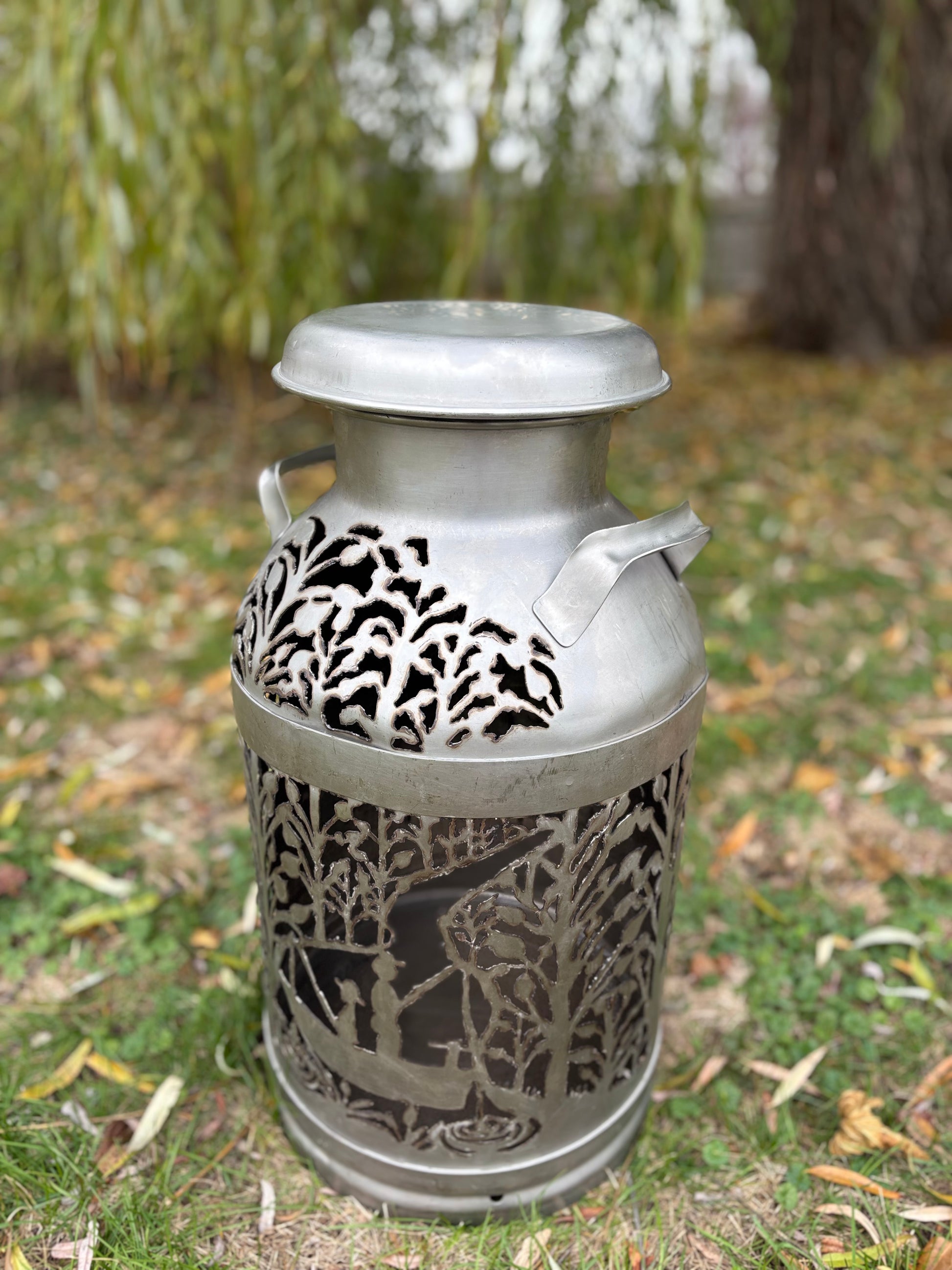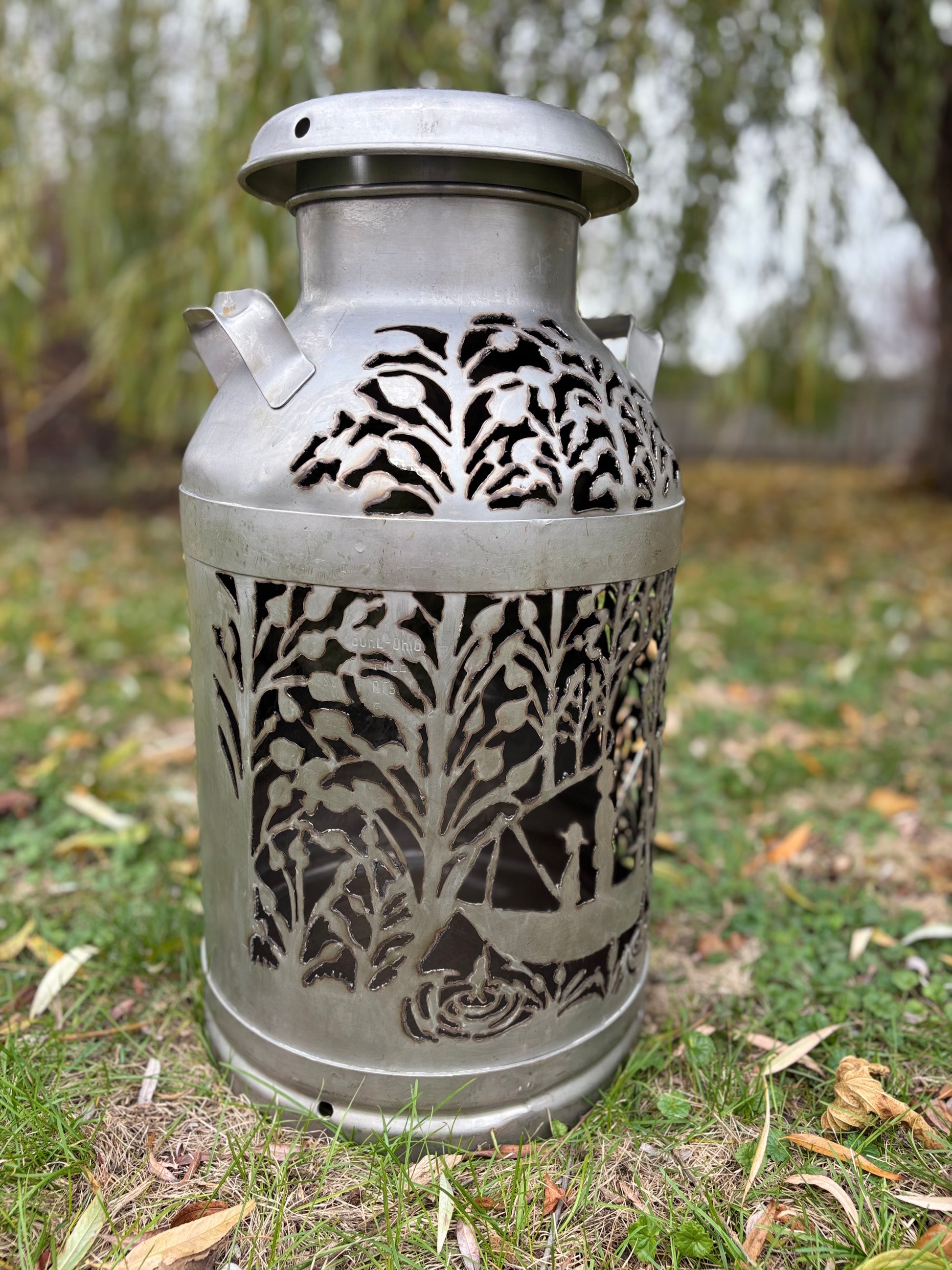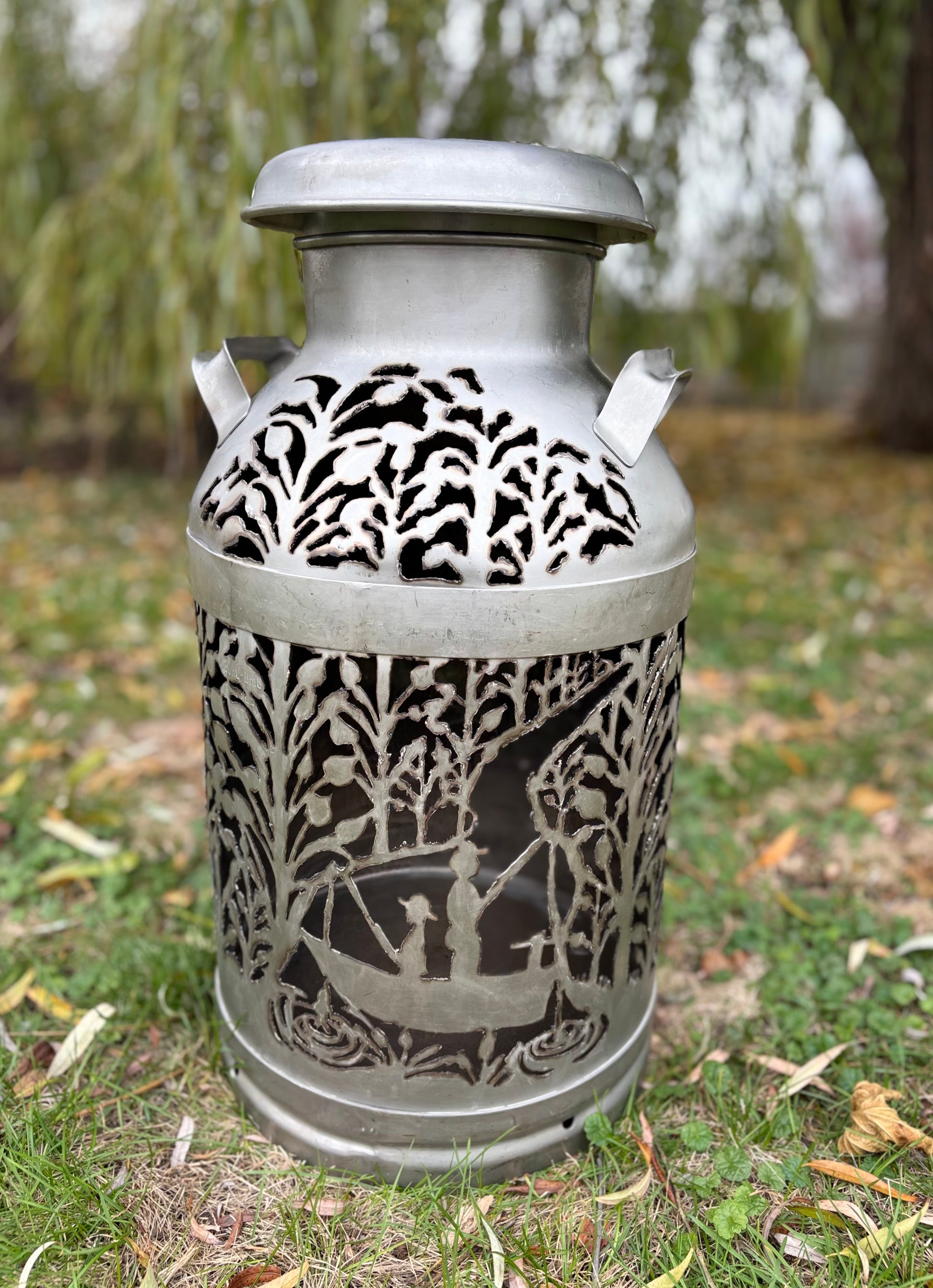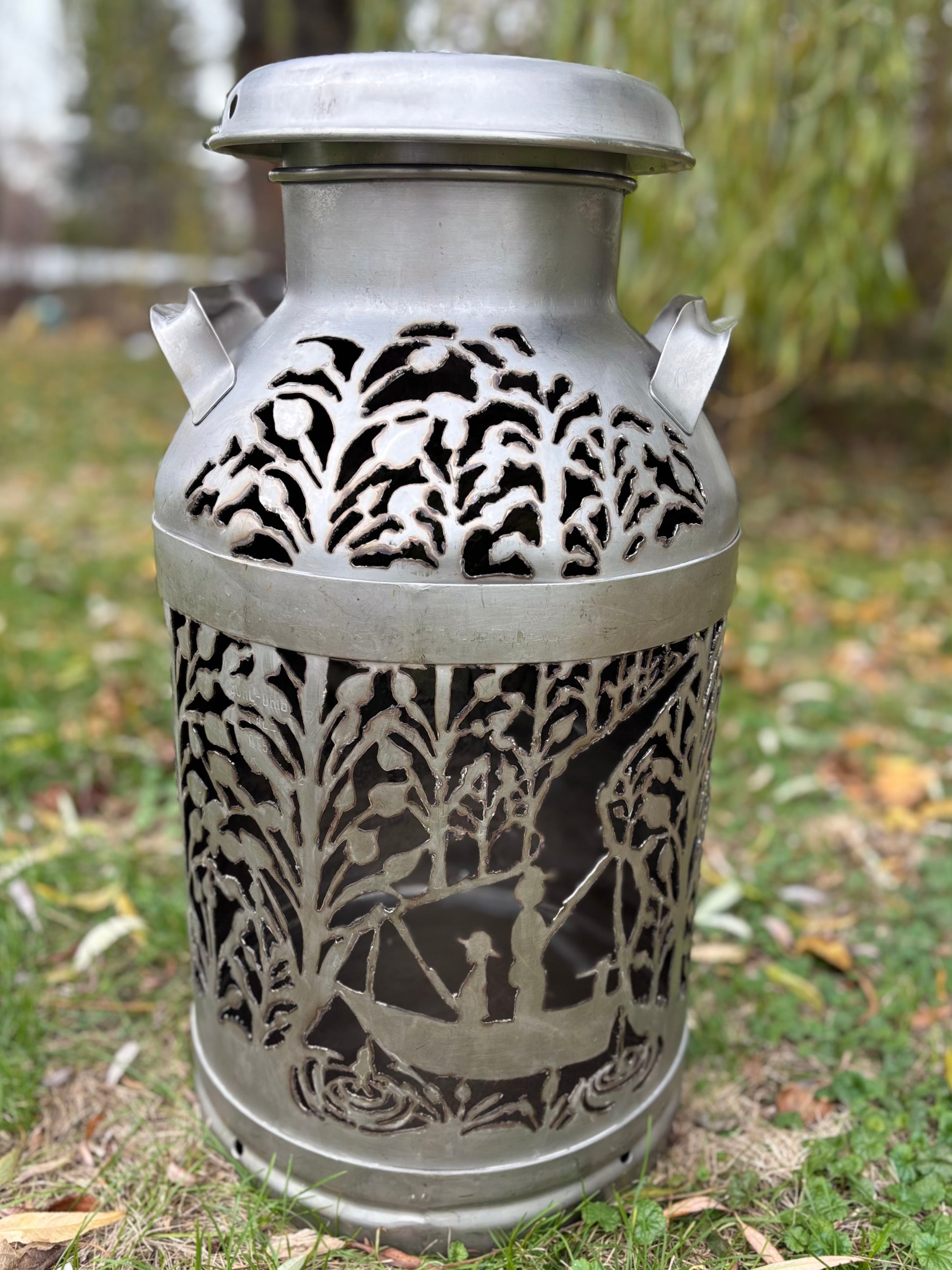 Brighten up your favorite spot with this intricately hand-cut vintage milk can displaying two fisherman amidst the trees.