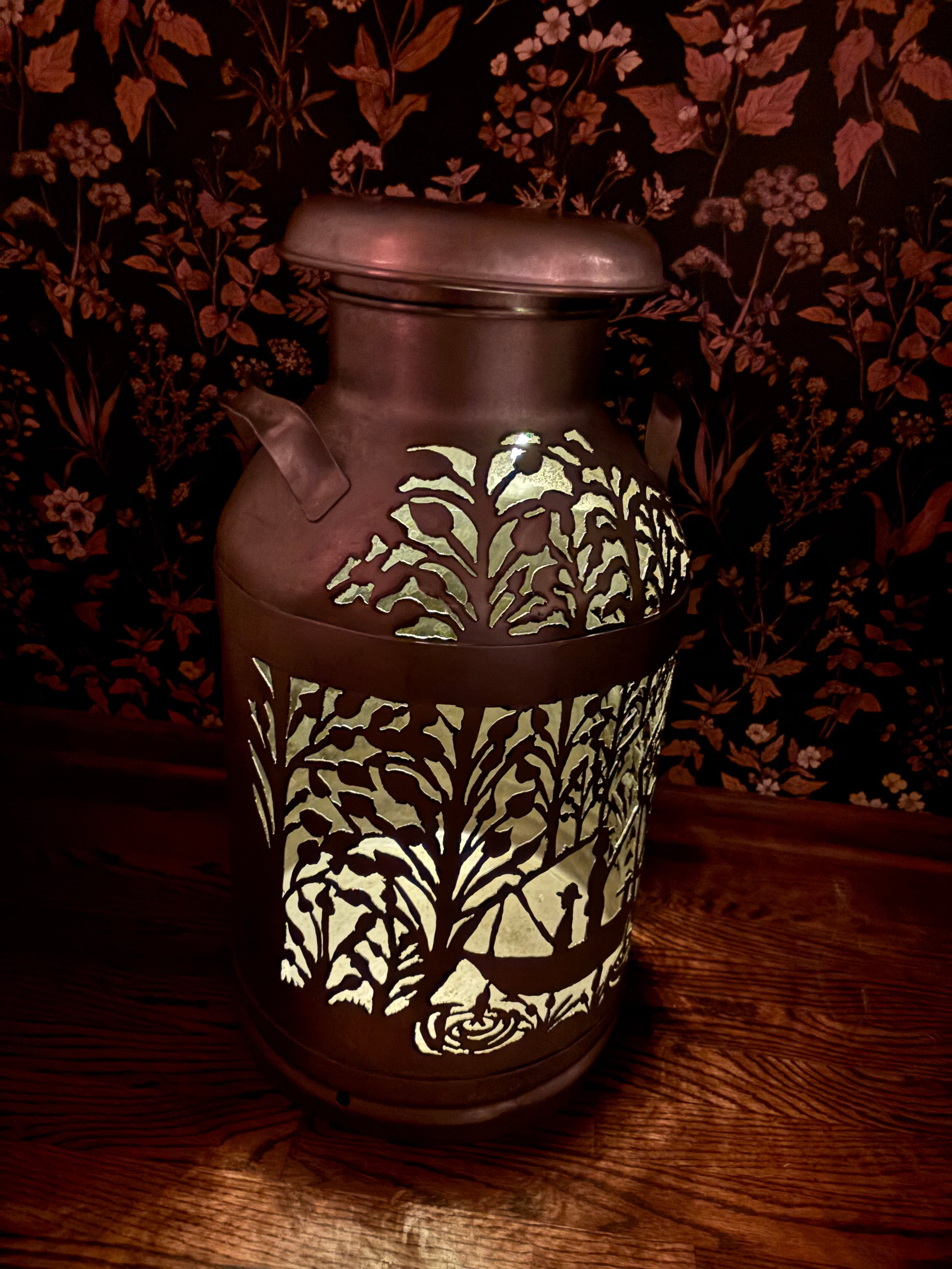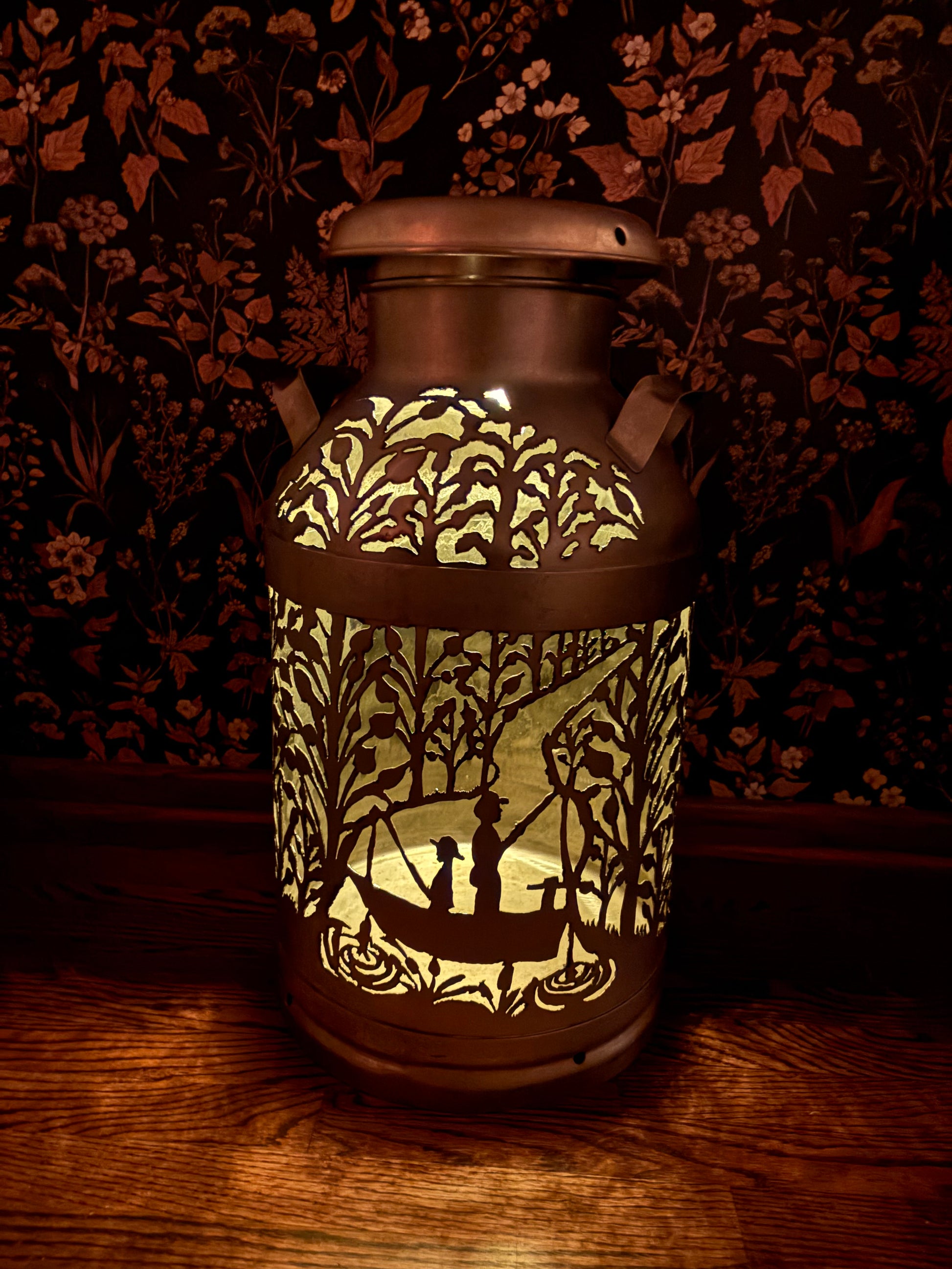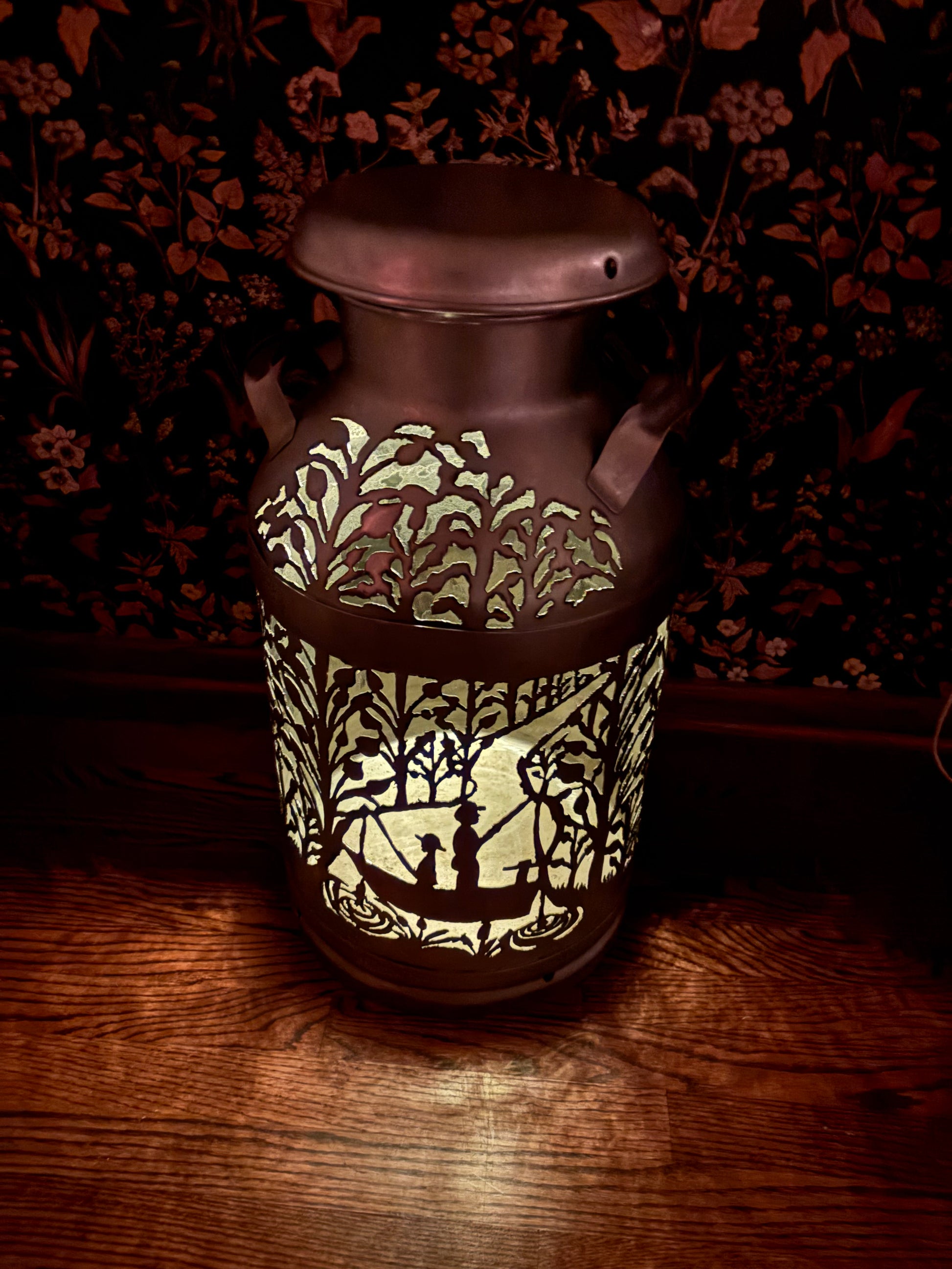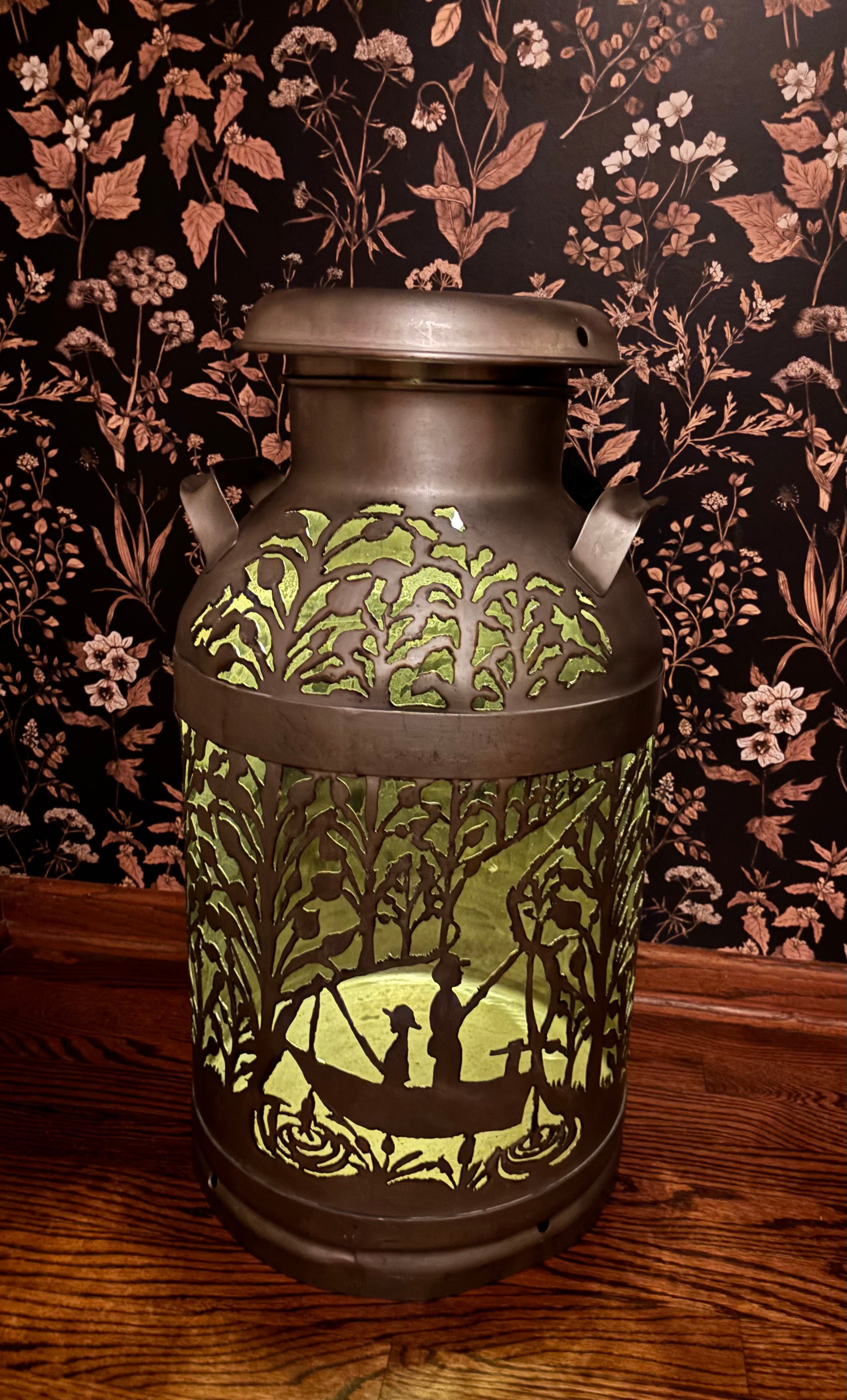 Brighten up your favorite spot with this intricately hand-cut vintage milk can displaying two fisherman amidst the trees.