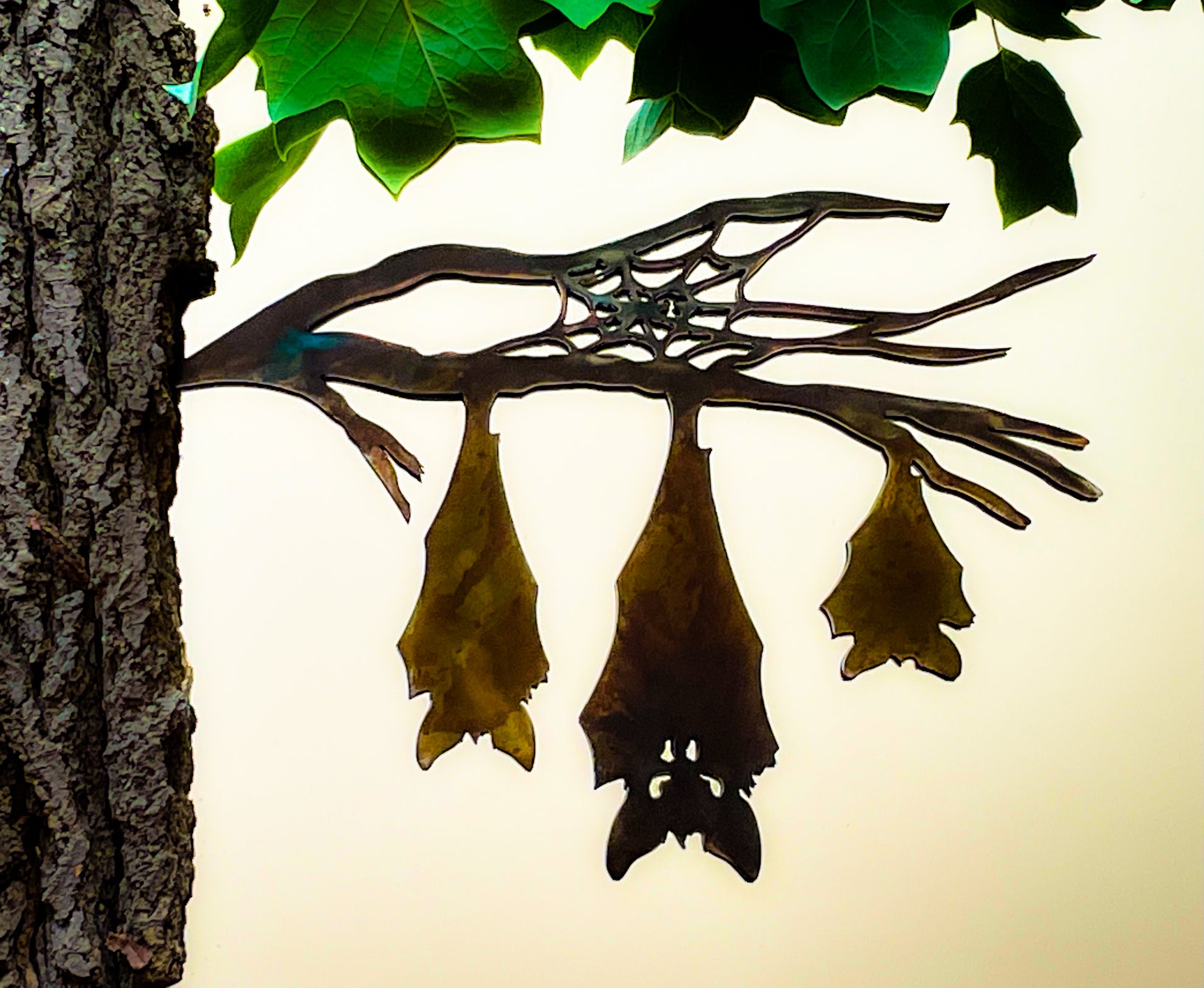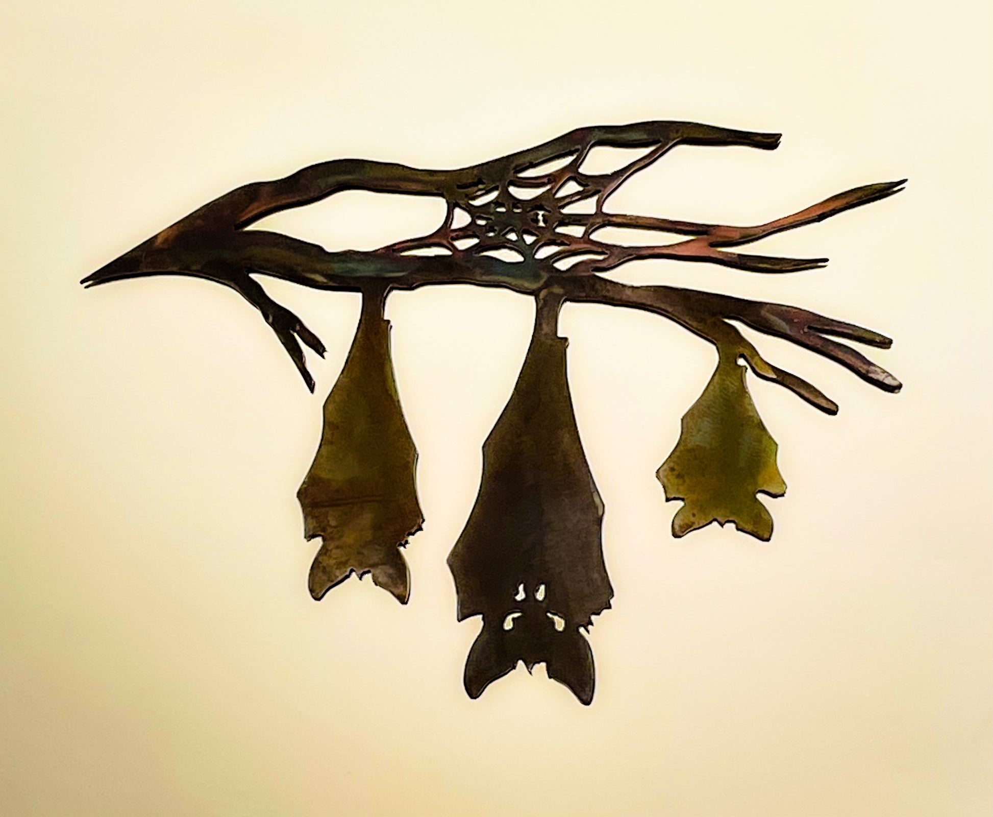 Measuring 11.9” wide and 8.5” tall and made from 11-gauge or 1/8” steel. This is a solid piece of art that will give you many years of enjoyment. Patinaed with several layers of color to give a brownish black coloring with hints of a flame painted spider web. A clear coat is added to provide shine and extra protection. This piece will develop a rusty patina over time to add to the character of the piece.