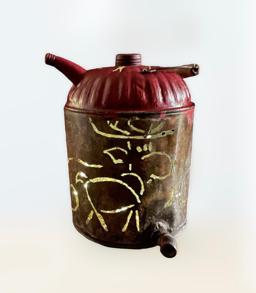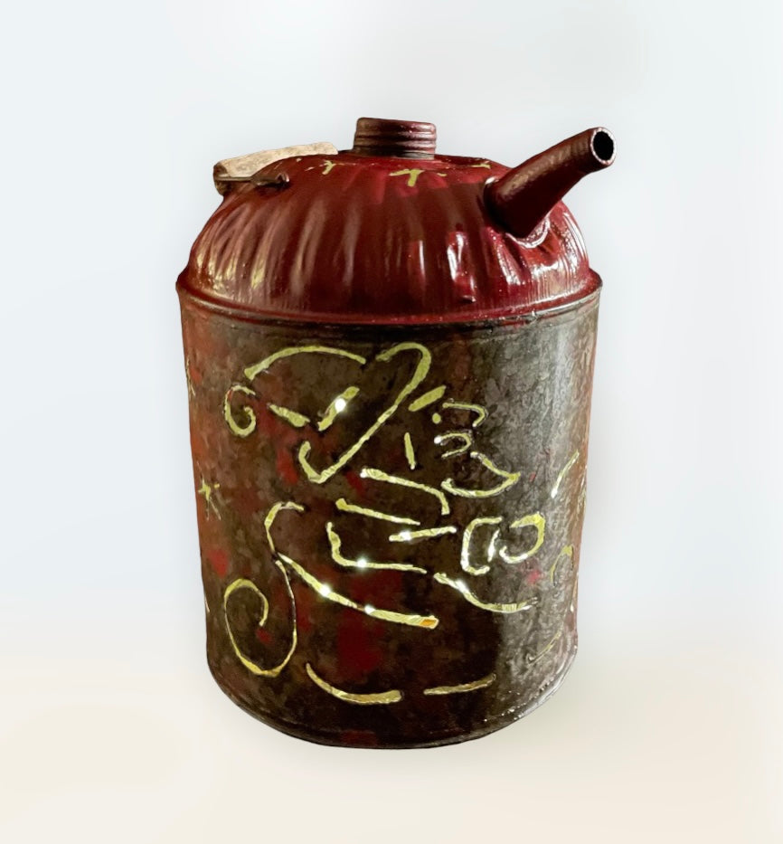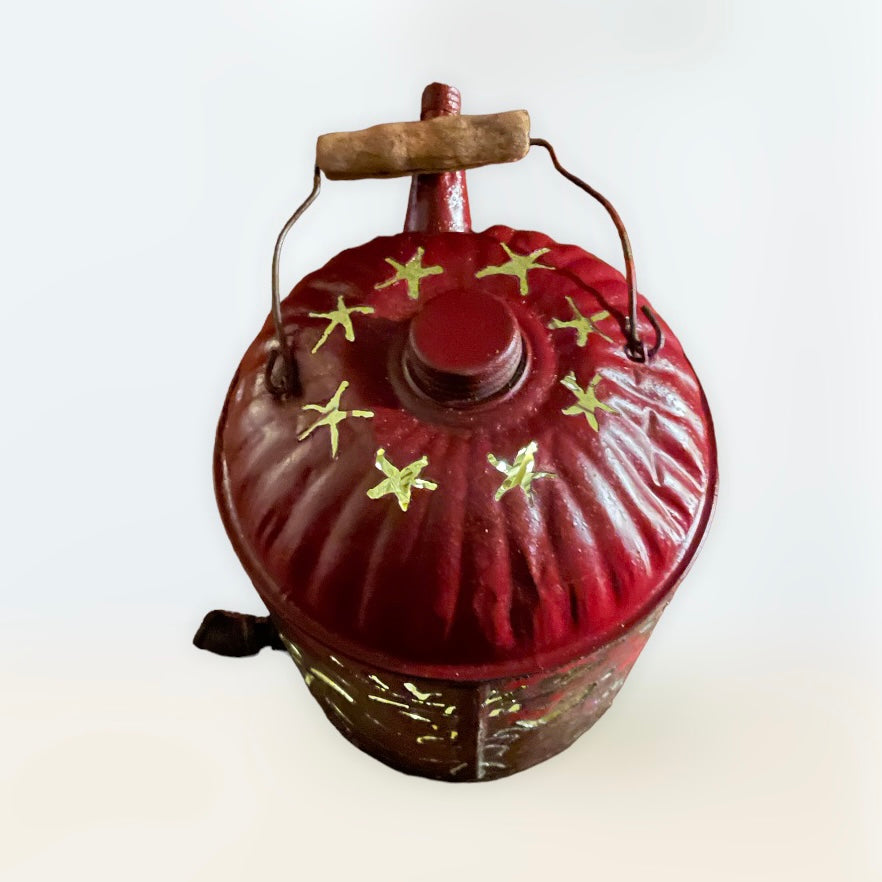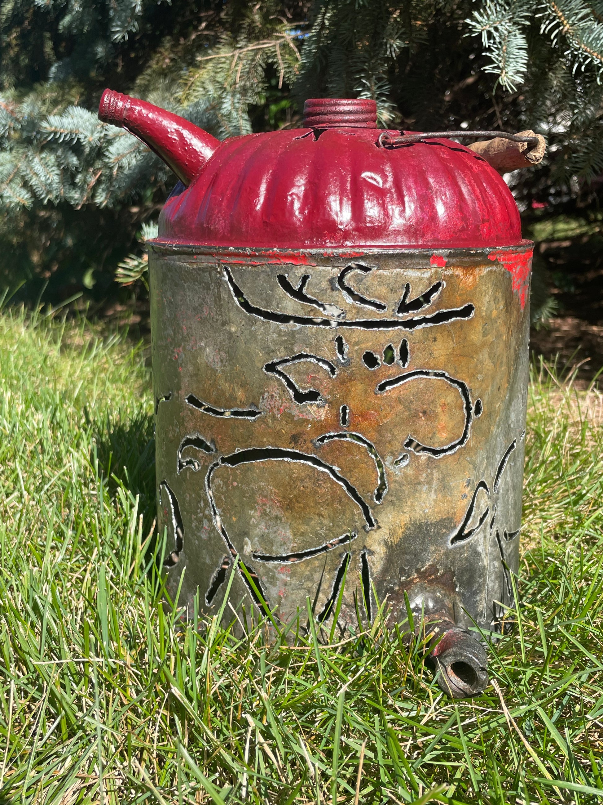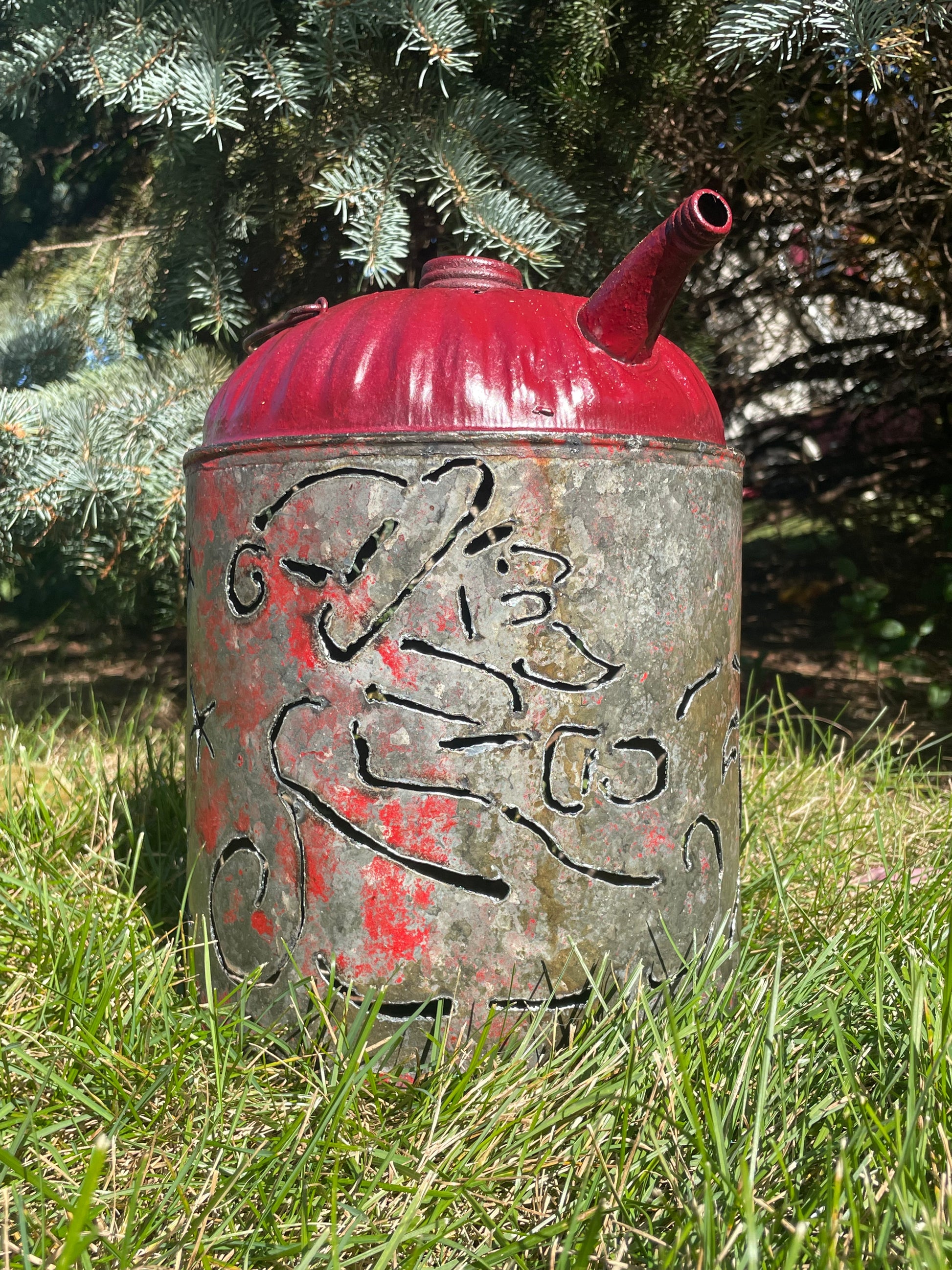 A new coat of a deep burgundy paint has been painted to the top of the can, but the face of the can features what is left of the original paint to maintain its’ vintage character. A clear coat has been added to seal in the original color and for added protection. A hole has been cut in the bottom.
