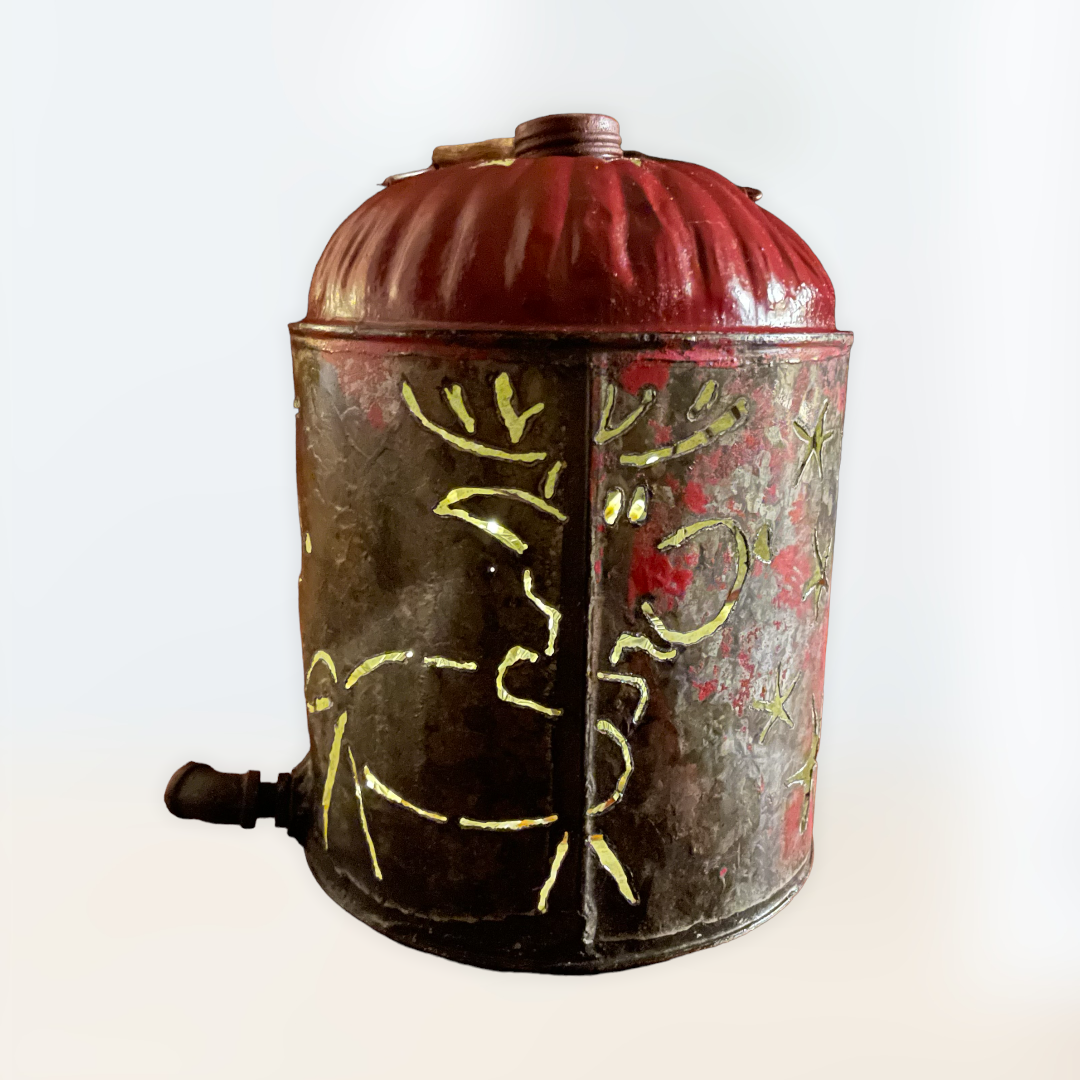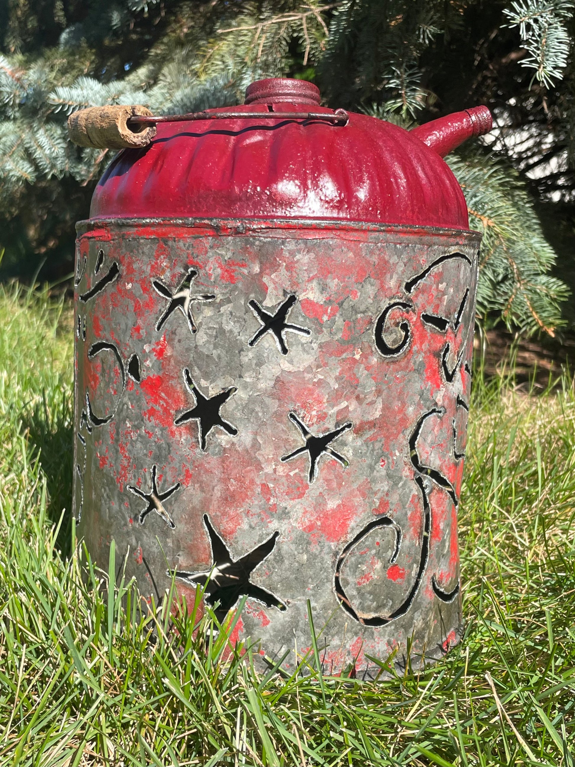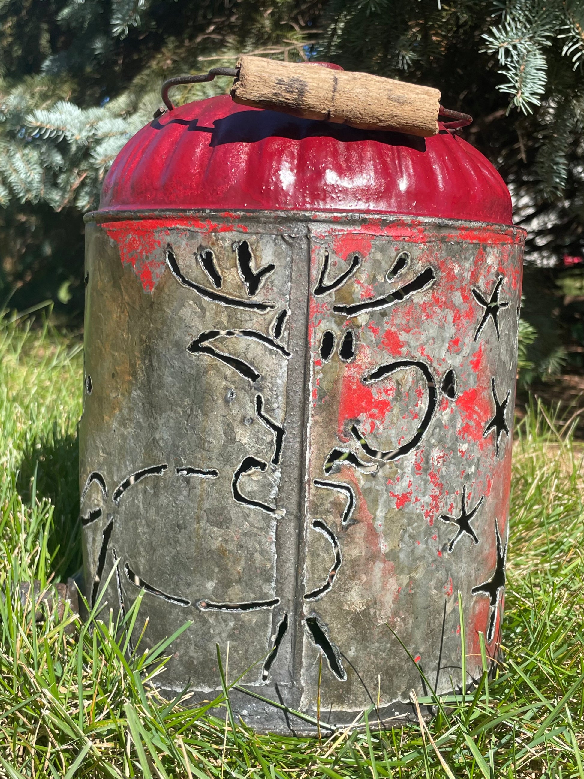 Light up your Christmas season with this vintage galvanized gas can, hand cut, featuring Santa and his reindeer under a starry sky. Add a string of battery operated lights (not included) to create a luminary.