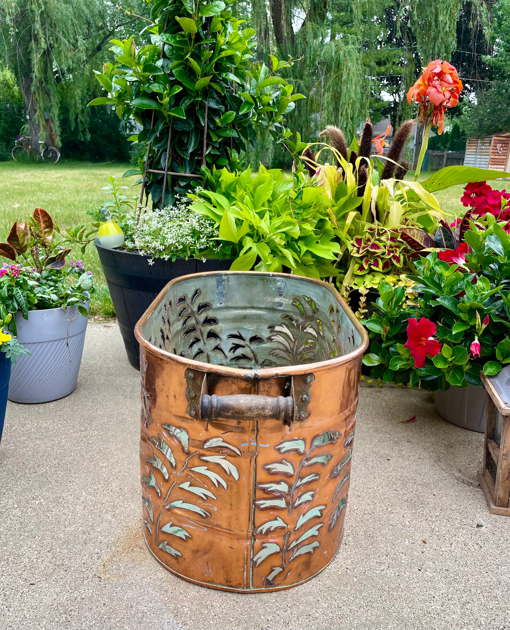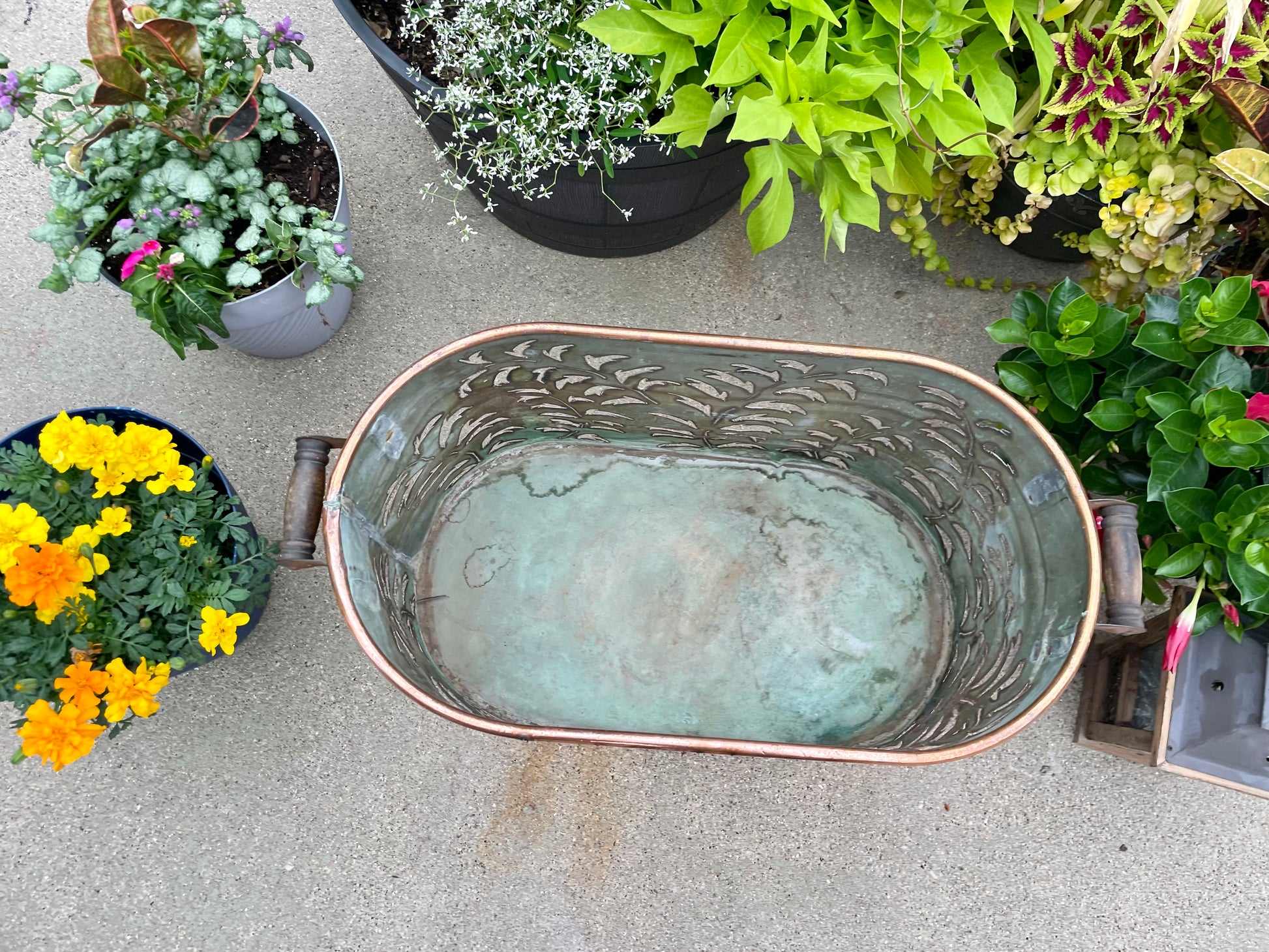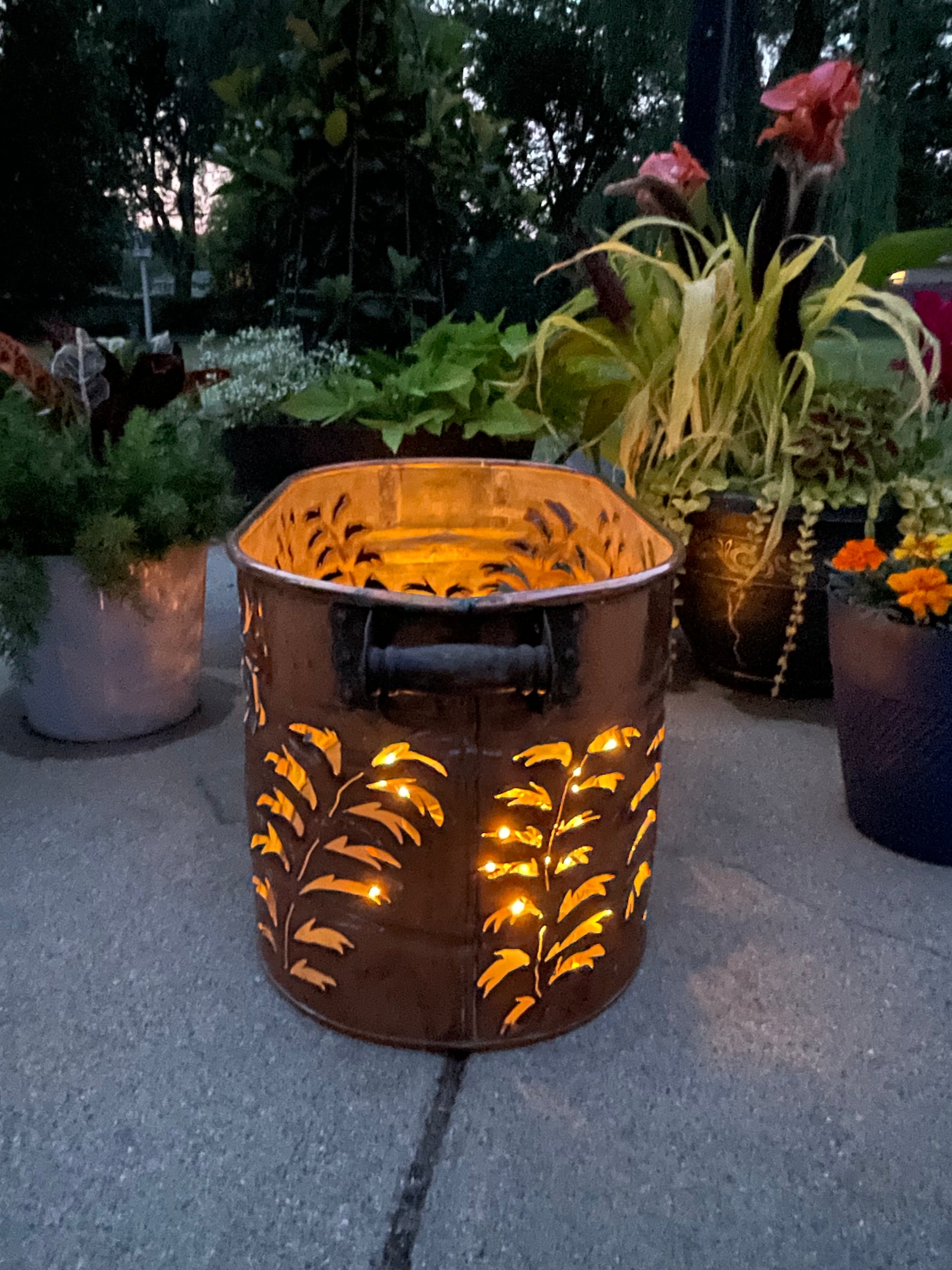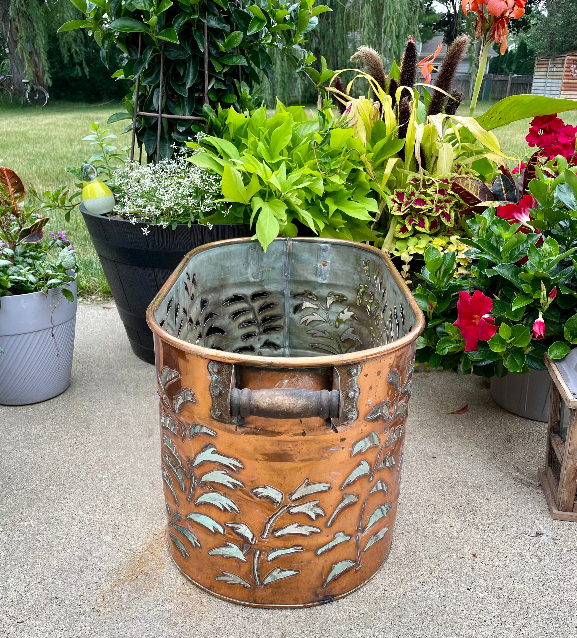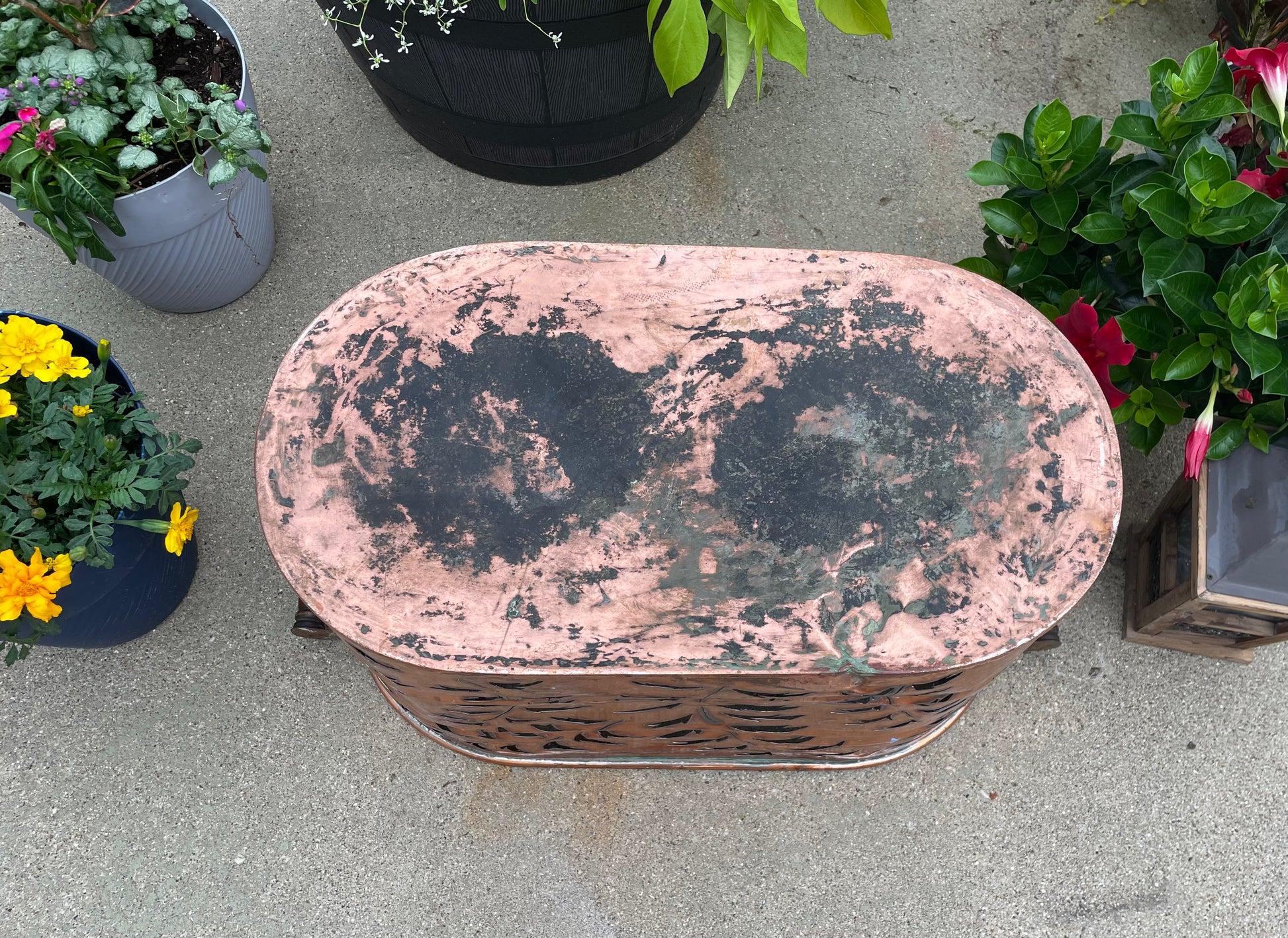Vintage 15-gallon COPPER boiler. Hand cut with a plasma torch. Add a string of battery-operated lights (not included) to create a luminary or add flowers (not included).