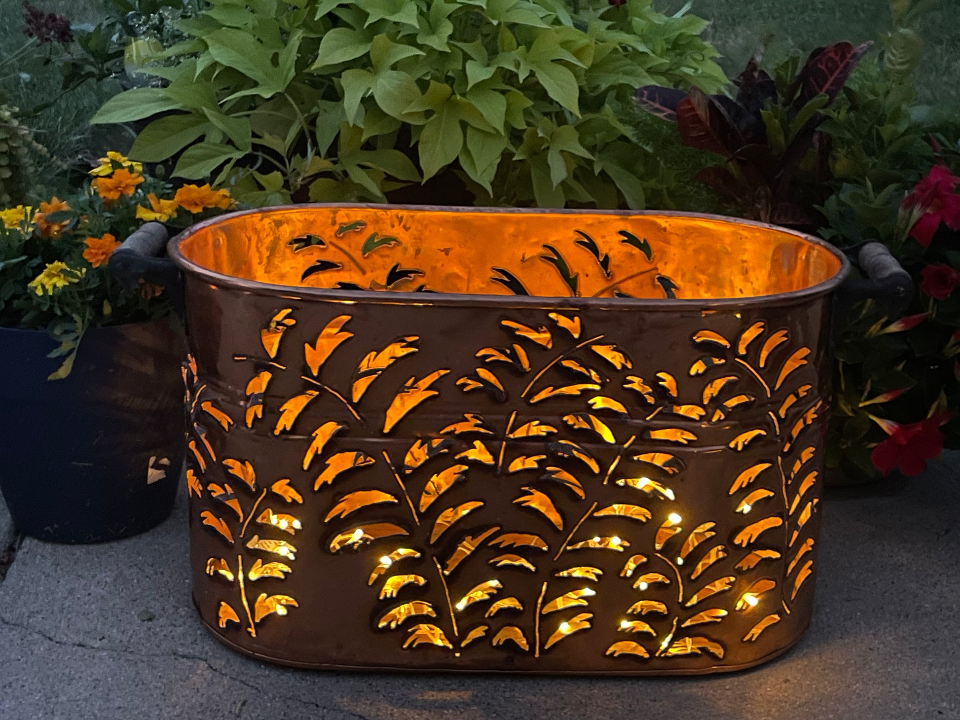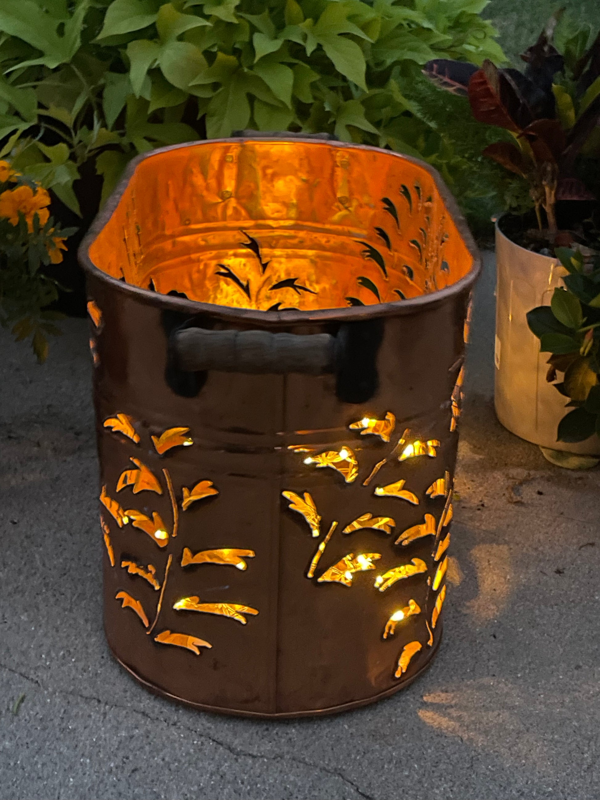 Vintage 15-gallon COPPER boiler. Hand cut with a plasma torch. Add a string of battery-operated lights (not included) to create a luminary or add flowers (not included).