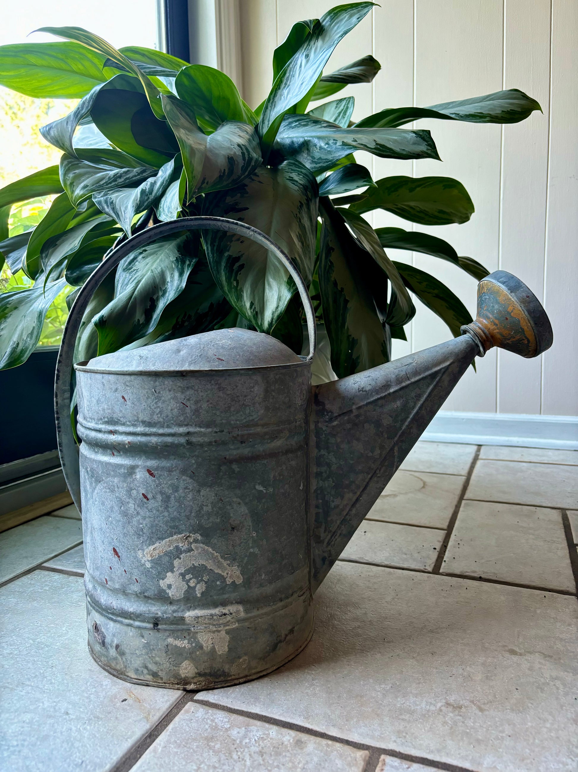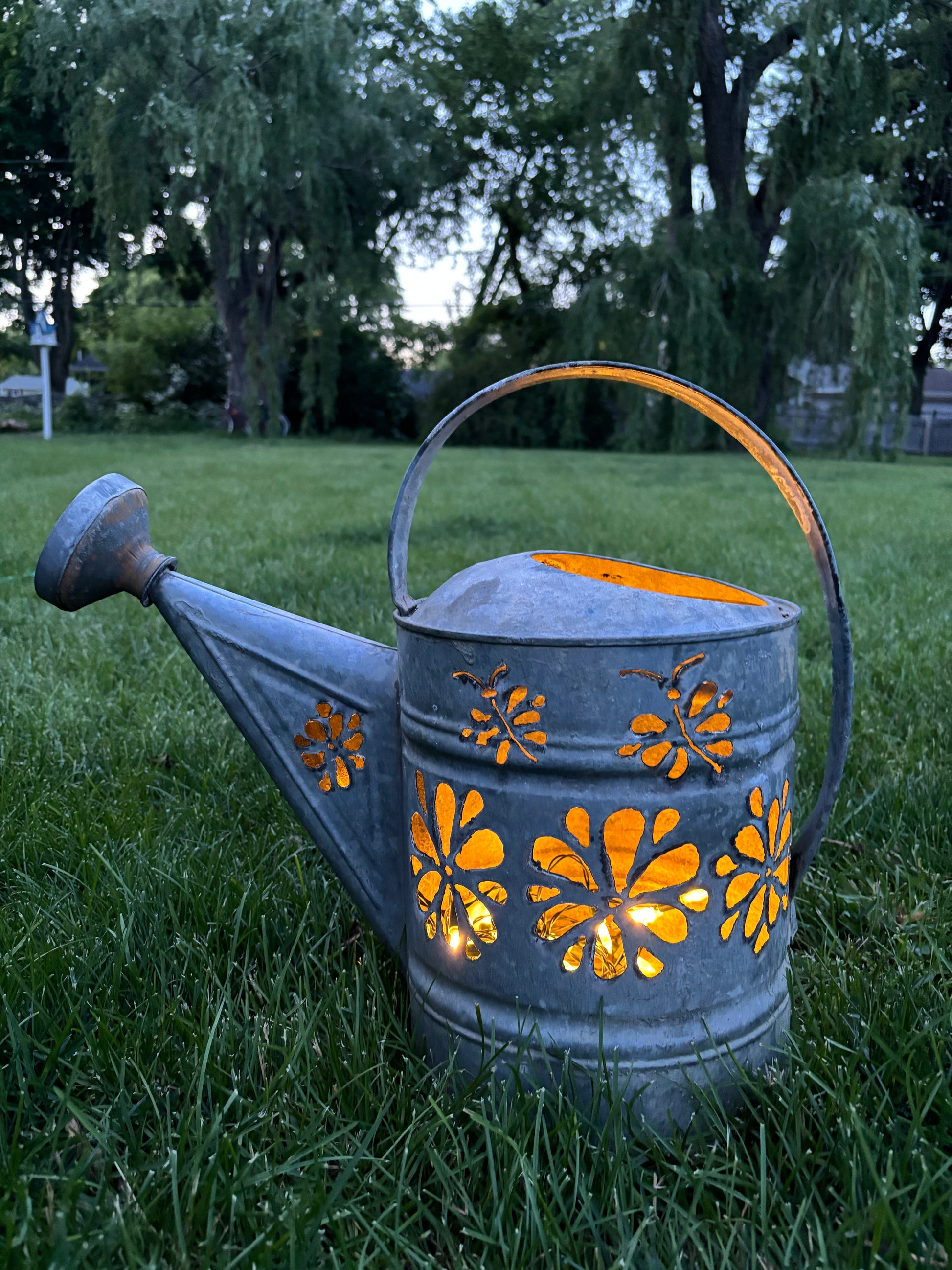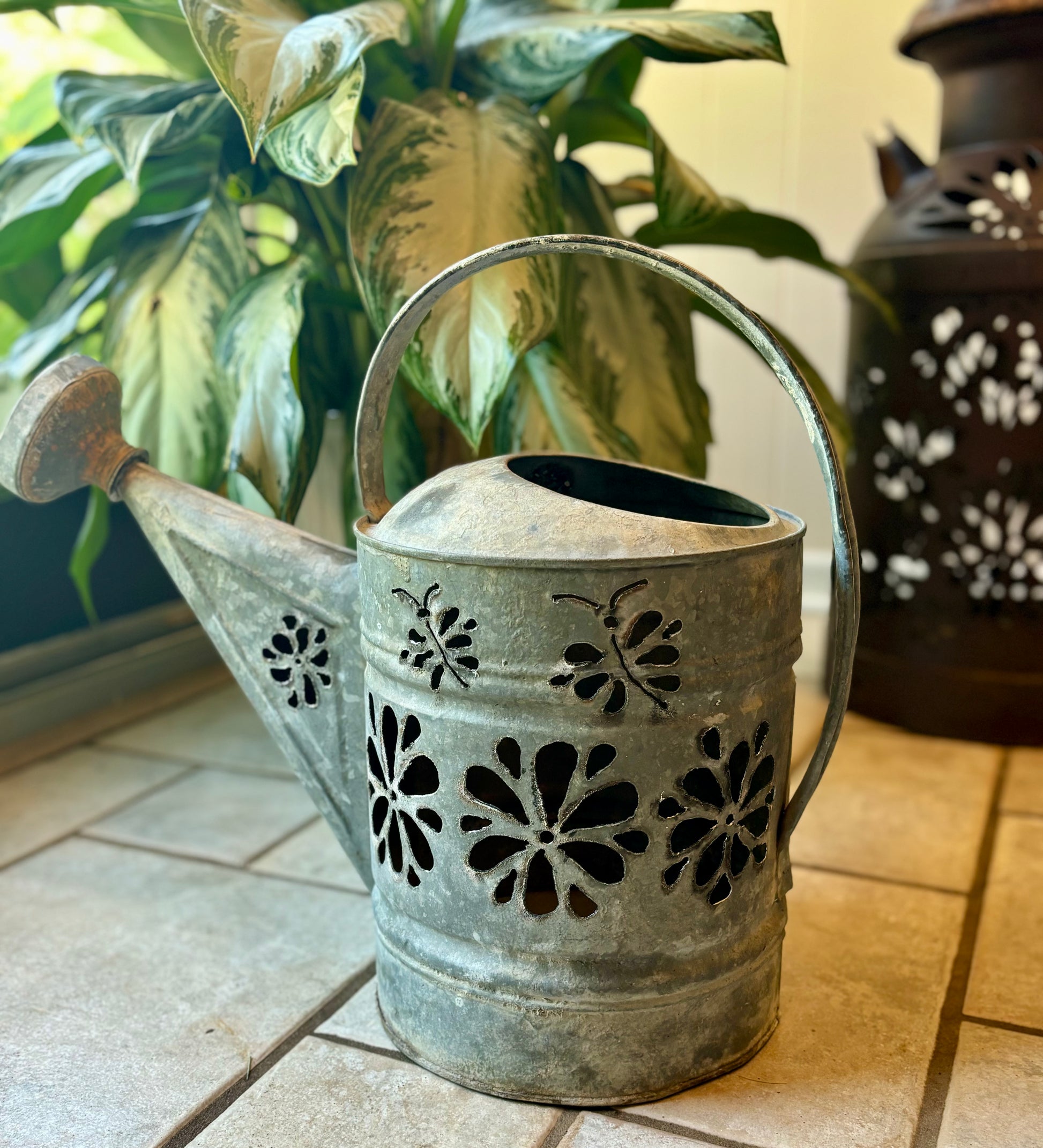 Antique watering can, hand cut with a flower and dragonfly design. Lots of options styling this watering can. Add a string of battery-operated (not included) to create a luminary, use as a planter, or a piece of garden art.