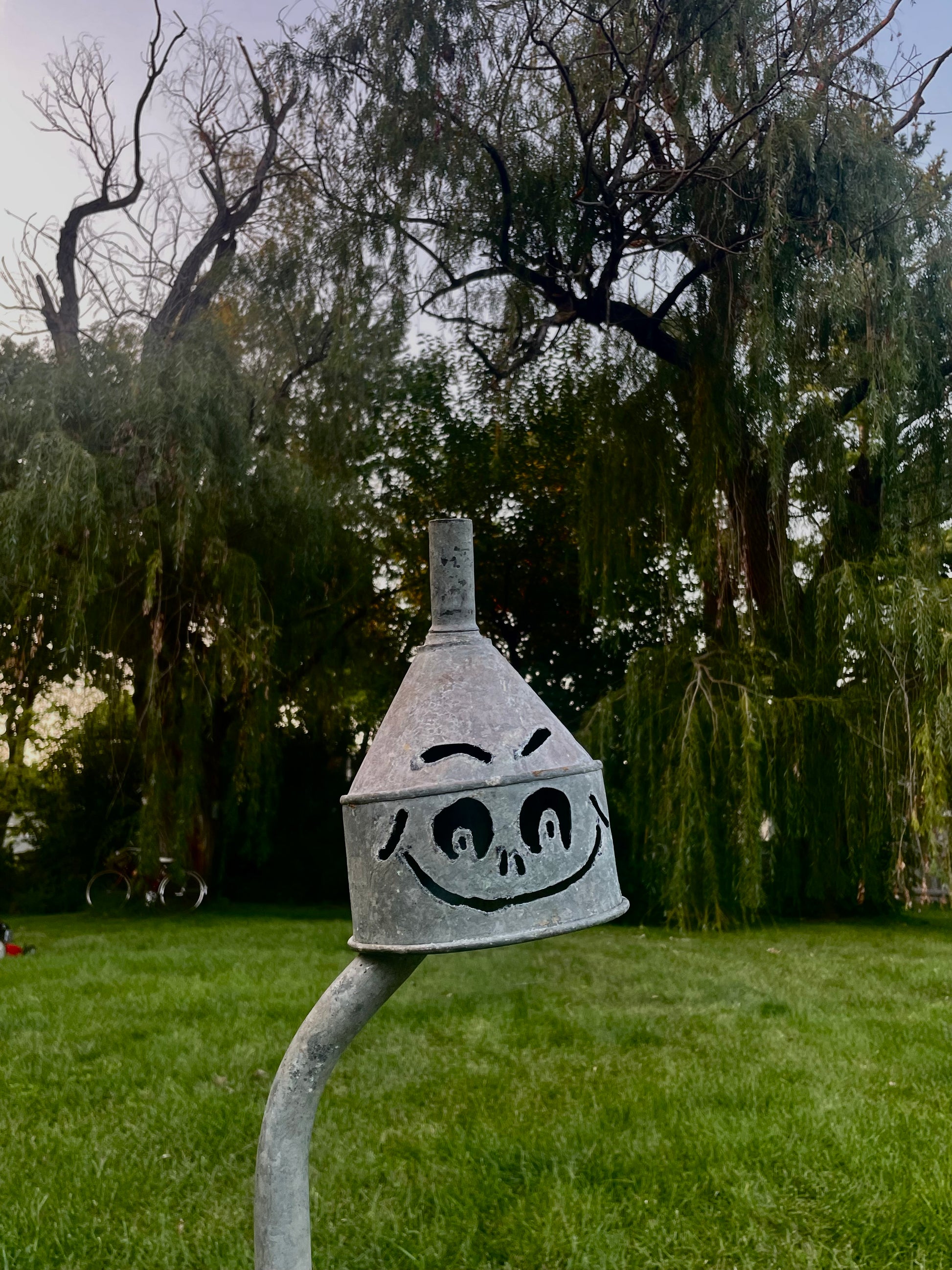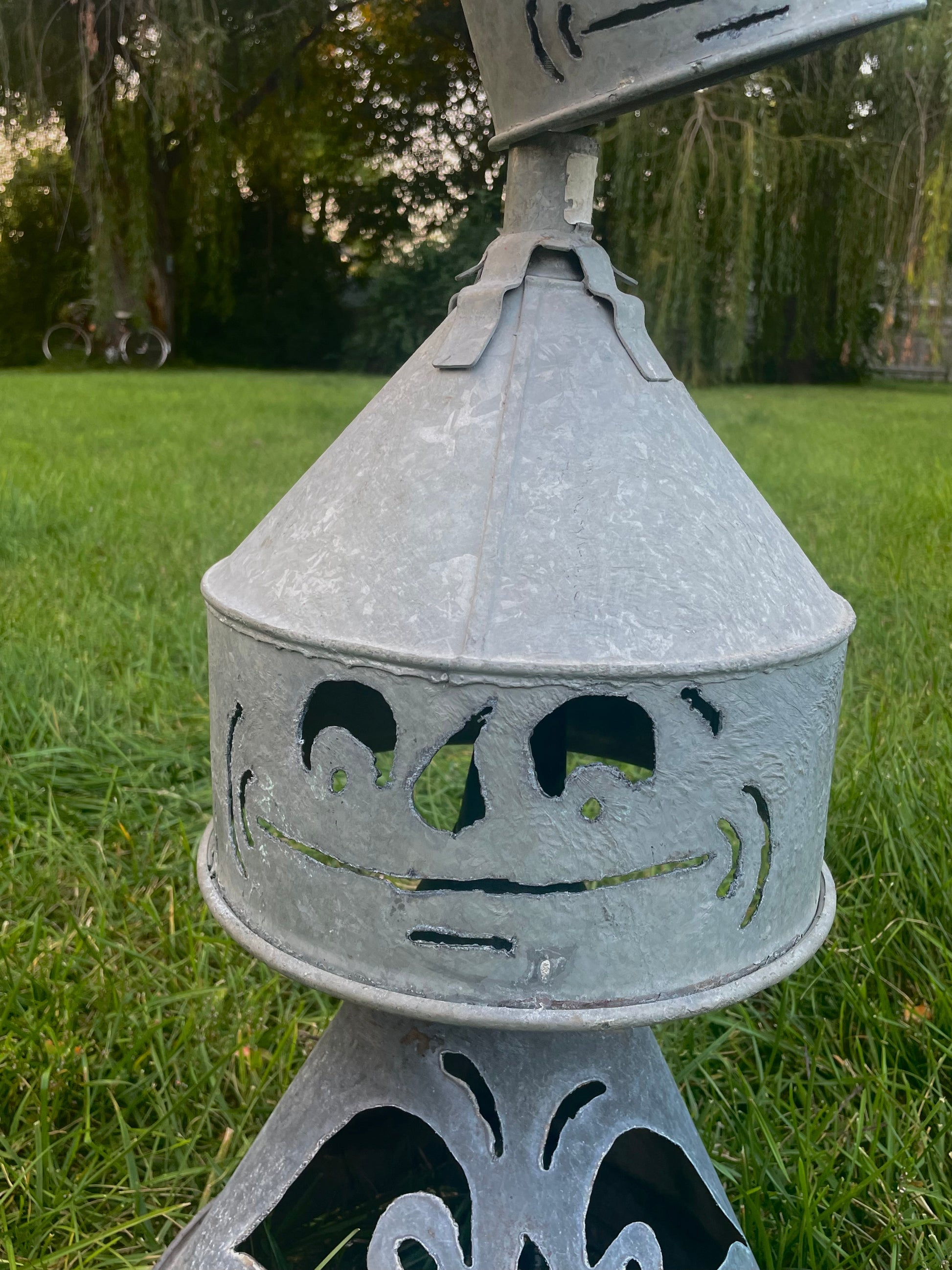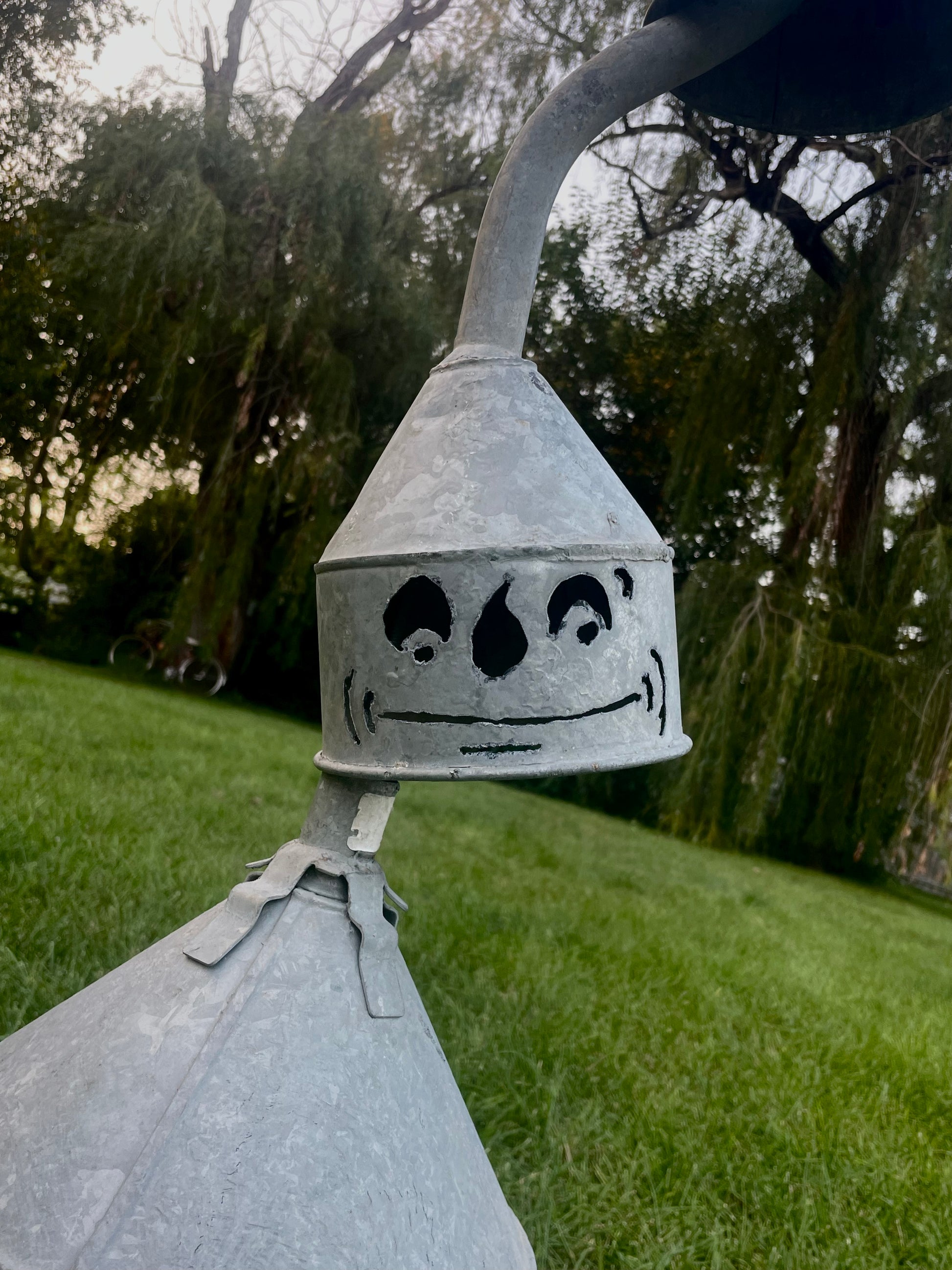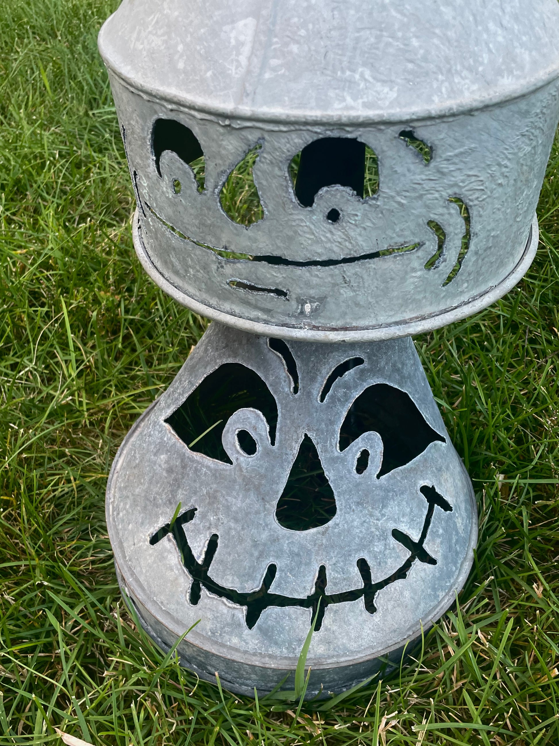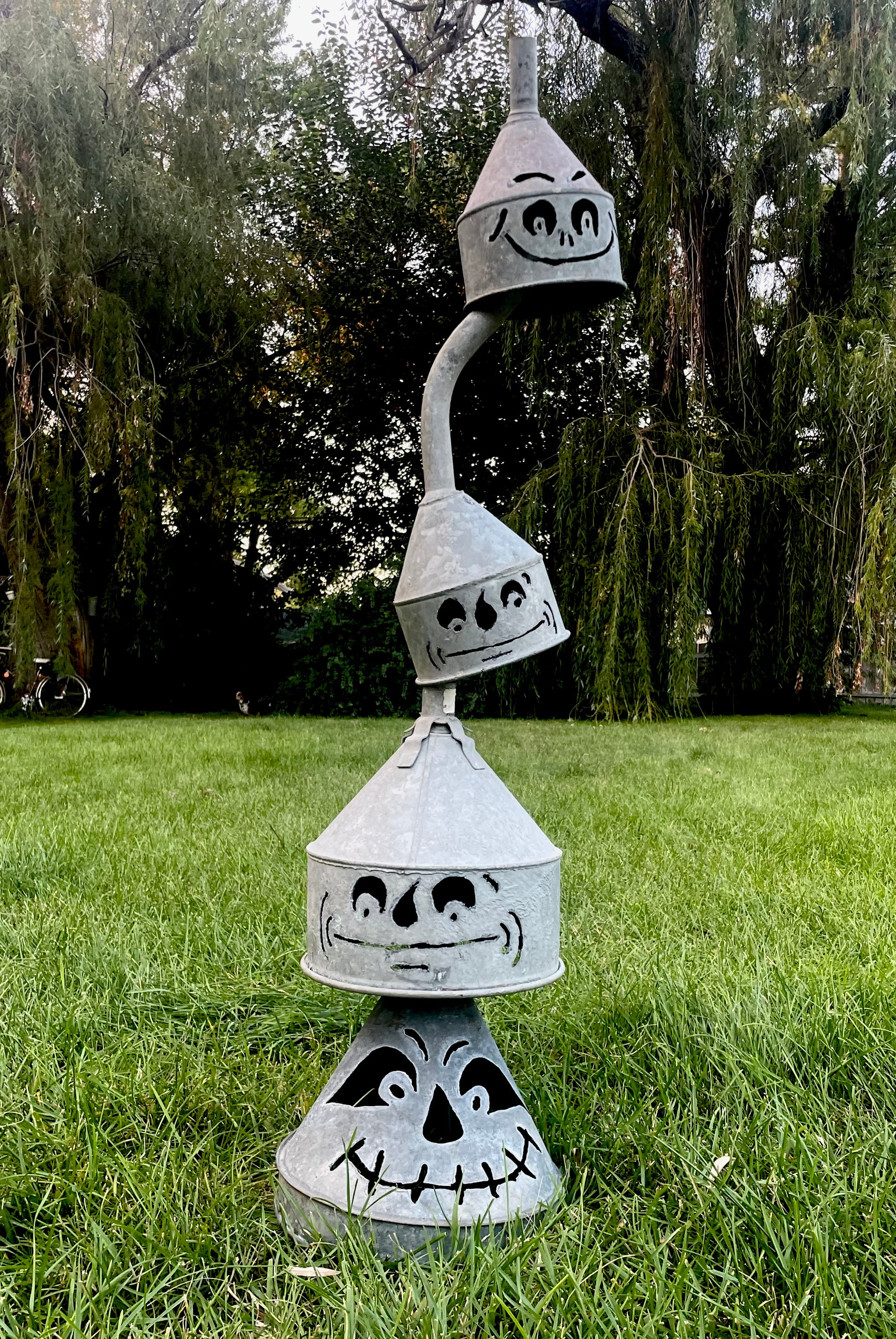 Four vintage funnels, with hand cut faces, create a Tinman Totem to decorate your yard this Halloween.