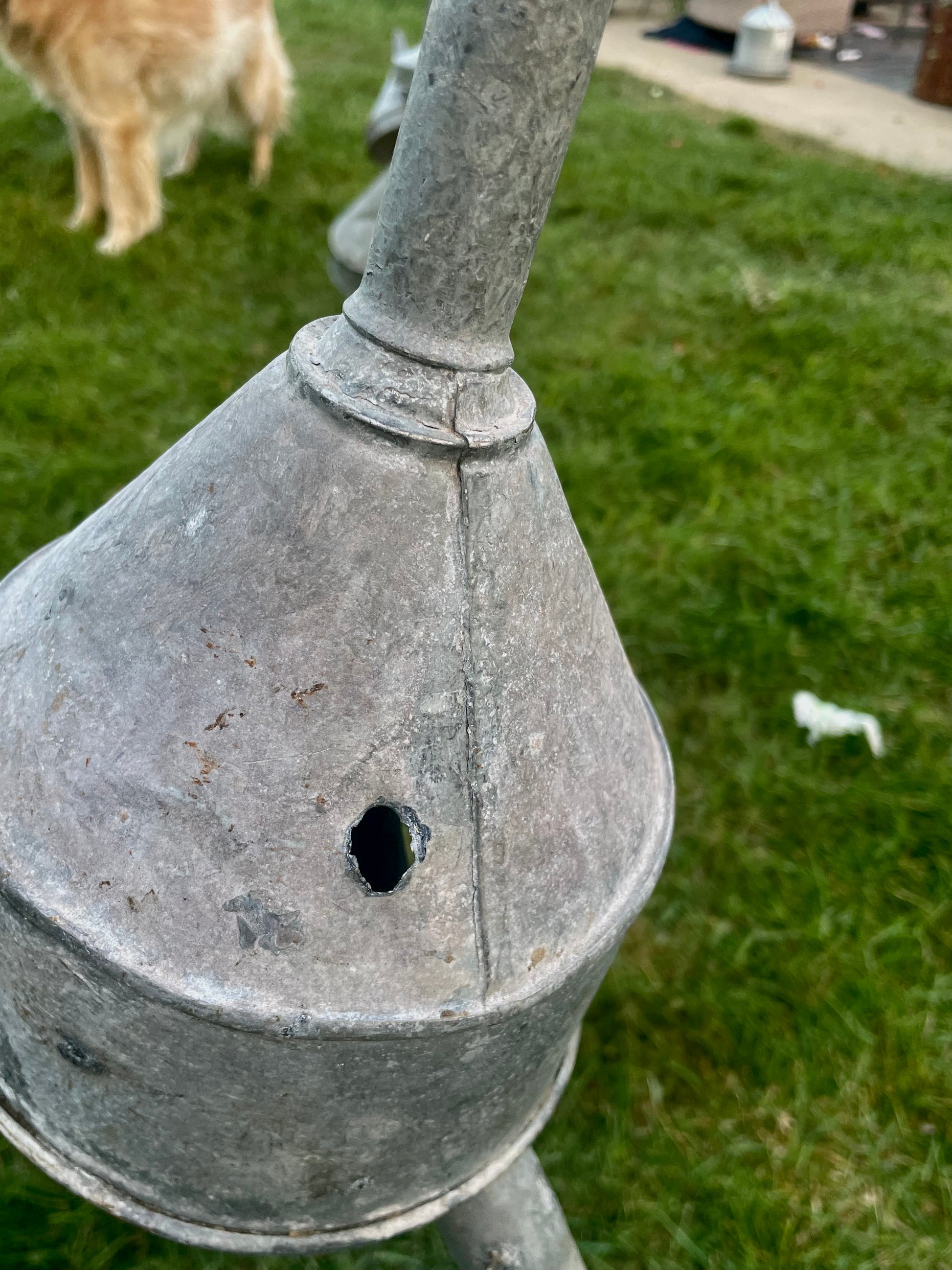 All 4 funnels were used on farms or in garages. They have been cleaned well but show signs of wear which adds to the character of the piece. The top funnel has a hole in the back (see picture).