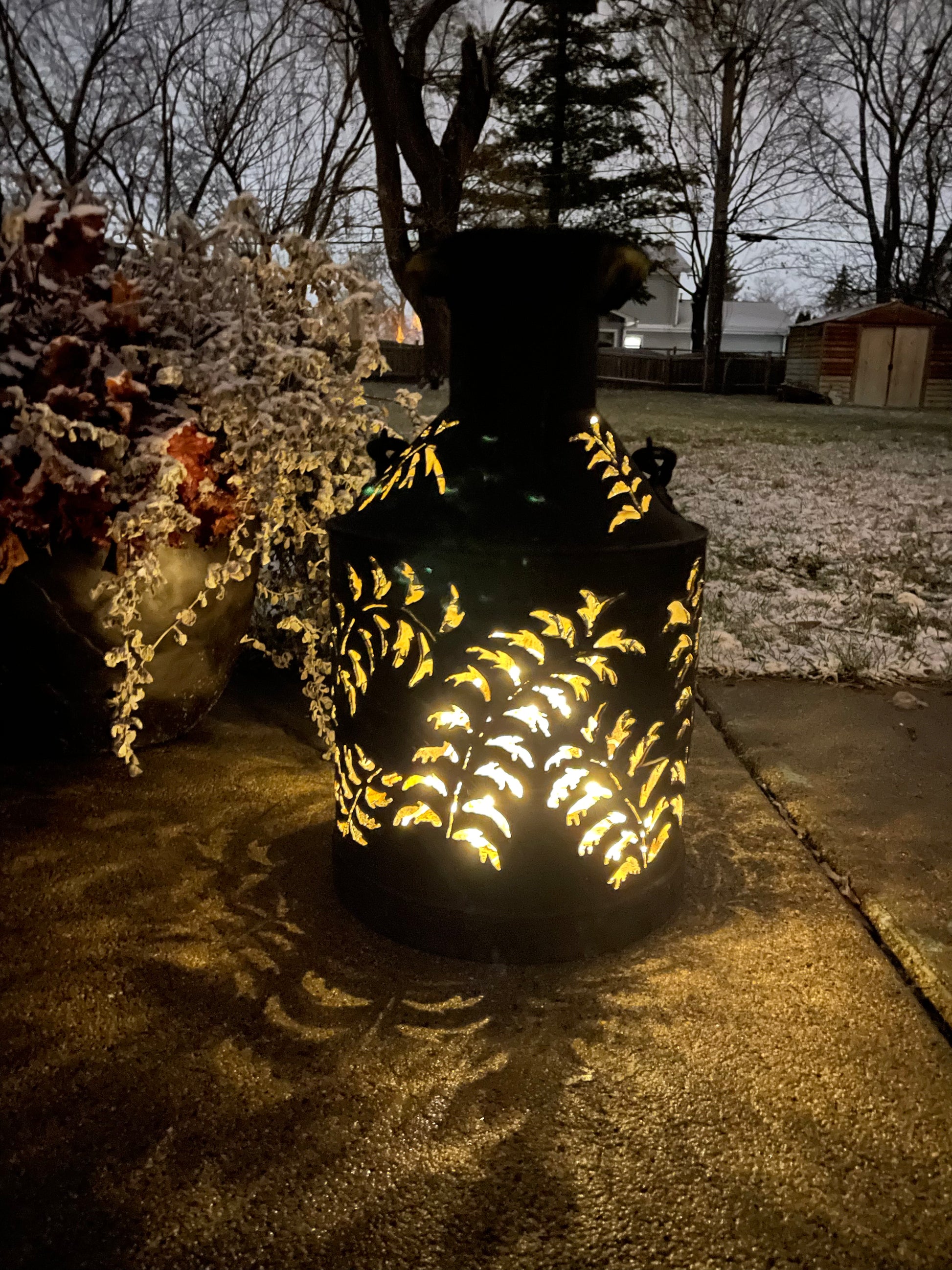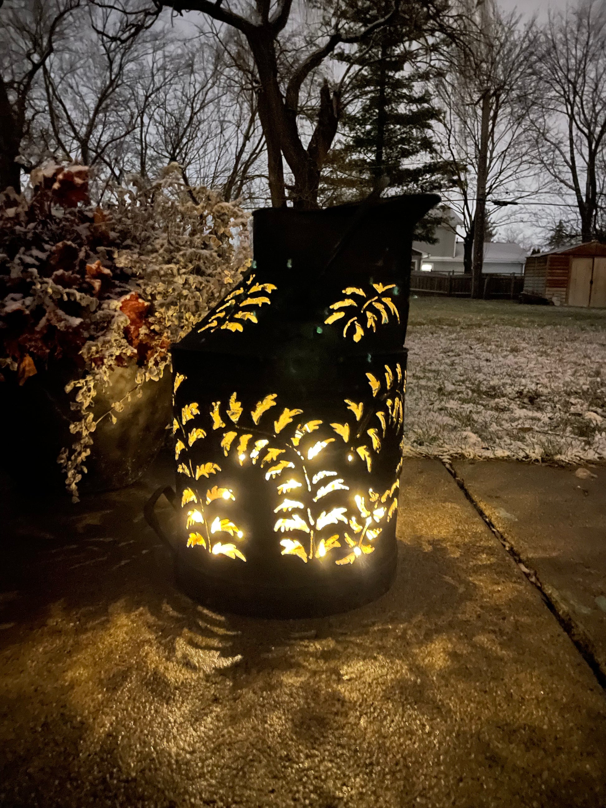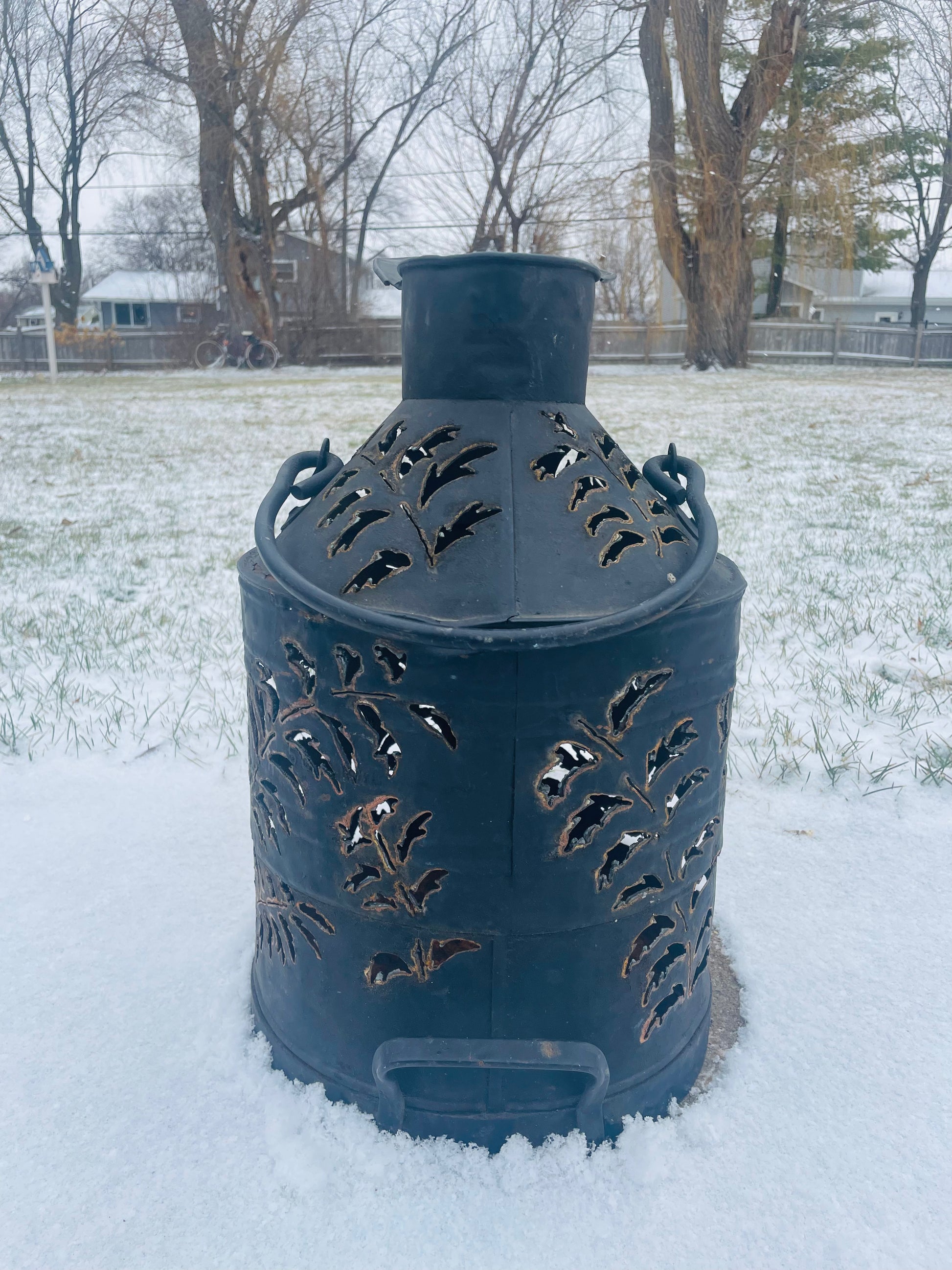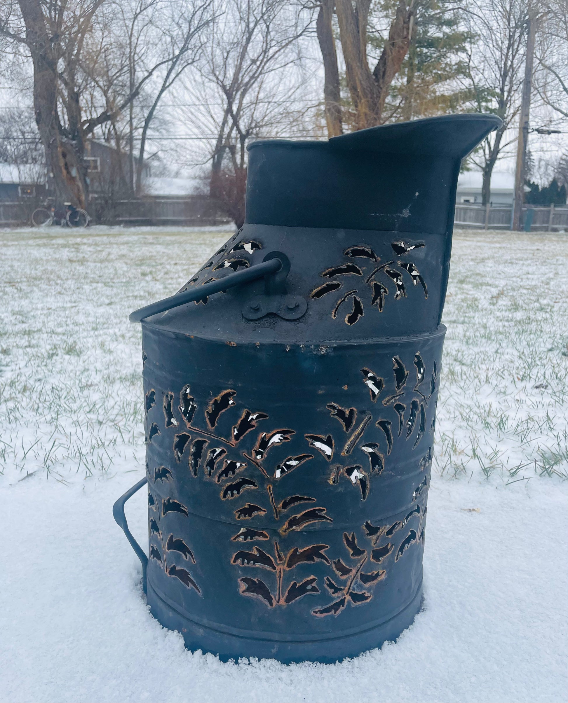 Here we have an antique hand-cut can with spout and handle. Painted black, at some point in its history, and developing an orange rusted patina on the inside. After the leaf design was cut out, the orange patina has developed as an outline of on the edge of the cuts.