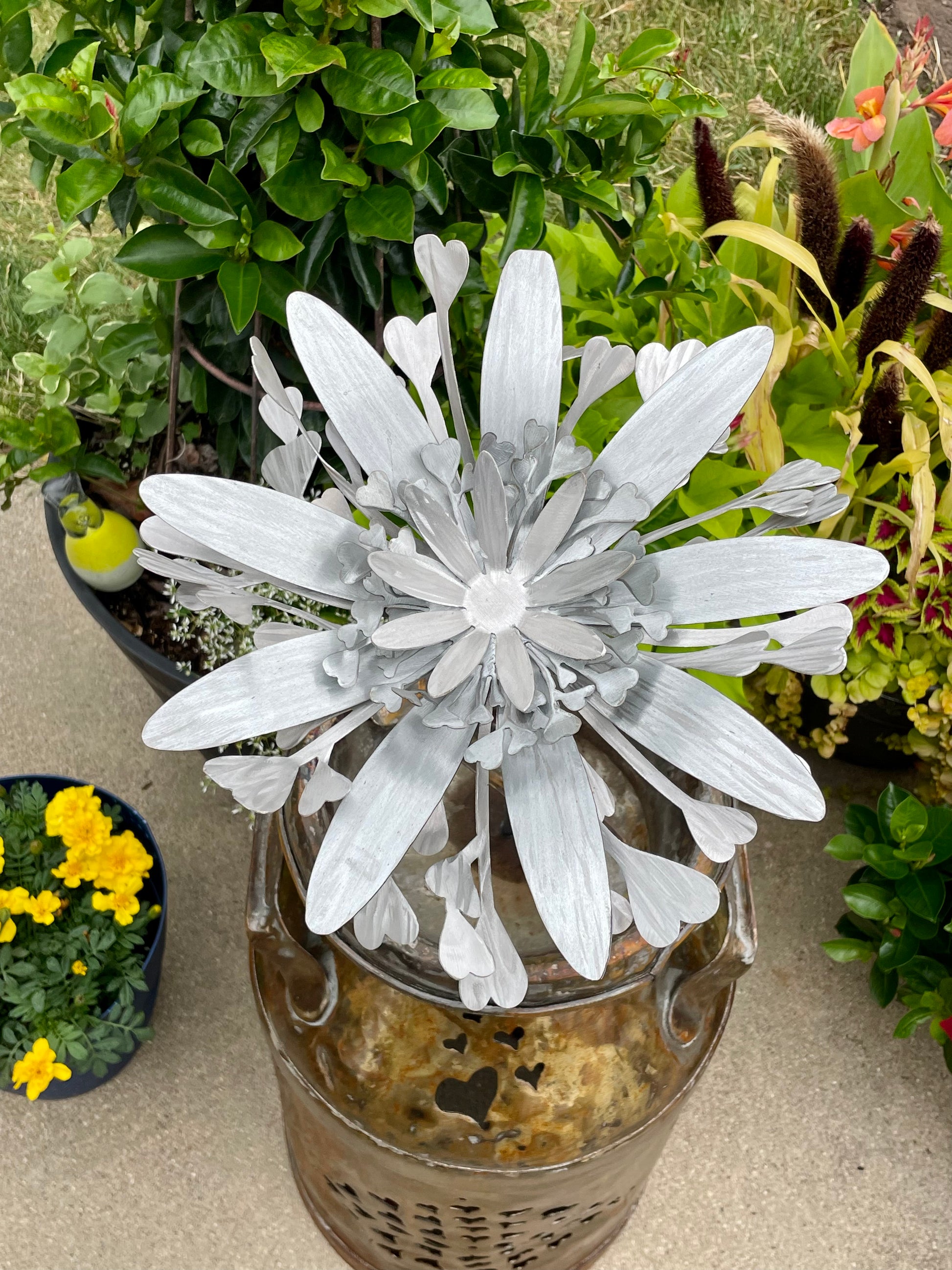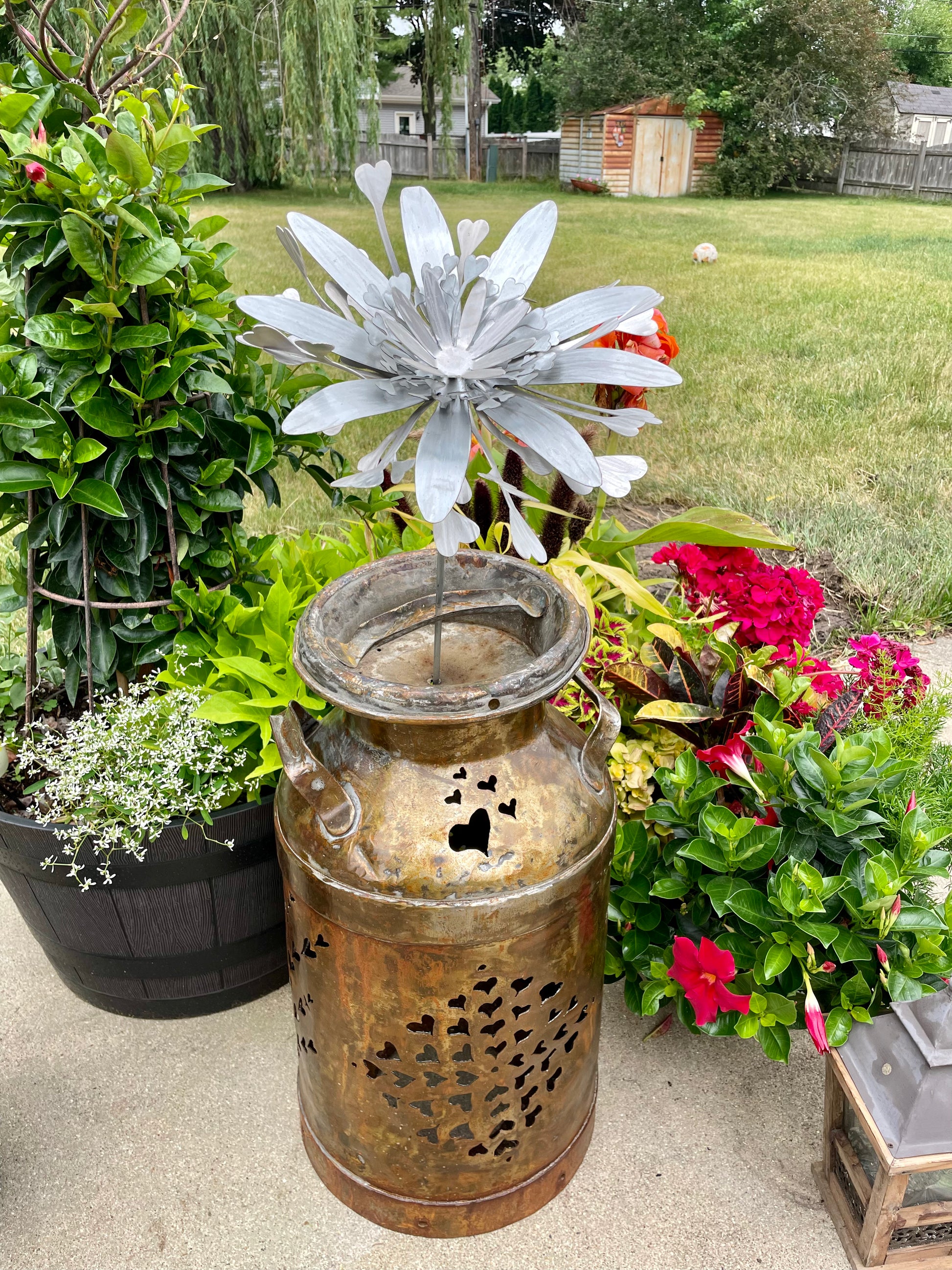 A heart flower springs out of the center of the can. The flower is created from four layers of aluminum measuring approximately 40” tall x 11” wide and weighing .65 lbs. Because it’s made from aluminum, the flower will not develop a rusty patina.