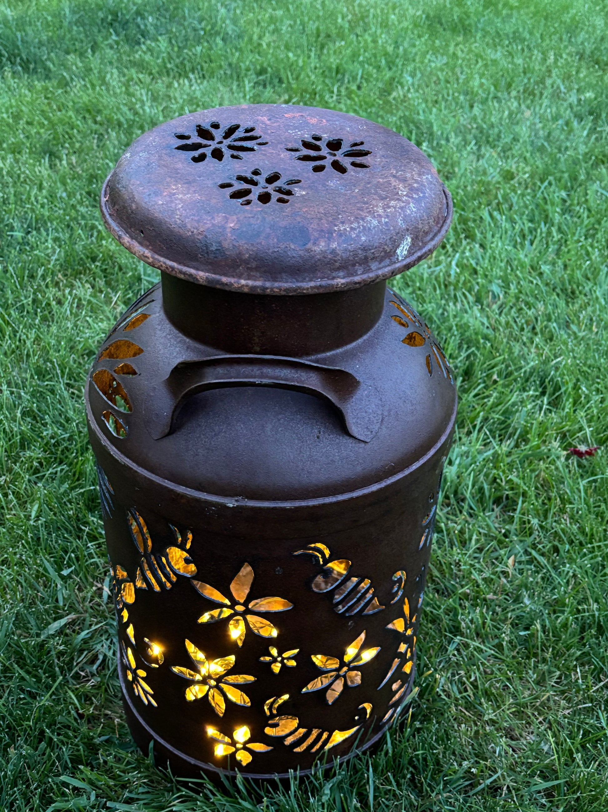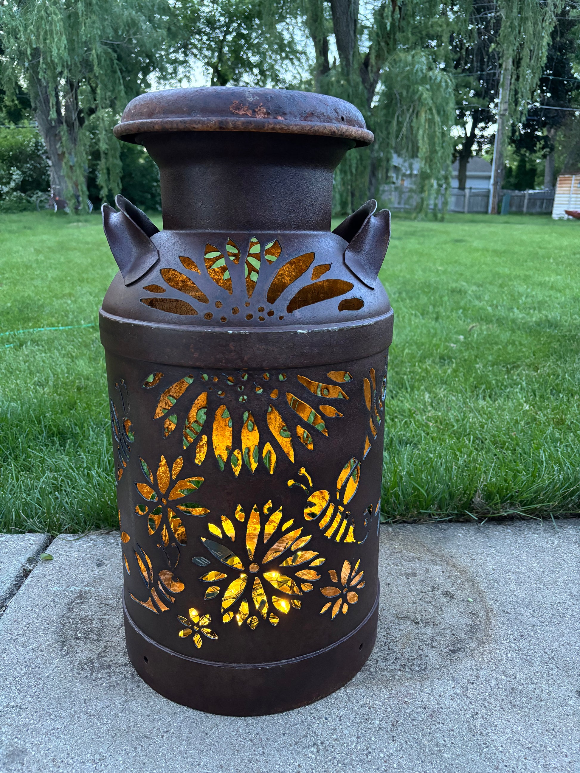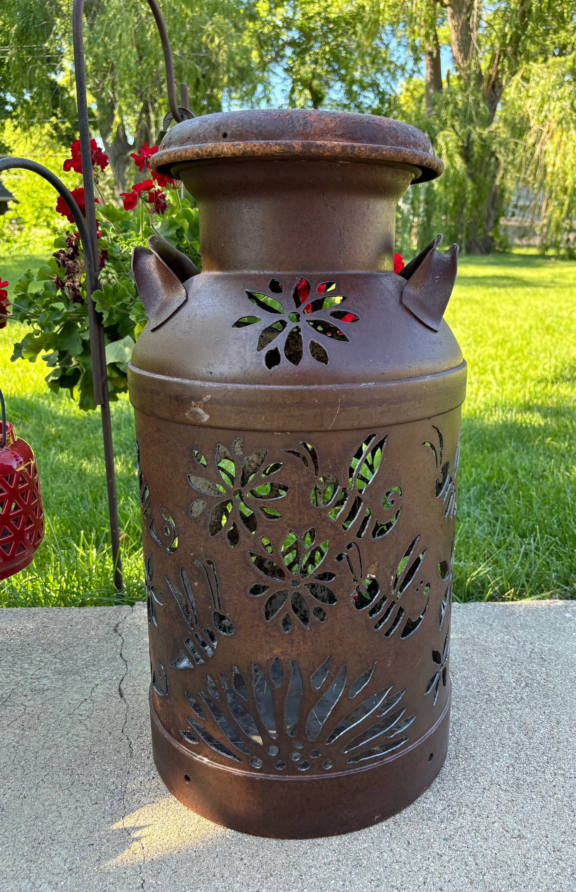 Brighten up your favorite spot with this intricately hand-cut vintage milk can displaying a flower and bee design.
