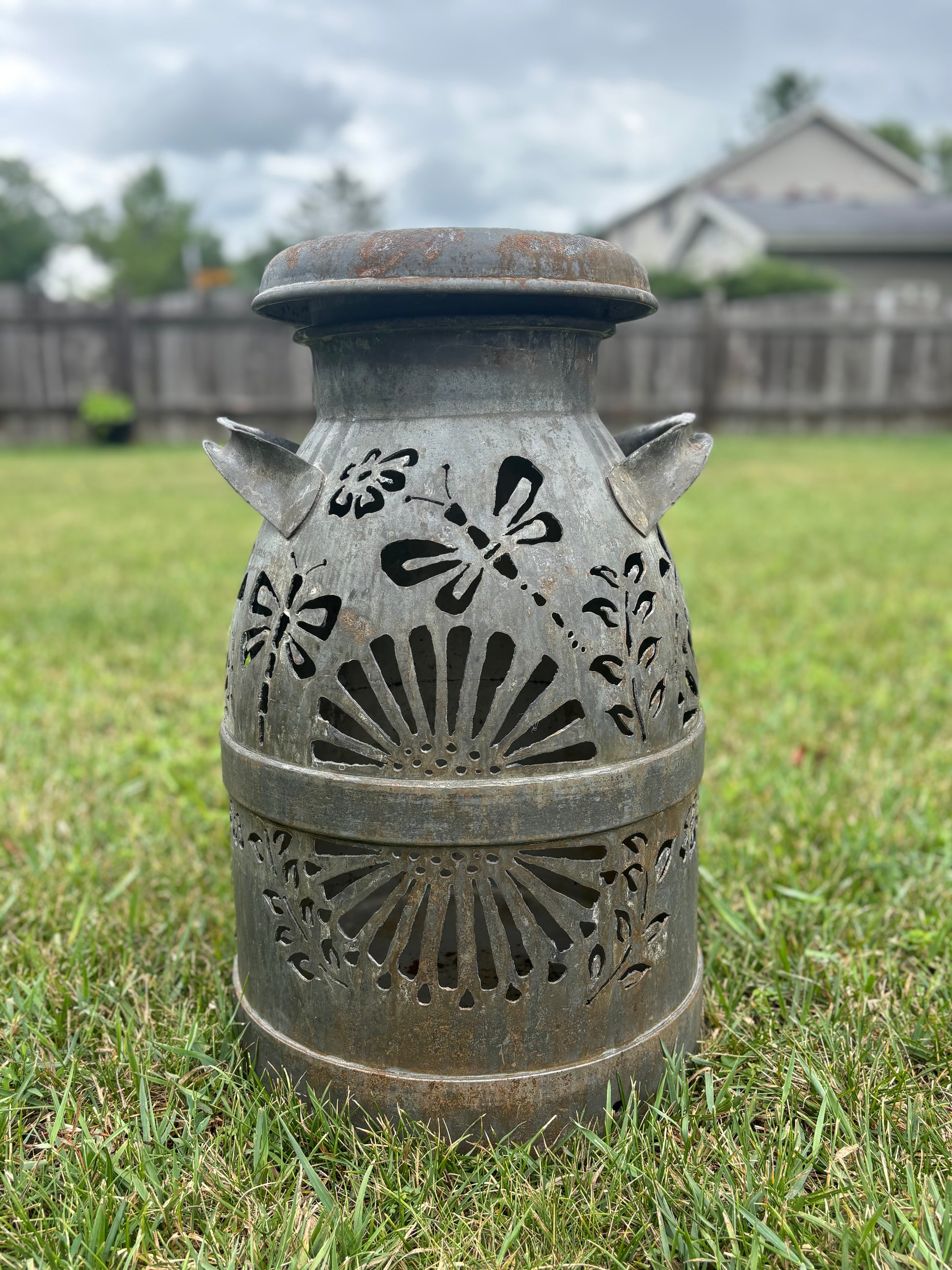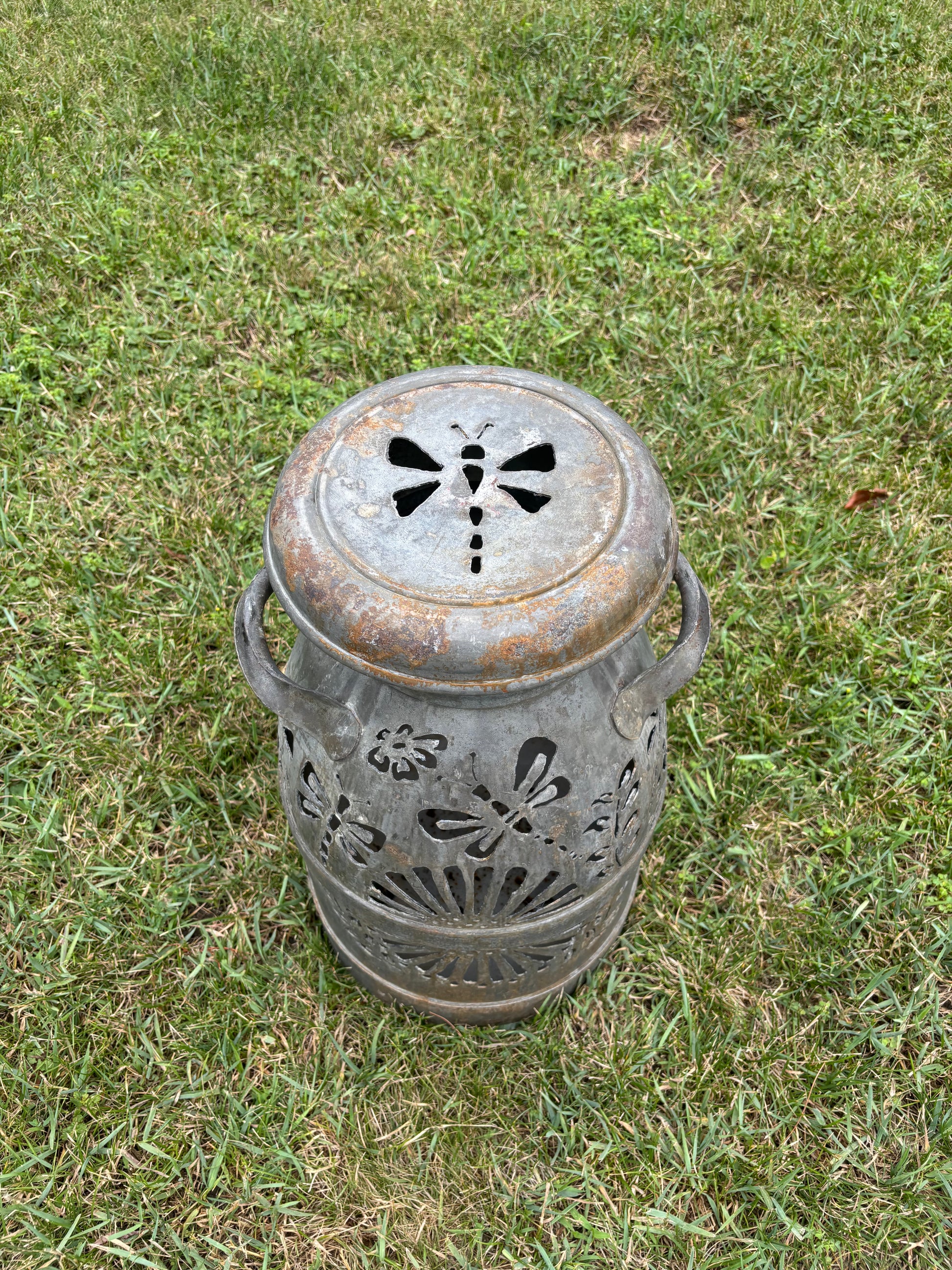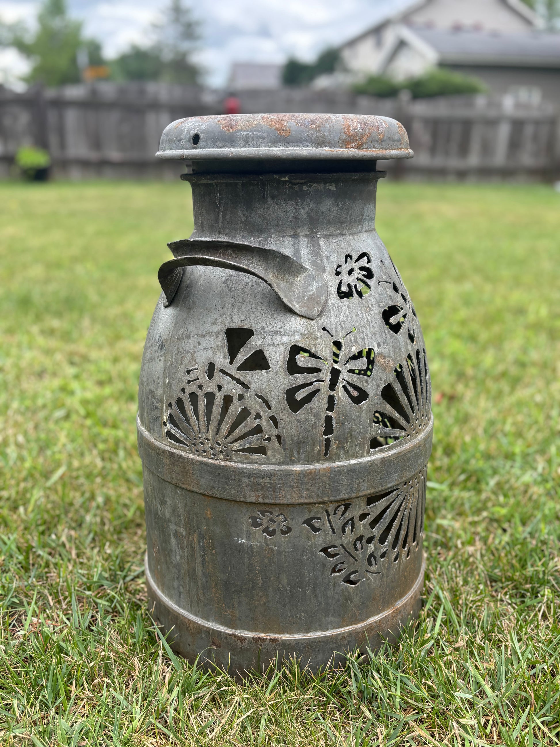Brighten up your favorite spot with this intricately hand-cut vintage milk can displaying a dragonfly and bee design.