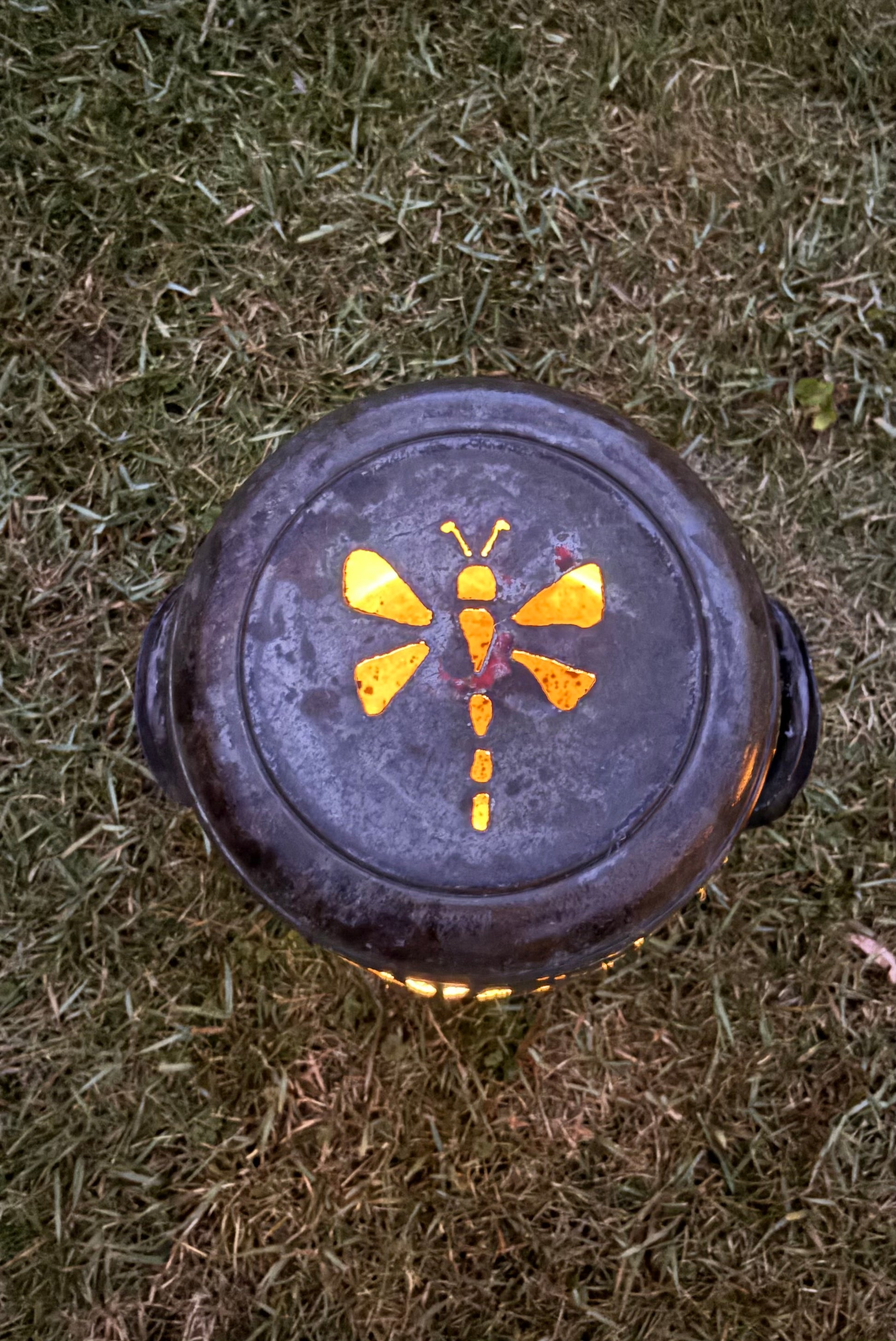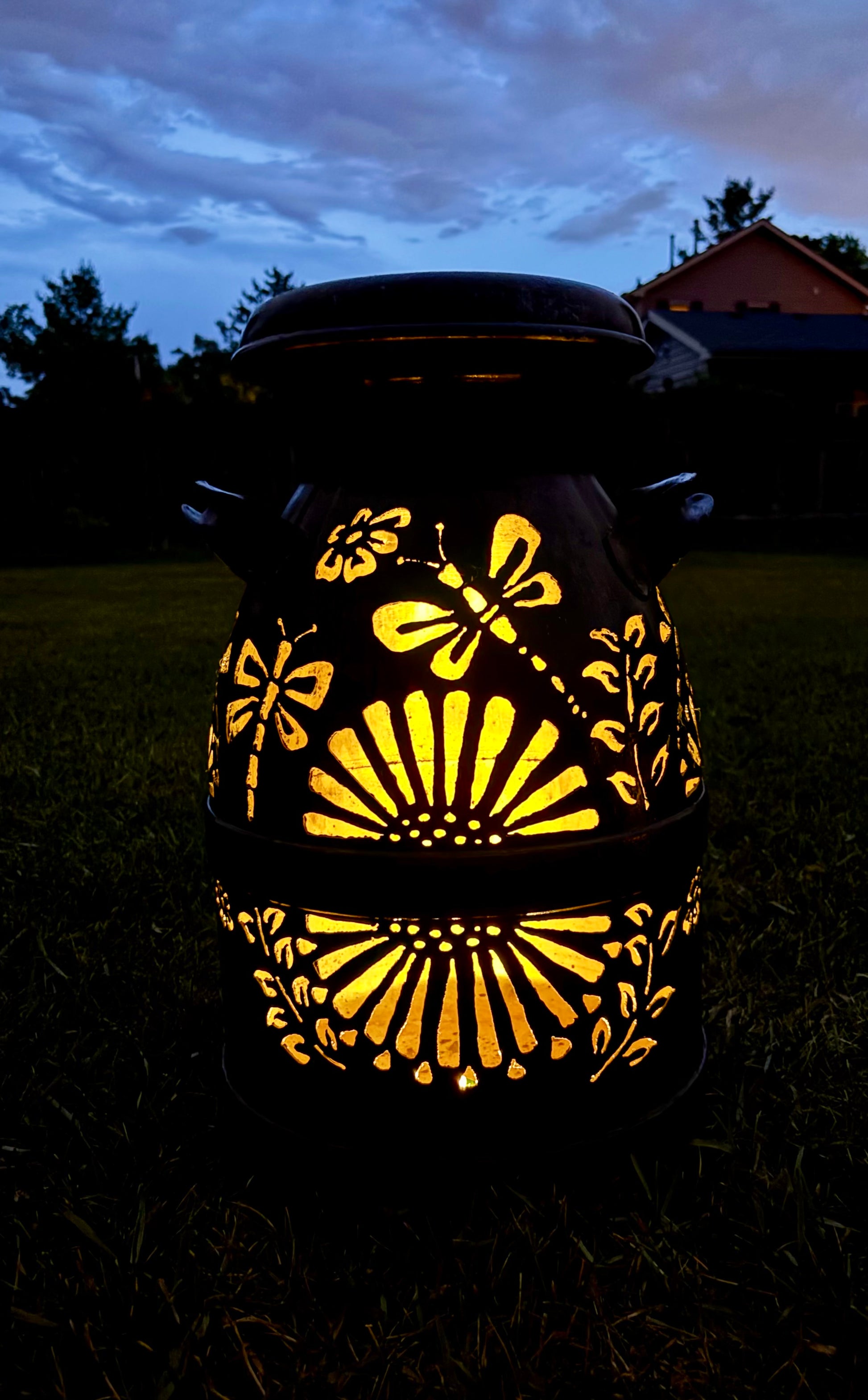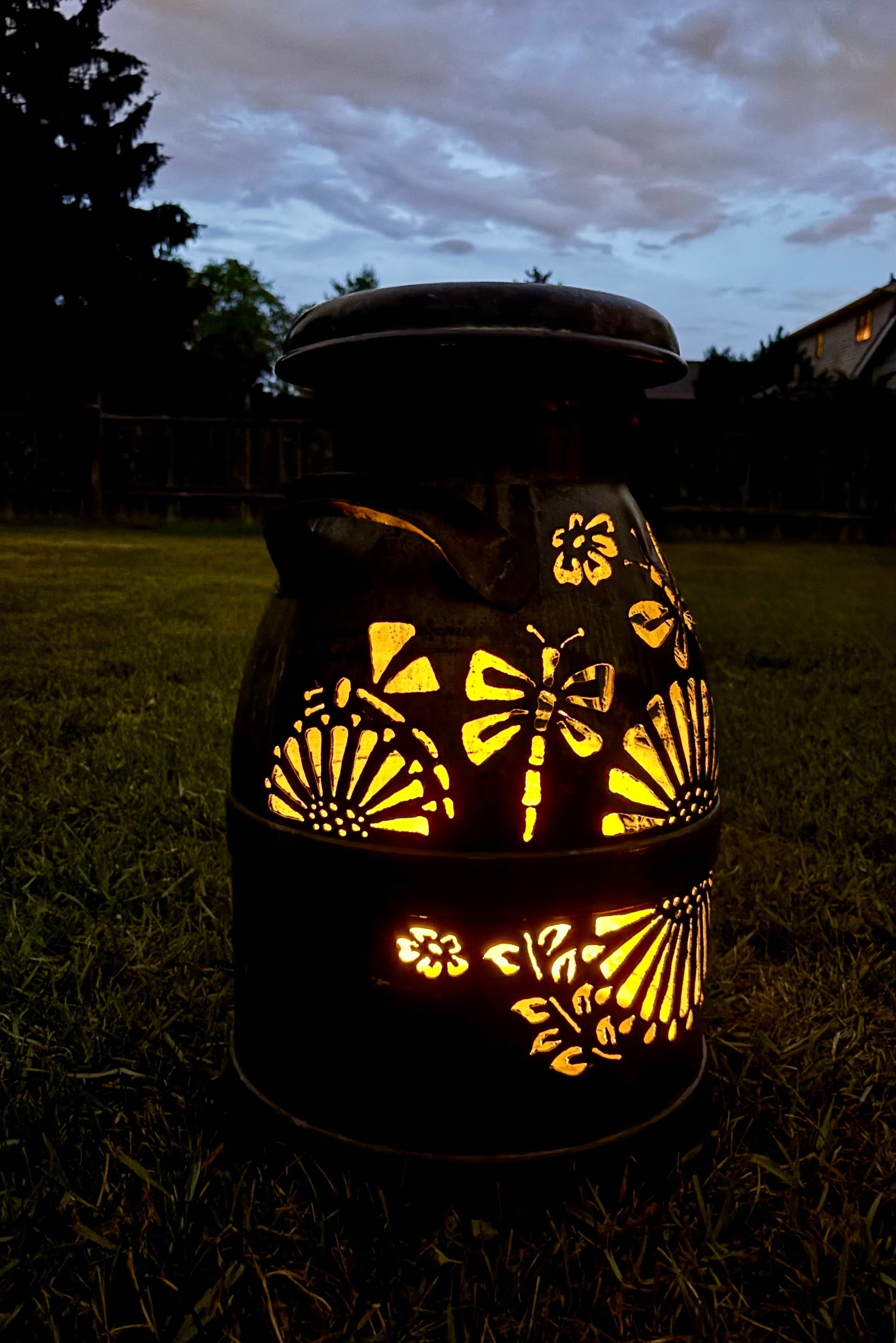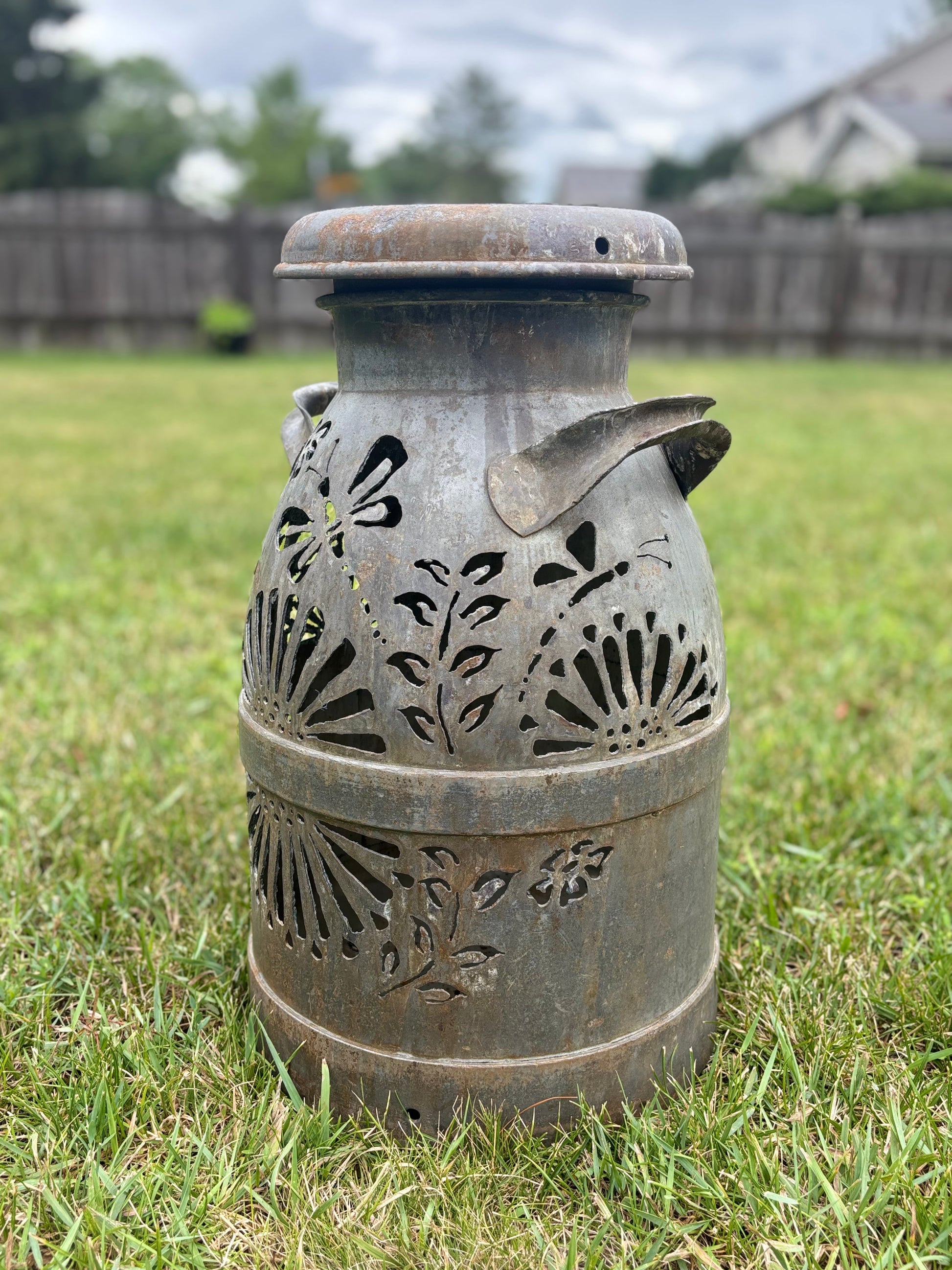 Brighten up your favorite spot with this intricately hand-cut vintage milk can displaying a dragonfly and bee design.