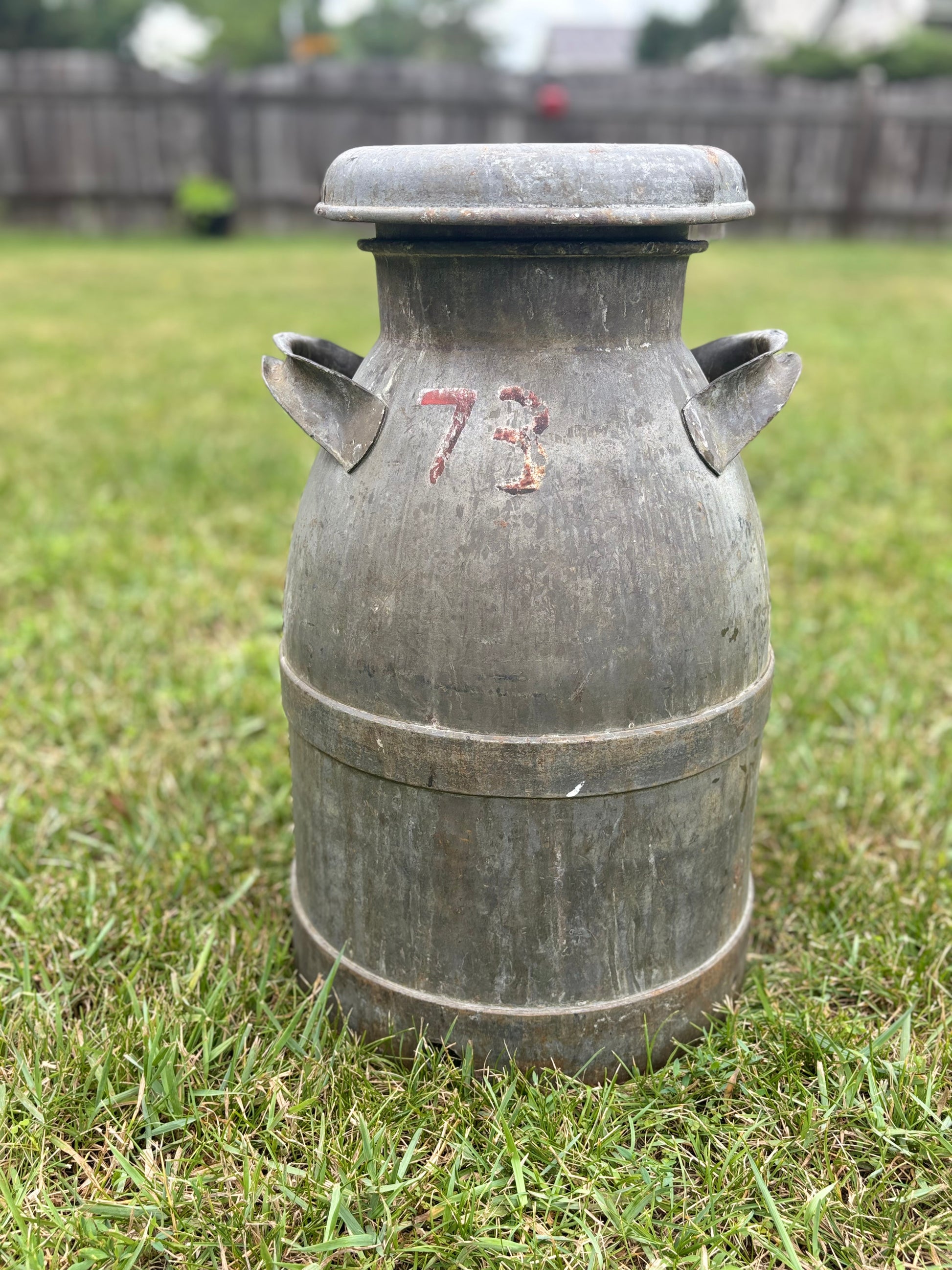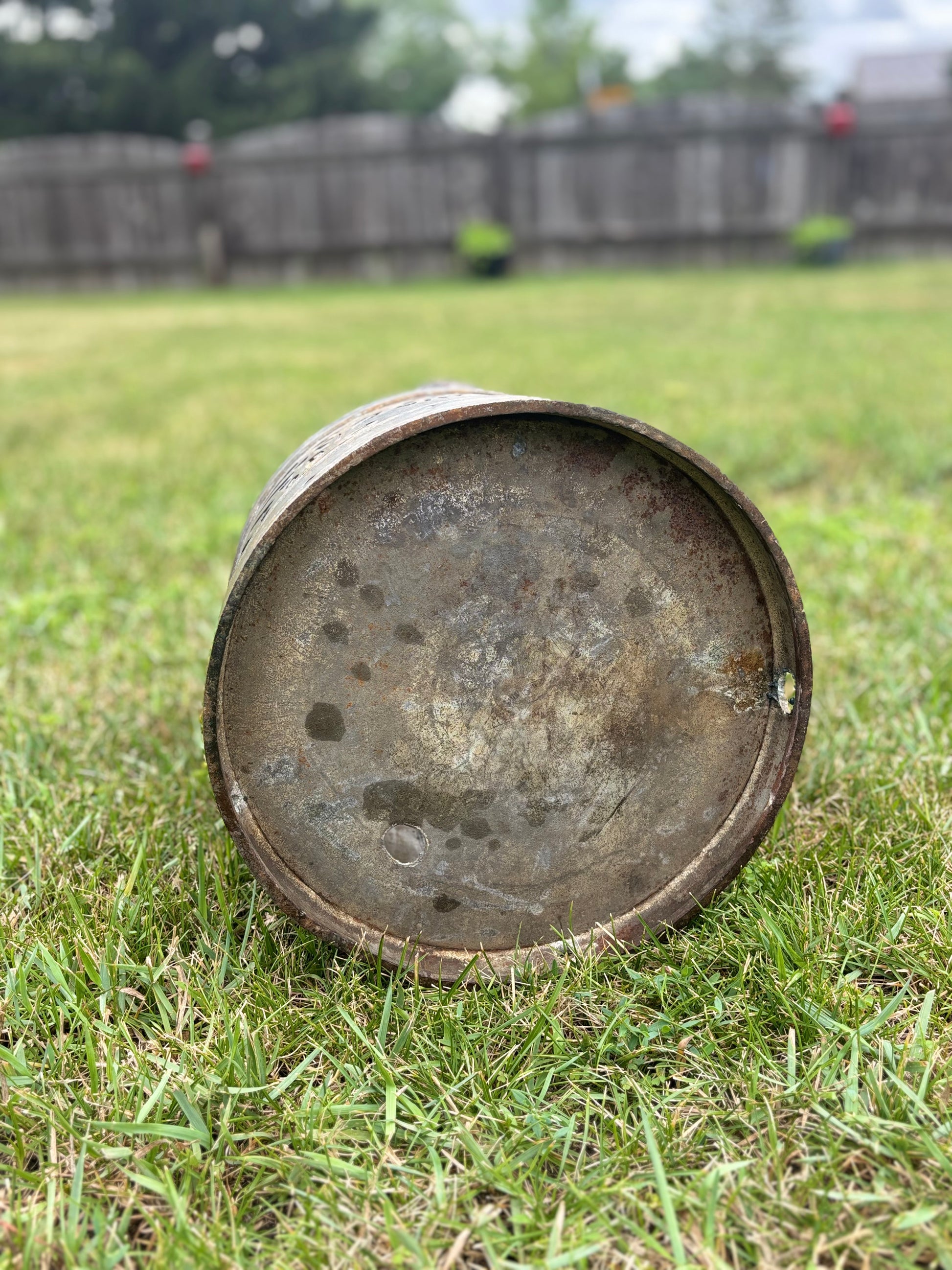 Measuring approximately 22" tall x 13" wide and weighing approximately 24 lbs. This can has never been painted, and the original metal is in great shape with some surface rust and scratches. It will continue to oxidize and change color as it’s exposed to the elements.