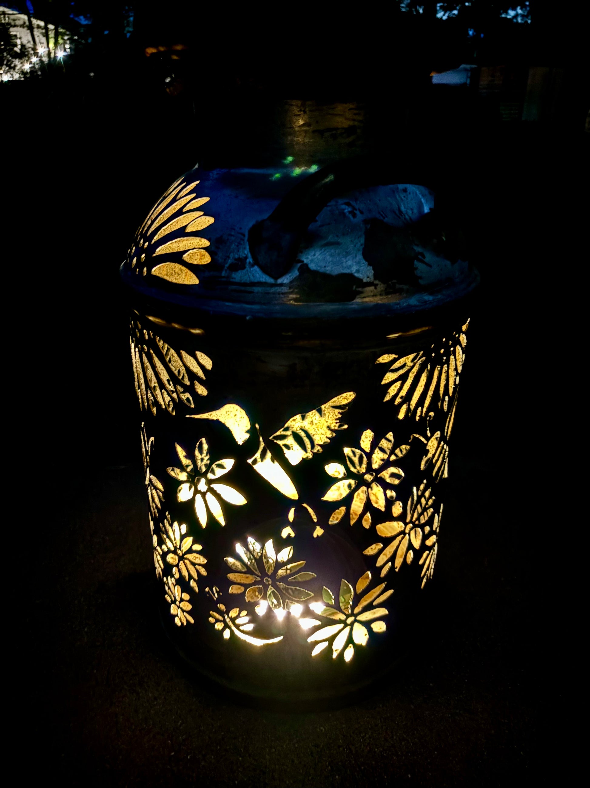 Brighten up your favorite spot with this intricately hand-cut vintage milk can displaying a hummingbird, bees, dragonflies, and flower design.