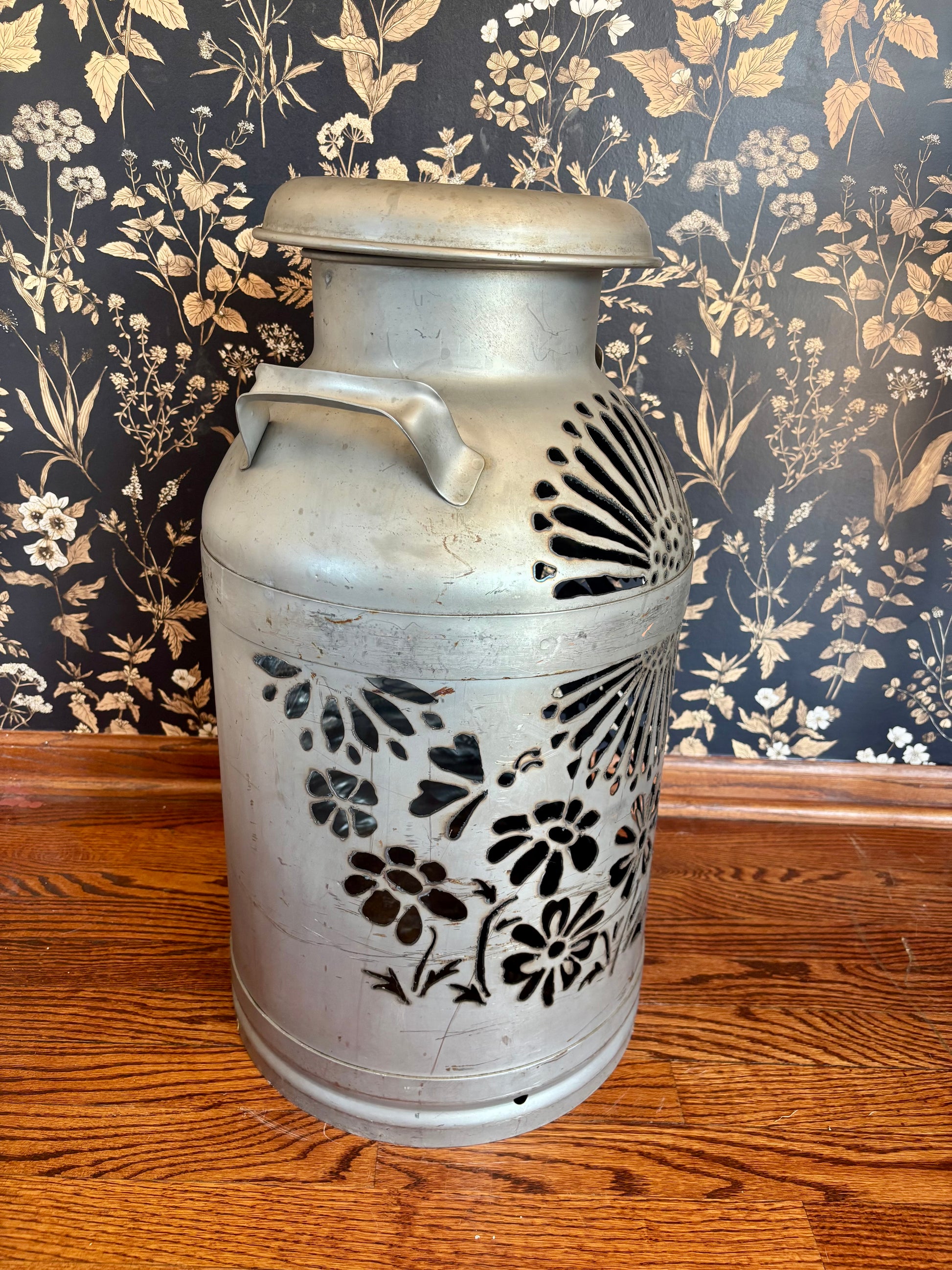 Brighten up your favorite spot with this intricately hand-cut vintage milk can displaying a flower, butterfly, and hummingbird design.